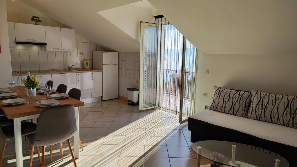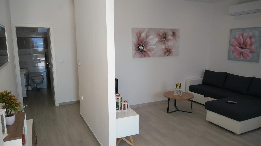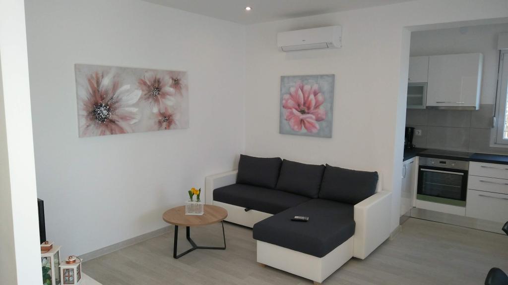 We stayed in apartment A2+2 FROM 08, -15,08,2024. Nice, neat and clean. Identical as in the ad. Modernly decorated. In front of the apartment is a large terrace that has shade throughout the day. A beautiful little lawn, greenery with flowers and a palm tree, it looks really nice. Of course, a view of the sea. The hosts are very kind and nice. Available if you need something, yet unobtrusive. The beach is beautiful and clean, there is both sun and shade. He can choose what he likes. It only took us some time to get used to walking up the hill after returning from the beach, but there are shortcuts, so we mastered that too, The location is great, you can reach Split and Omiš in 15-20 minutes. By bus or car. Recommendation for the restaurant Therapy on the beach.