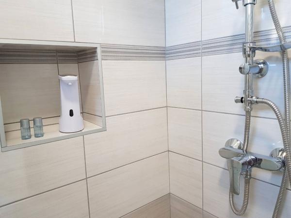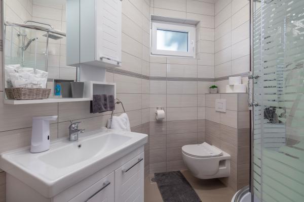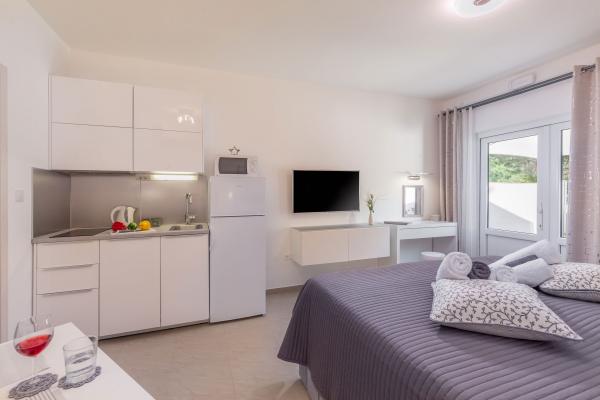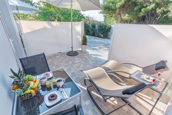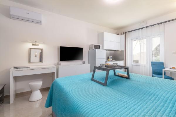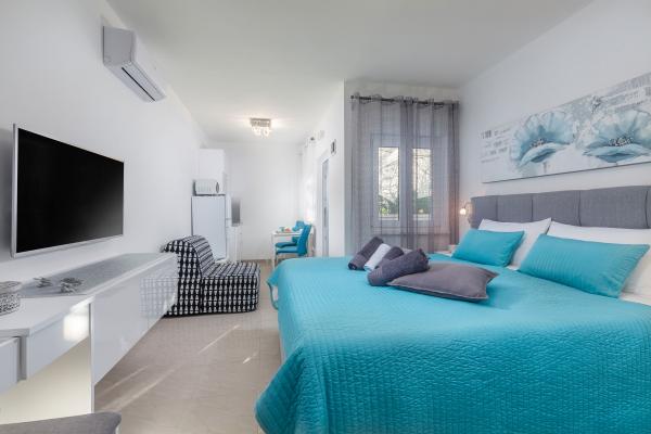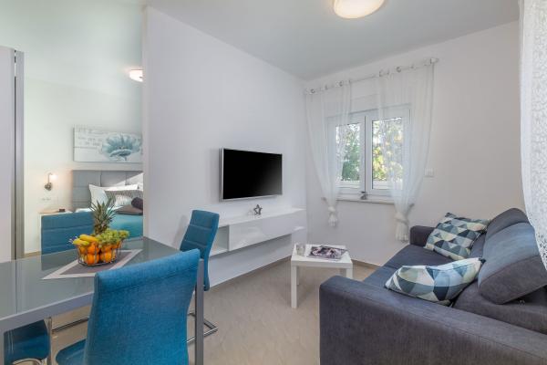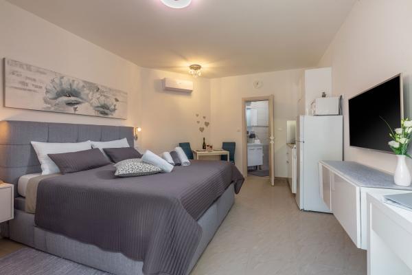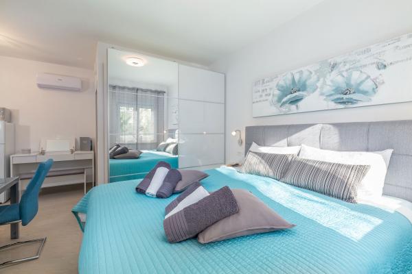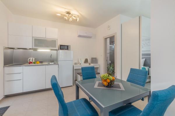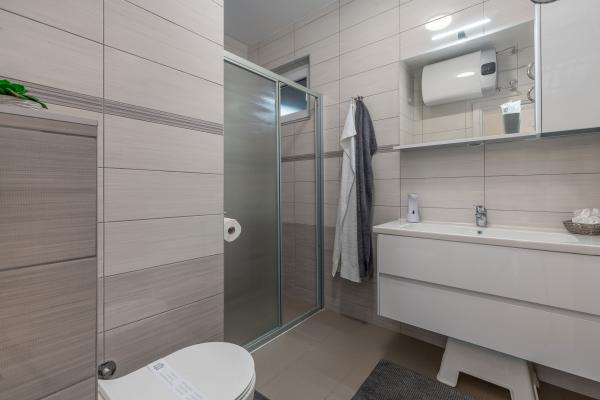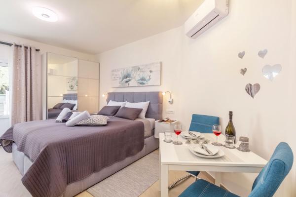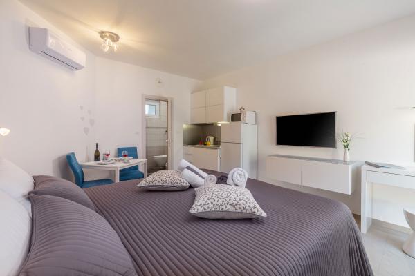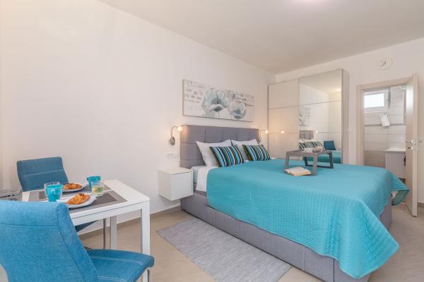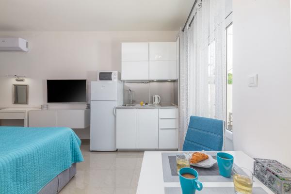 Residential tax is included in price.The kitchen is fully equipped with all accessories, dishwasher, 2-pane glass ceramic plate, freezer and fridge. Each apartment has a table and chairs for dining inside and on the terrace. We are very proud to offer beds of very large dimensions of 190x210 with extra quality mattresses and quality bedding, USB charging sockets are next to the bed. Lights have ability to change color and have bluetooth speaker for listening music from mobile phone. Great WI-FI and big screen Android TV with variety of programs from Internet or satelite TV and free Netflix service. Each apartment has a make-up table and chair, but it can be used as a work desk. The bathrooms are equipped with floor mats, towels, toilet paper, hair dryer and First aid box.