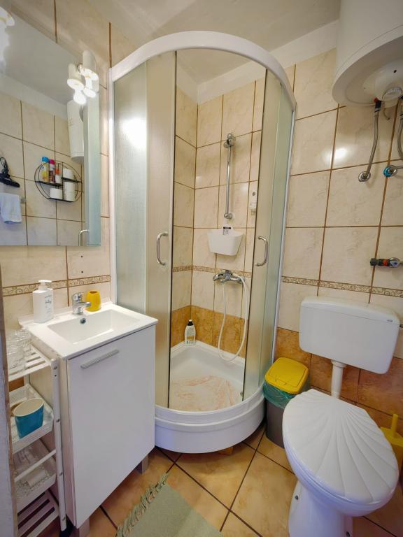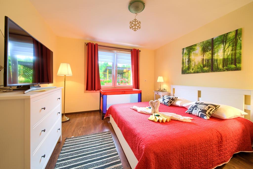 Residential tax is included in price.App. 2 2 is located on the ground floor and occupies an area of 55 m2. It consists of a hallway at the entrance, a fully equipped kitchen that you can use as a living room, bedroom and bathroom. In the bedroom there is a double bed and an extra bed. The couch in the kitchen / living room can also be used as an extra bed for two people. The spacious bathroom is equipped with a shower and a washing machine. App. 2 1 is located on the ground floor of the house with separate entrance consisting of a three-bed room kitchen with living room where there is a sofa used as an extra bed and a bathroom. Guests have at their disposal a barbeque with bbq, bicycles, winter garden furniture, free internet, and private parking space. There is also a welcome drink.