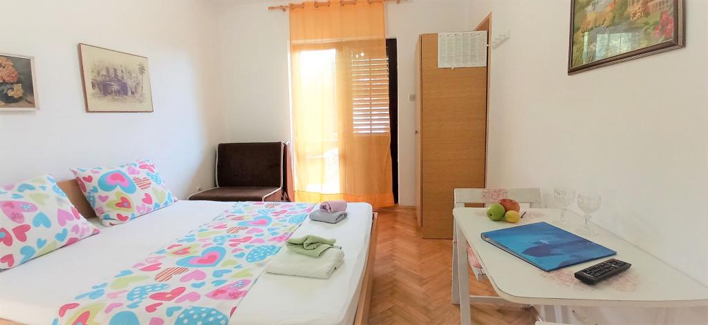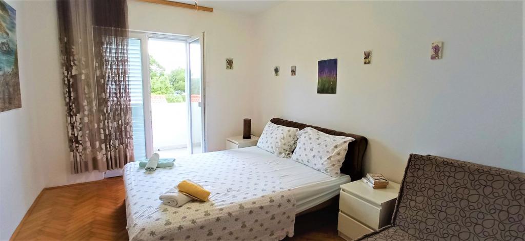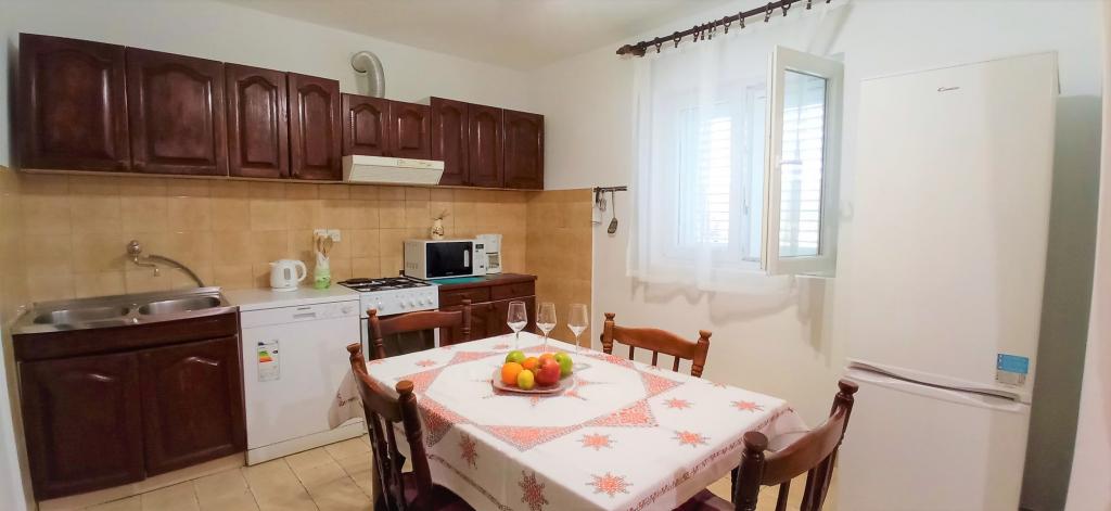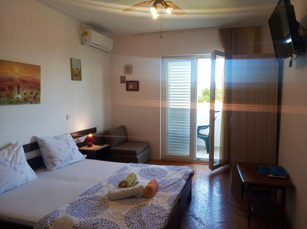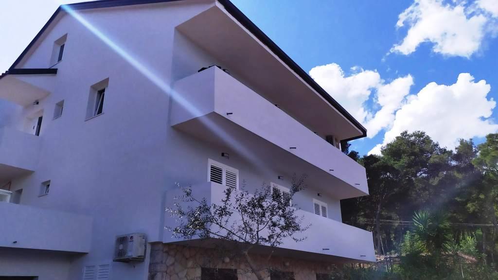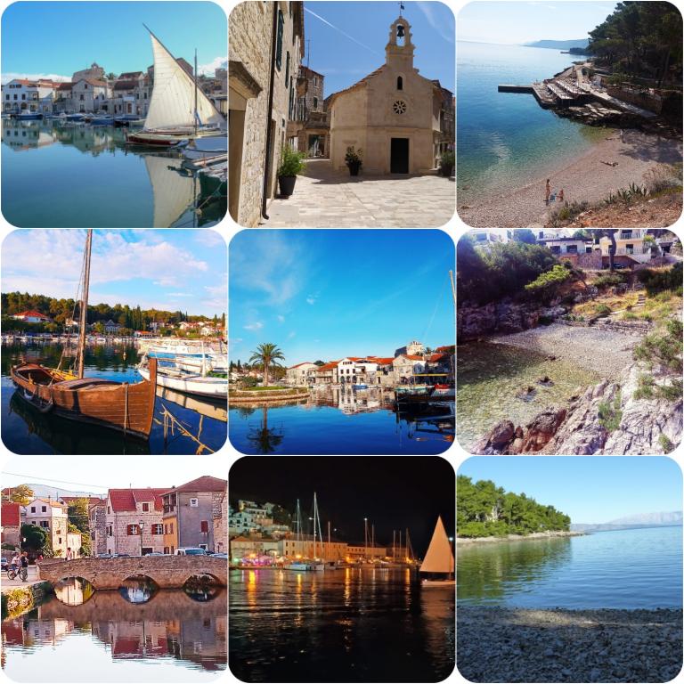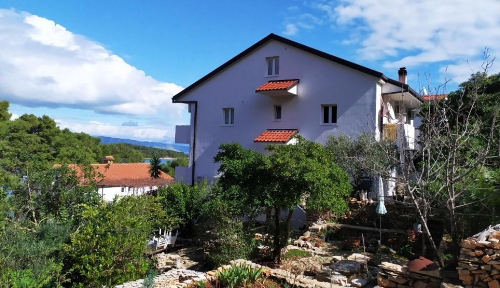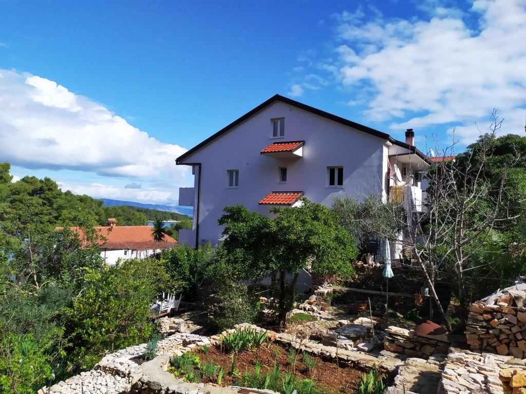 The house is situated in a quiet part of Jelsa near sea and next to a pine forest. The sea is about 70 m from the house, and several pebble beaches and one sandy beach is only a few minutes from home. In our house we offer: 3 studio apartments. Each studio apartment has a bedroom, bathroom, kitchenette and a table with chairs in front of the apartment and next to the garden. One studio apartment has a large terrace. 2 rooms. Each has its own toilet, kitchen and balcony with table and chairs and sea view. It is also possible to rent both rooms as an apartment because they have one common entrance which is separated from the other apartments. Apartment with 2 bedrooms, 2 bathrooms, living room, kitchen, dining room, balcony with sea view and terrace with table and chairs in front of the apartment. There is an extra bed in one room and sofa in the living room which can be turned into a bed for two people.