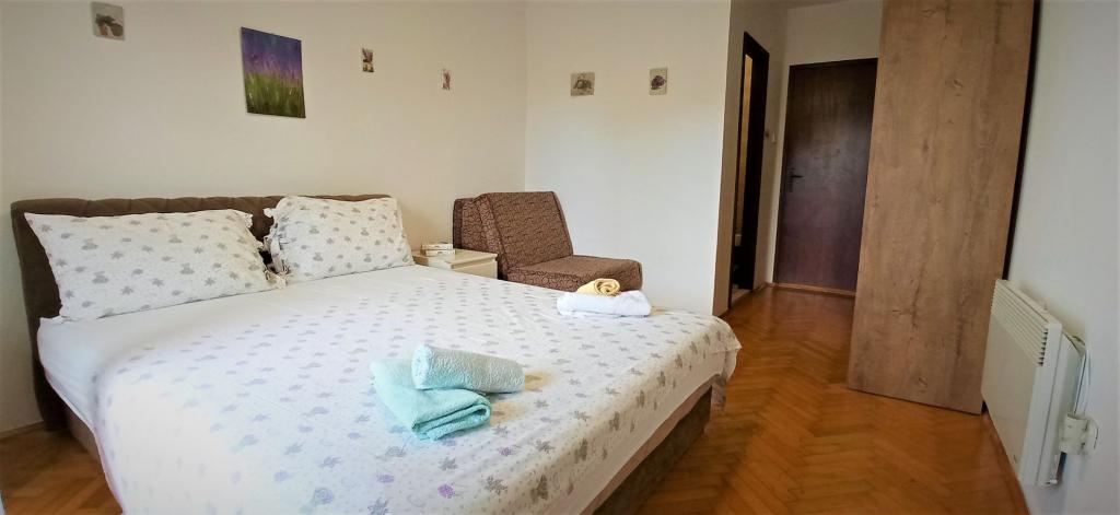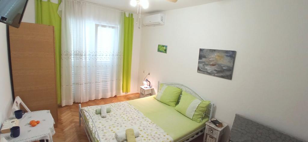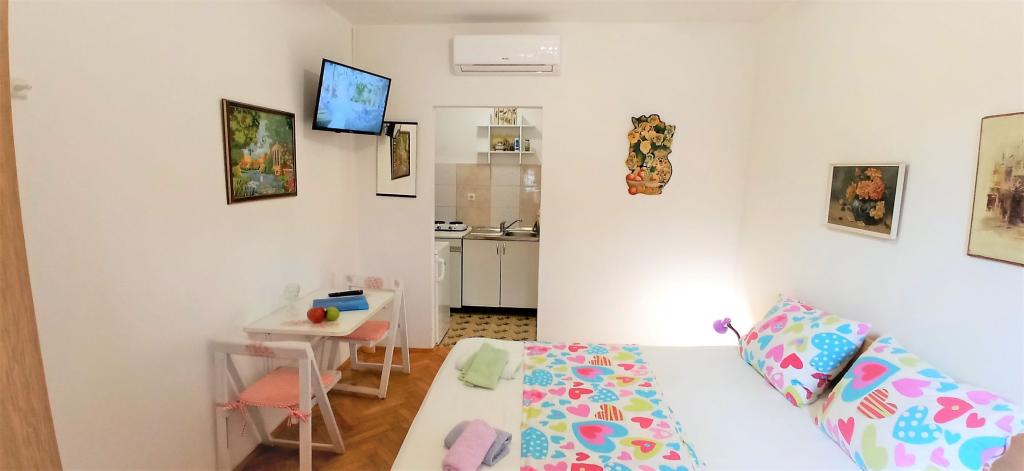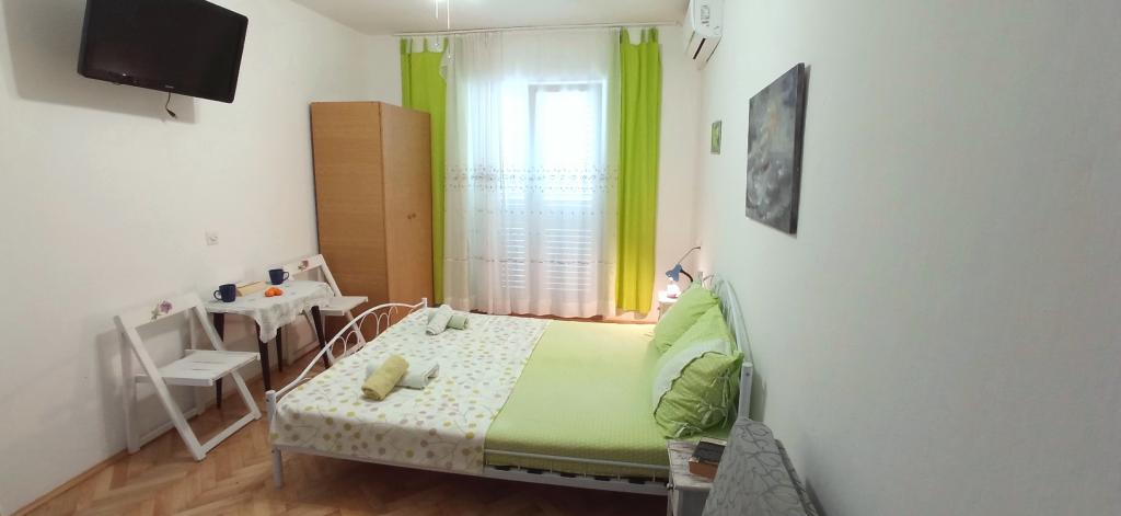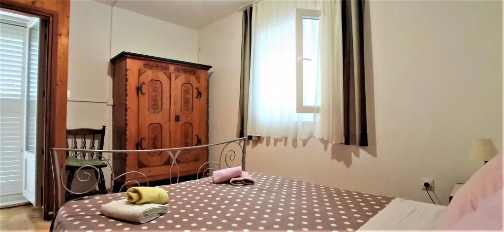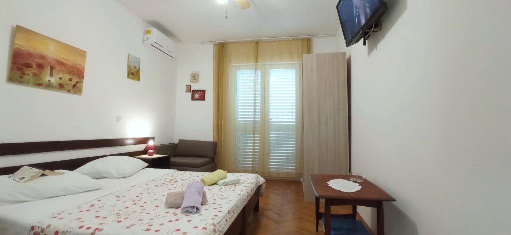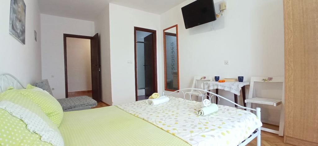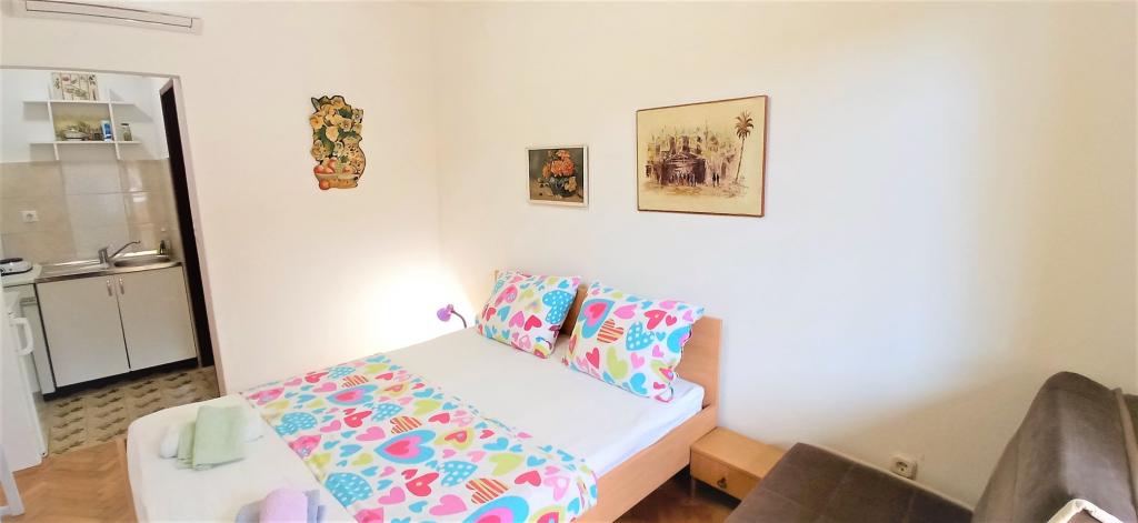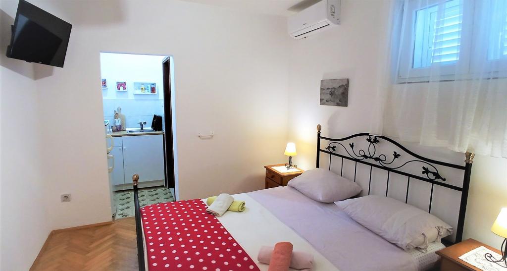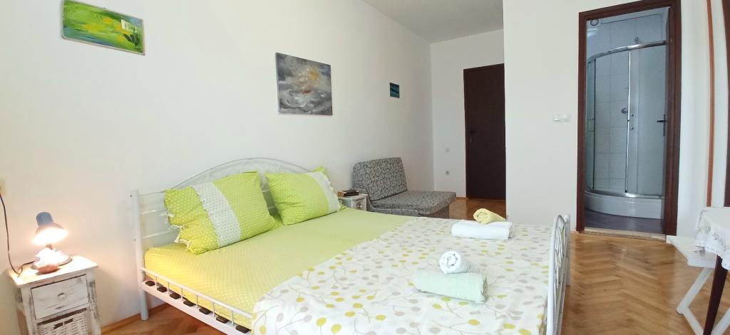 The house is situated in a quiet part of Jelsa near sea and next to a pine forest. The sea is about 70 m from the house, and several pebble beaches and one sandy beach is only a few minutes from home. In our house we offer: 3 studio apartments. Each studio apartment has a bedroom, bathroom, kitchenette and a table with chairs in front of the apartment and next to the garden. One studio apartment has a large terrace. 2 rooms. Each has its own toilet, kitchen and balcony with table and chairs and sea view. It is also possible to rent both rooms as an apartment because they have one common entrance which is separated from the other apartments. Apartment with 2 bedrooms, 2 bathrooms, living room, kitchen, dining room, balcony with sea view and terrace with table and chairs in front of the apartment. There is an extra bed in one room and sofa in the living room which can be turned into a bed for two people.