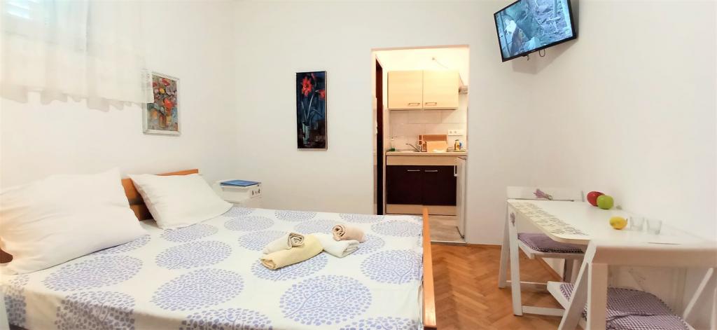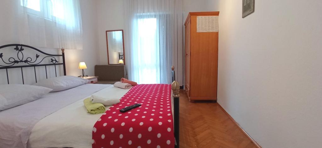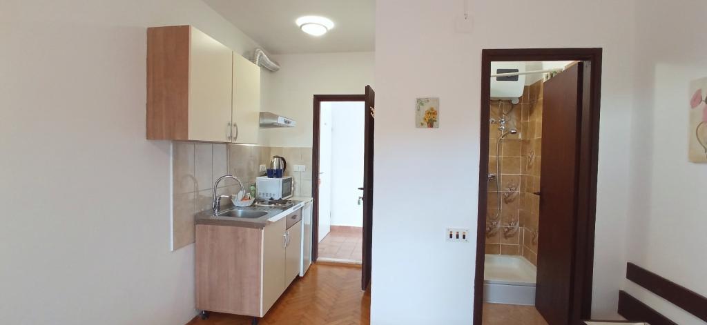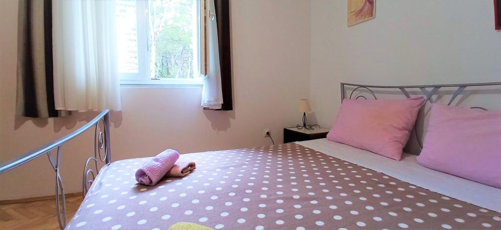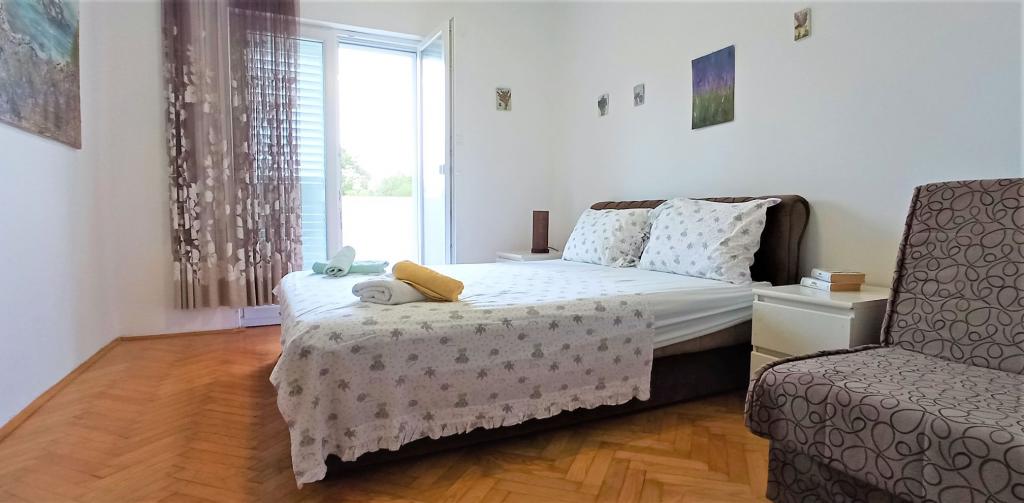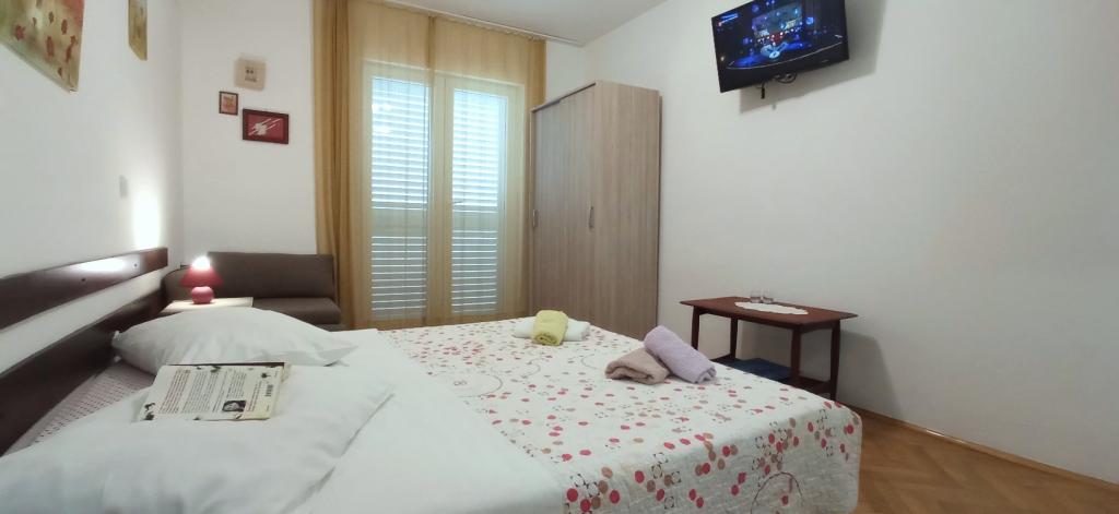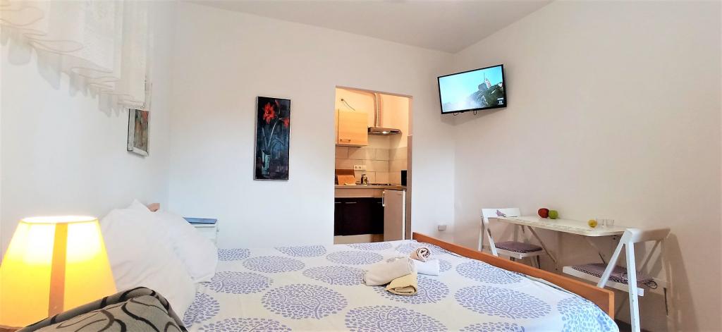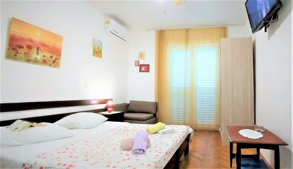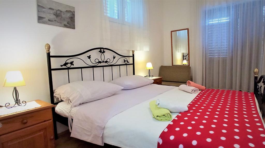 The house is situated in a quiet part of Jelsa near sea and next to a pine forest. The sea is about 70 m from the house, and several pebble beaches and one sandy beach is only a few minutes from home. In our house we offer: 3 studio apartments. Each studio apartment has a bedroom, bathroom, kitchenette and a table with chairs in front of the apartment and next to the garden. One studio apartment has a large terrace. 2 rooms. Each has its own toilet, kitchen and balcony with table and chairs and sea view. It is also possible to rent both rooms as an apartment because they have one common entrance which is separated from the other apartments. Apartment with 2 bedrooms, 2 bathrooms, living room, kitchen, dining room, balcony with sea view and terrace with table and chairs in front of the apartment. There is an extra bed in one room and sofa in the living room which can be turned into a bed for two people.
