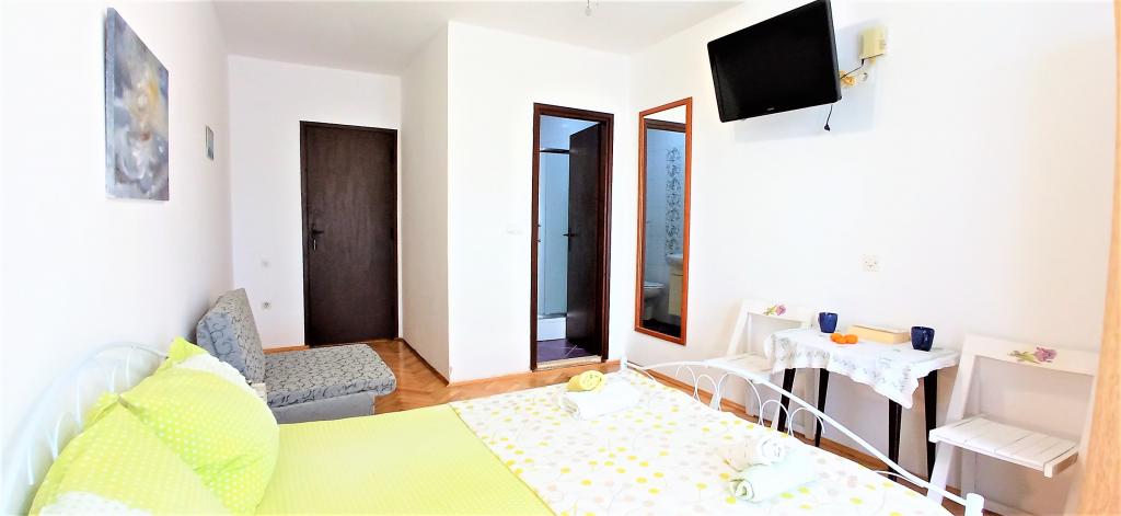 Nicely decorated, and fully equipped rooms. Really close to beaches. Owner says that distance to the sea is 80 meters, but it is less