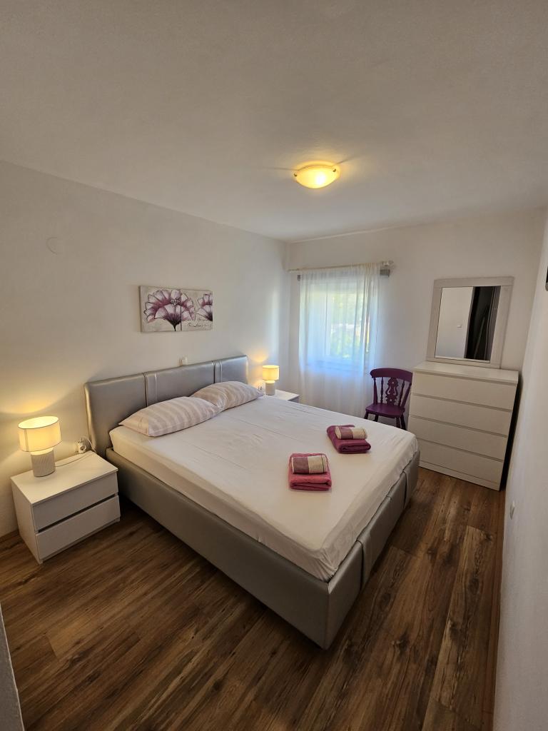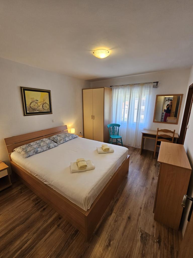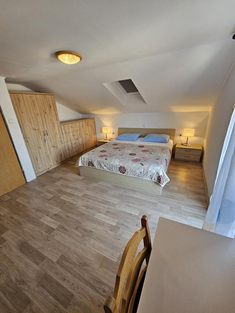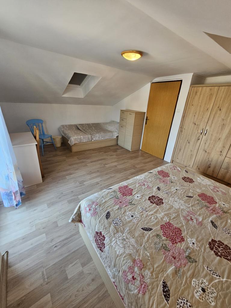 Family house with a fully equipped three-bedroom apartment on the second floor. Beautiful panoramic sea view. The apartment has a covered terrace accessed from the living room, and on the same floor there are two more bedrooms with bathrooms (entrance from the bedroom). Upstairs in the attic is the third bedroom from which you can access an uncovered terrace also with a sea view. Next to the room is a separate bathroom with a washing machine. The first beach is a 5-minute walk from the house, the other beaches are 100-200m away and more. Not far from the house is a promenade by the sea, a children's playground, a tennis court, a basketball court, a bowling alley, boat rental, bicycles, mopeds. Grocery store, cafe, exchange office, massage parlor, restaurant, pizzeria, small harbor. Family house with an offer for a peaceful and beautiful vacation.