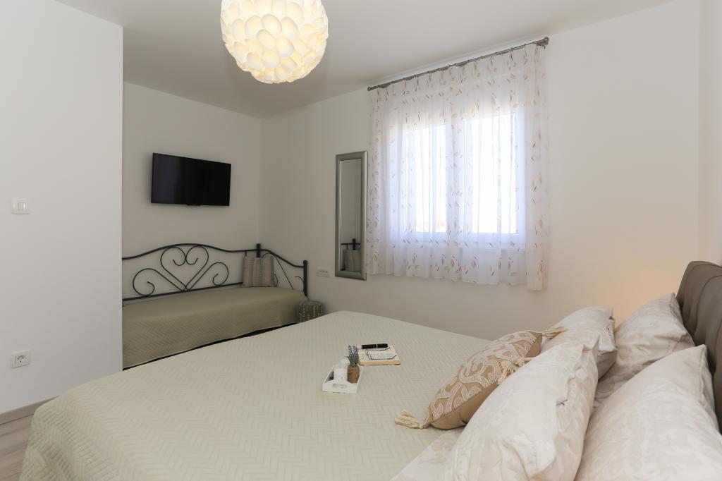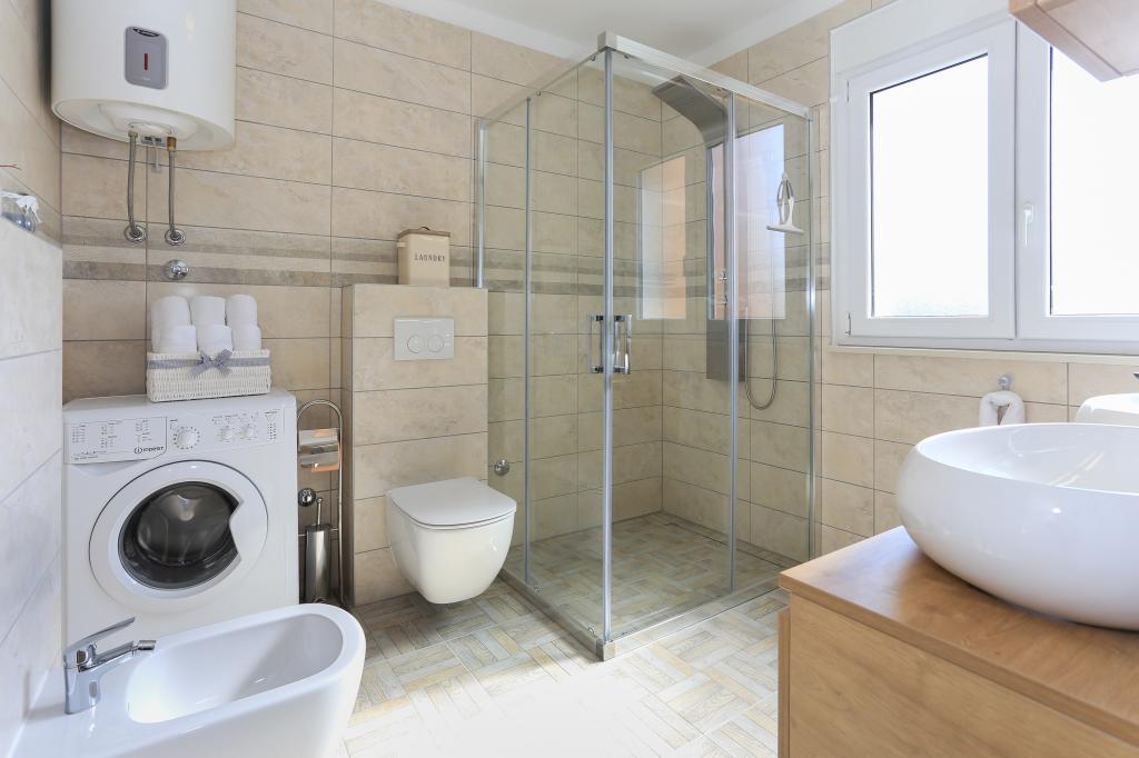 This completely new apartment is located in the center of Kastel Gomilica and is fully equipped for your comfortable stay. Just a few minutes away is Marina Kaštela, a bus station (100 meters away) with a direct line to Split, the airport, as well as a line to Trogir. Also, just 400m away is the train station with a line that takes you directly to the center of Split (City Port and Bus Station), which is great for visiting the surrounding islands. A few minutes walk from the apartment is a pebble beach with bars and additional amenities (trampoline, swings, etc.). Our guest has a private entrance to their own parking lot, so you have complete privacy and security. The apartment consists of a large living room connected to the kitchen and dining room (35 m2). It has 3 bedrooms (two with double beds - 1.6x2. 0m), while one room has a large double bed (1.8x2. 0m) and one single bed (0.9x2. 0m). The apartment also includes 2 complete bathrooms with showers. The apartment is on the second floor.