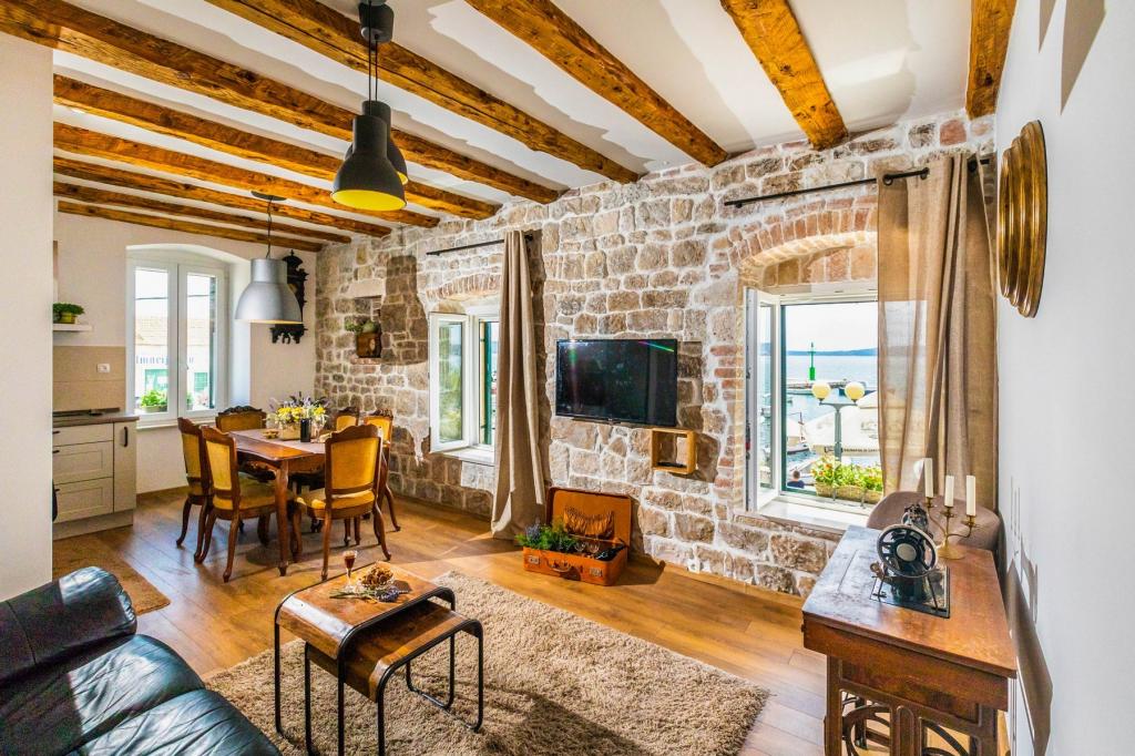 Residential tax is included in price.We have taken care to ensure that guests have every comfort during their stay so the kitchen is fully equipped, dining area is comfortable while bathroom is fitted with a walk-in shower. The apartment has a superb seafront location in the heart of a friendly, quiet Mediterranean village with all conveniences close by, such as local green and fish market, bakery, shops, cafes and several good restaurants. Also, guests are can spend relaxing day at the local beach less than a minute away or exploring nearby UNESCO-listed sites Split and Trogir, ancient Salona ruins, Klis fortress etc. Family Kapitanović From the pier of the nearby small port, in the summer season there is a boat line to the town of Trogir, as well as many stalls with offers