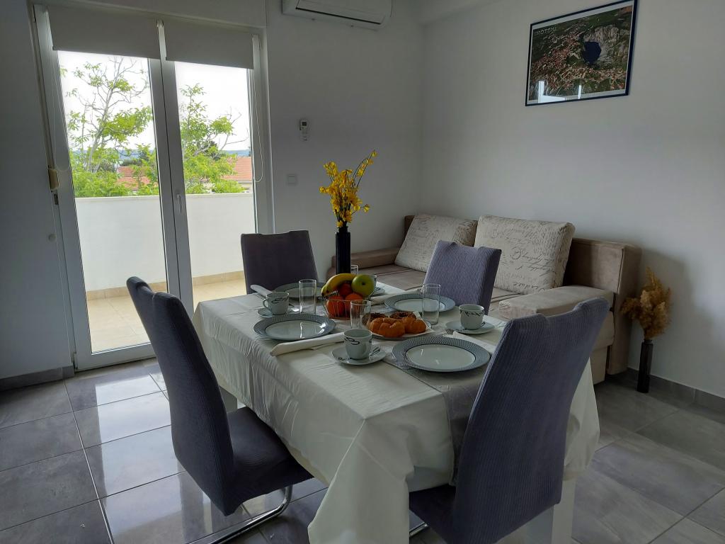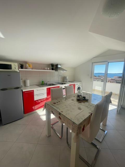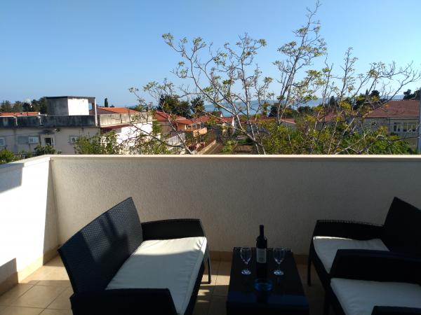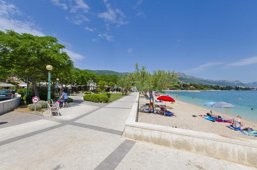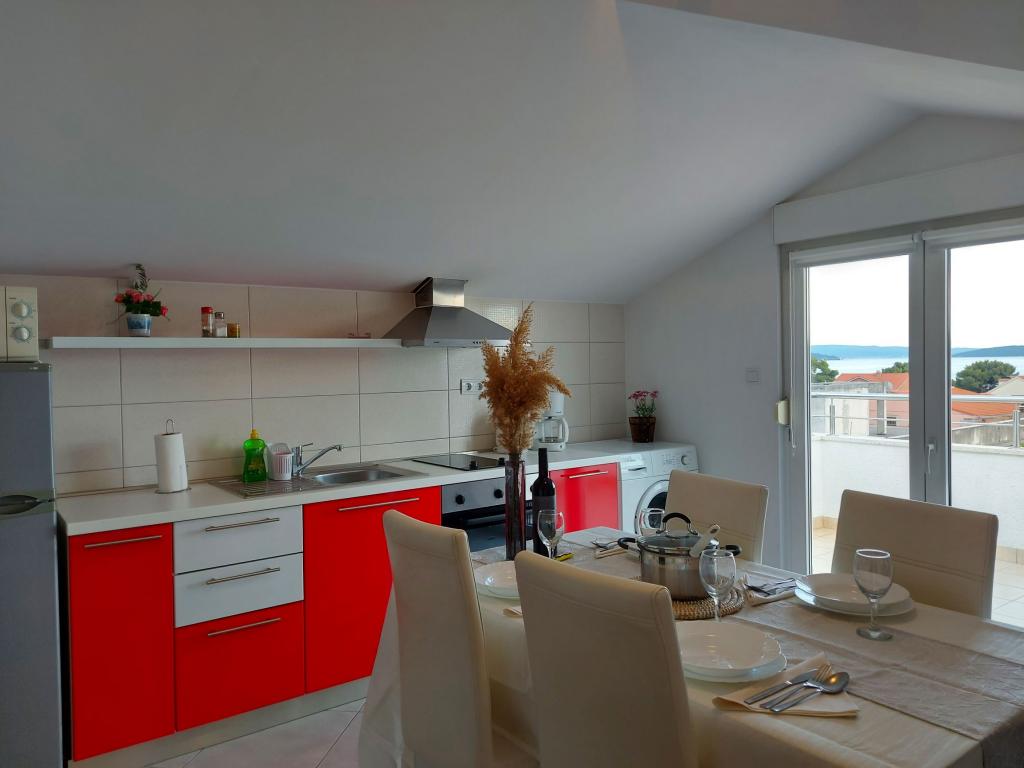 In the house are two apartments, evaluate apt. 1, which is perfect. It has two terraces, one with a sitting area overlooking the sea. The apartment is modern and clean. Air conditioning is not only in the kitchen, but if you leave the door to the room open, so it is enough. Free Wifi. The house stands on the village road, where traffic day and night, but our apartment was directed to the other side, so nothing to disturb us. Not far away is trade. Super is also a swimming pool with sun loungers and shower. The sea is about 200 m, but instead we went a little farther, there was a better entry into the water. The closer the beach were in a sea of larger stones. Otherwise, both pebble beaches. In the vicinity are several restaurants. Along the beach walk to the historic part of town, something for romantics. There are also shops, restaurants, bike rental. On a trip is a short walk to Split and Trogir. Close to Split airport, so planes flew over us, but that we are not even listening. Mr. owner Zoran is very friendly and helpful. Leave us very much. I think the apt. 1 deserves 4 stars. I like to recommend it to everyone :-)