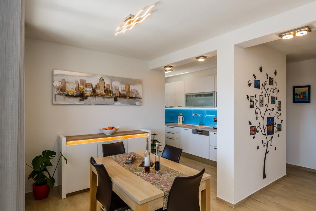 We have been vacationing in Croatia every year for 26 years, but the equipment of this apartment (washing machine, dishwasher, oven, hair dryer, sandwich maker, mixer) and, of course, all the little things, aluminum foil, kitchen towels, and what surprised me was towels, in all quantities, and cold drinks were waiting for us. Wonderful clean apartment and a very helpful and fair host, and the internet worked flawlessly. The proximity to the water is adequate, the view from the shore is wonderful, the water is clean and warm. Naturally, the apartment is furnished with very modern and tasteful furniture. Thank you, Damír