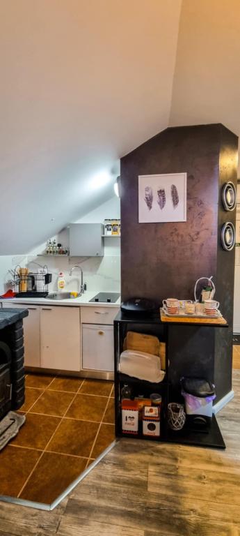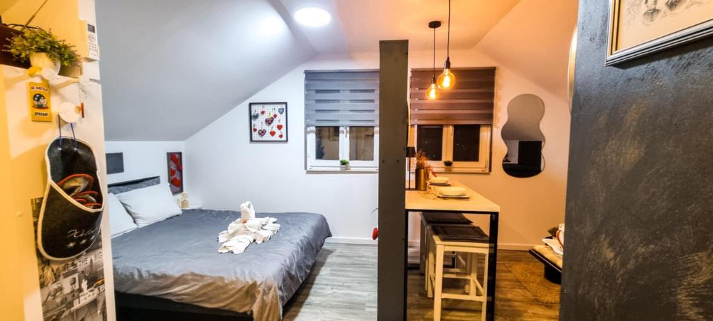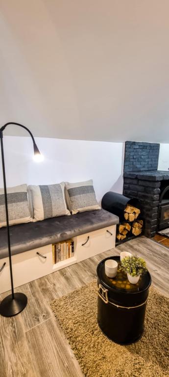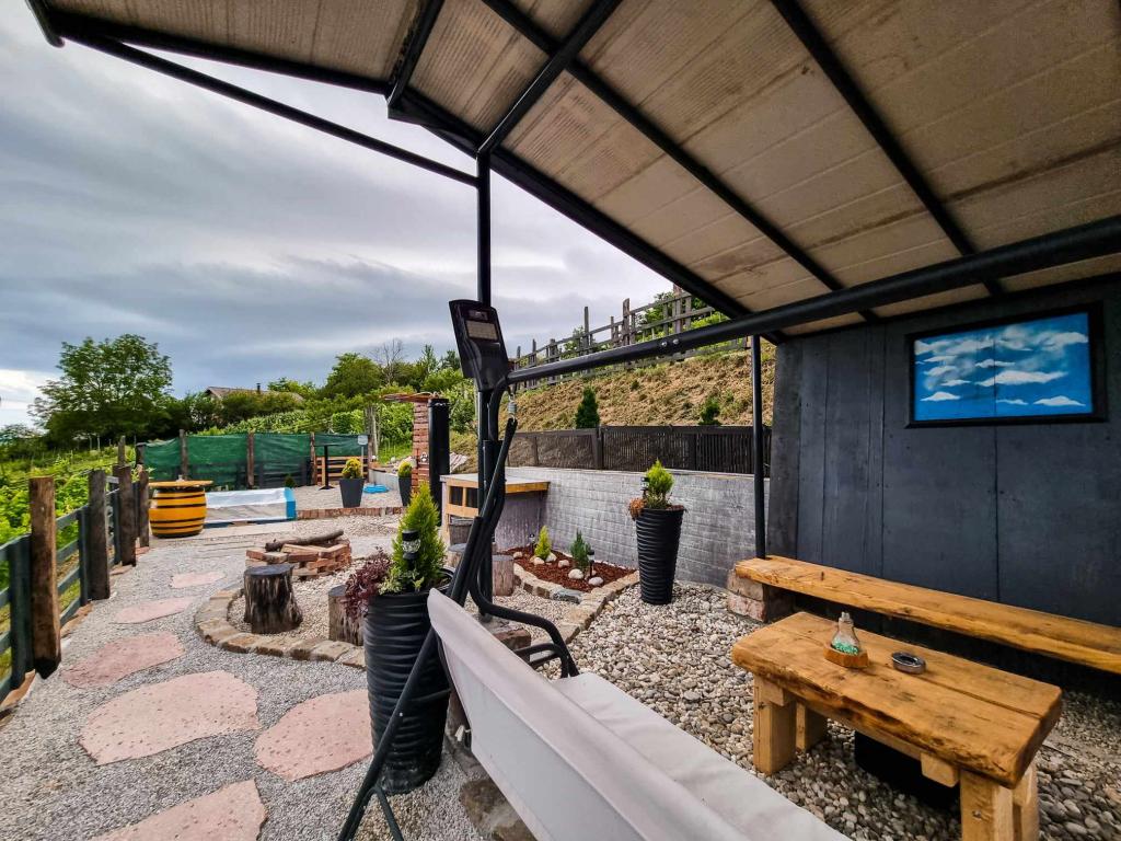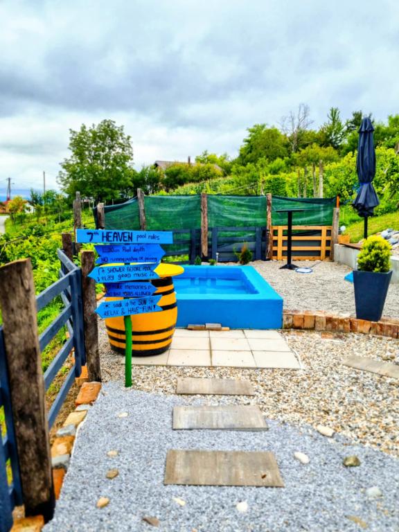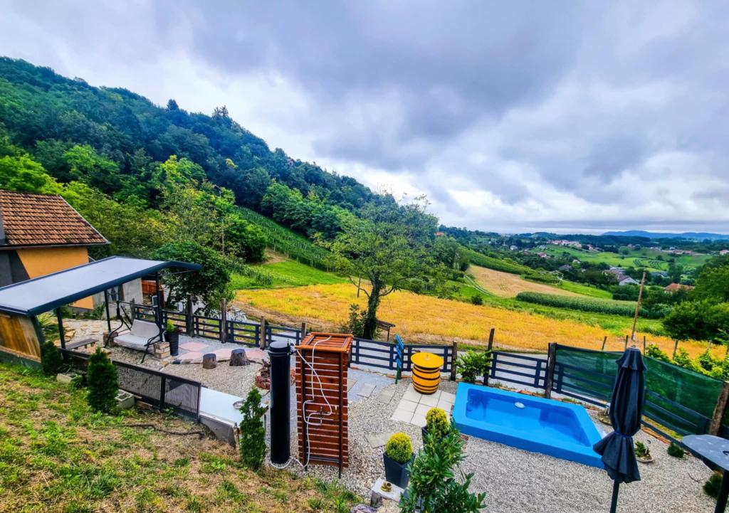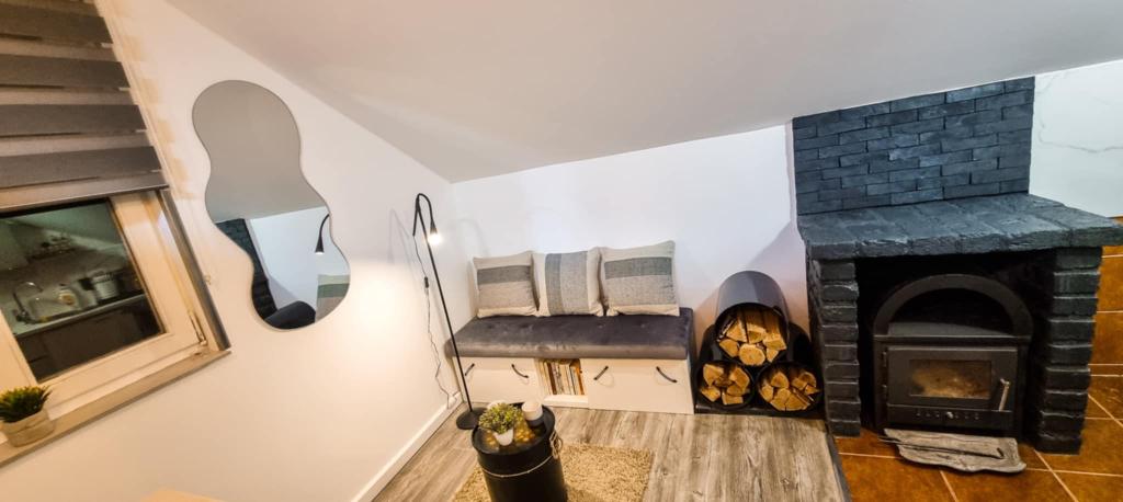 Studio apartment 7. nebo with a capacity of 2+0, is located in Trški Vrh, near the town of Krapina. 7. nebo is a perfect combination of rustic and modern and a great option for a break from the city noise and urban life with nature and the Zagorje homeland. The studio consists of a kitchen and dining room, a bed for sleeping, a living room and a bathroom. The accommodation also includes parking, wi-fi, air conditioning, TV, radio, kettle, microwave, induction hob, refrigerator and various board games for fun (five-a-side football, electric darts, table football, hanging bowling, etc.). The facility is surrounded by orchards and flower gardens and a smaller part of the forest. Guests also have the opportunity to use the barbecue, campfire, deck chairs, swings, gazebo and terrace, as well as a small outdoor pool and shower on warm summer days. There is no surcharge for pets and they are welcome! Welcome!