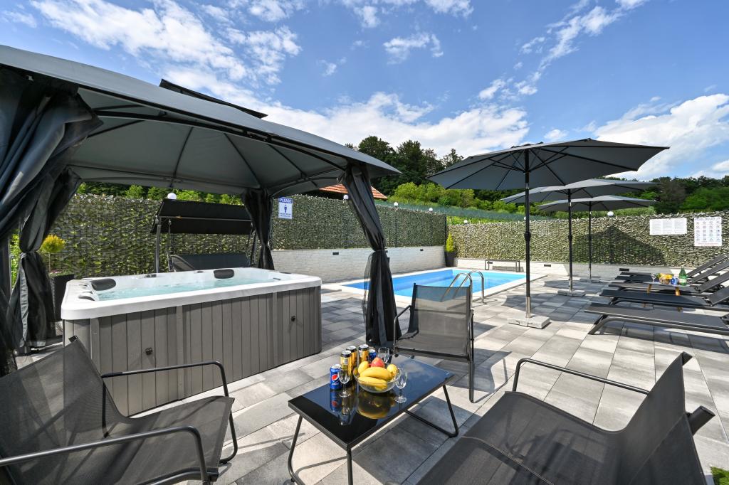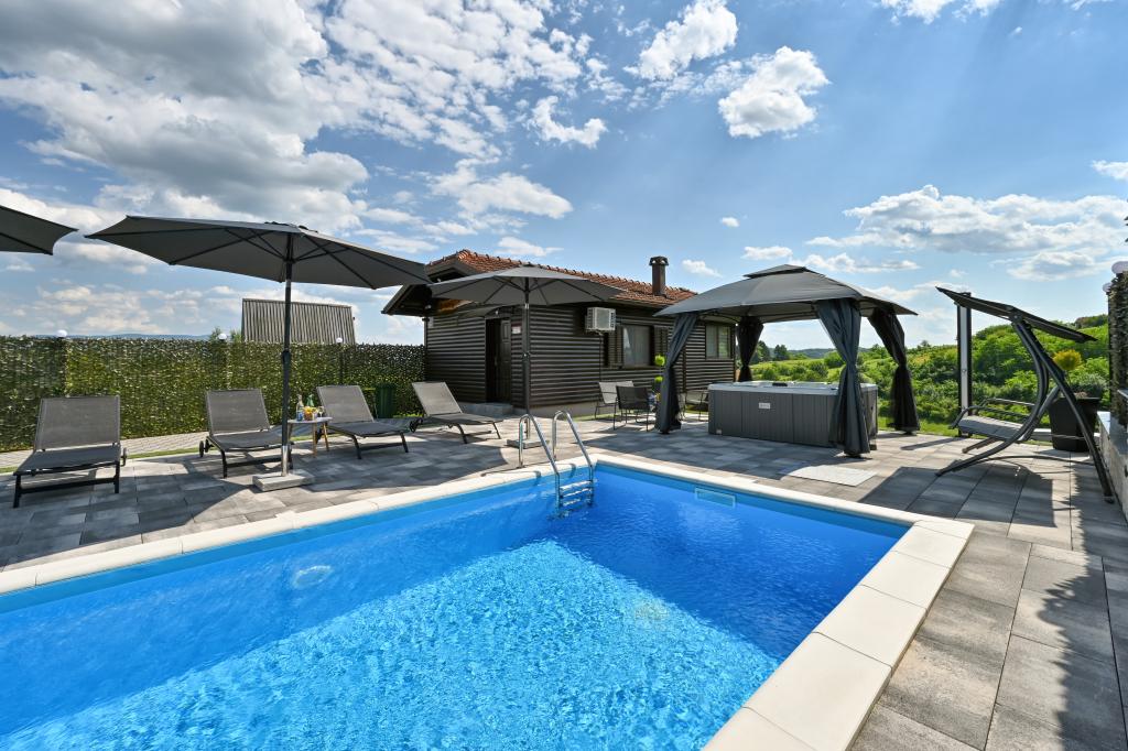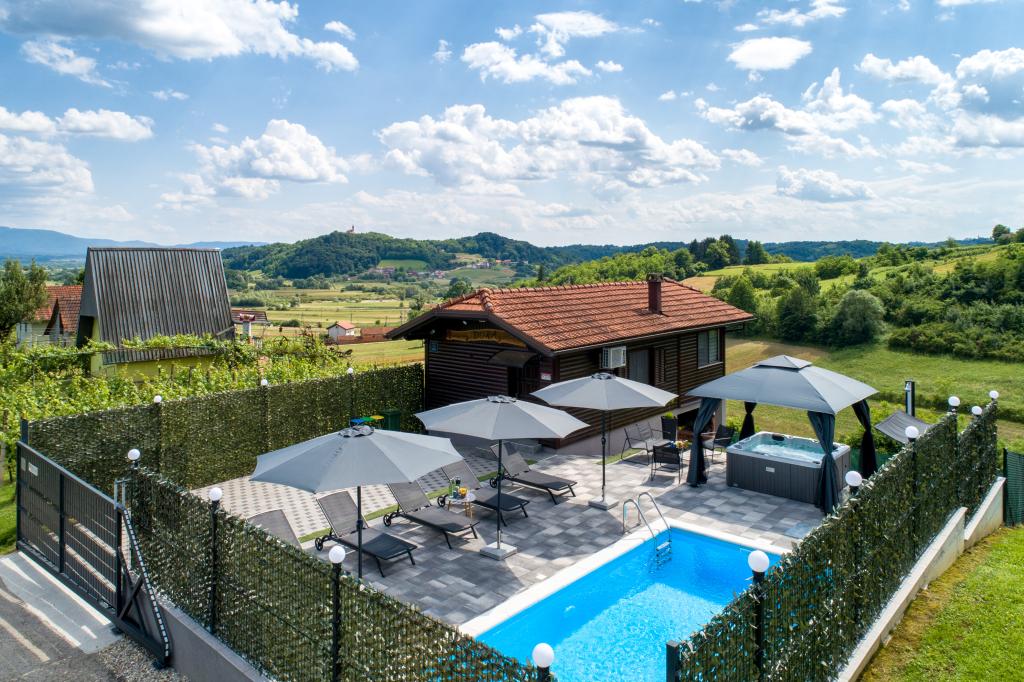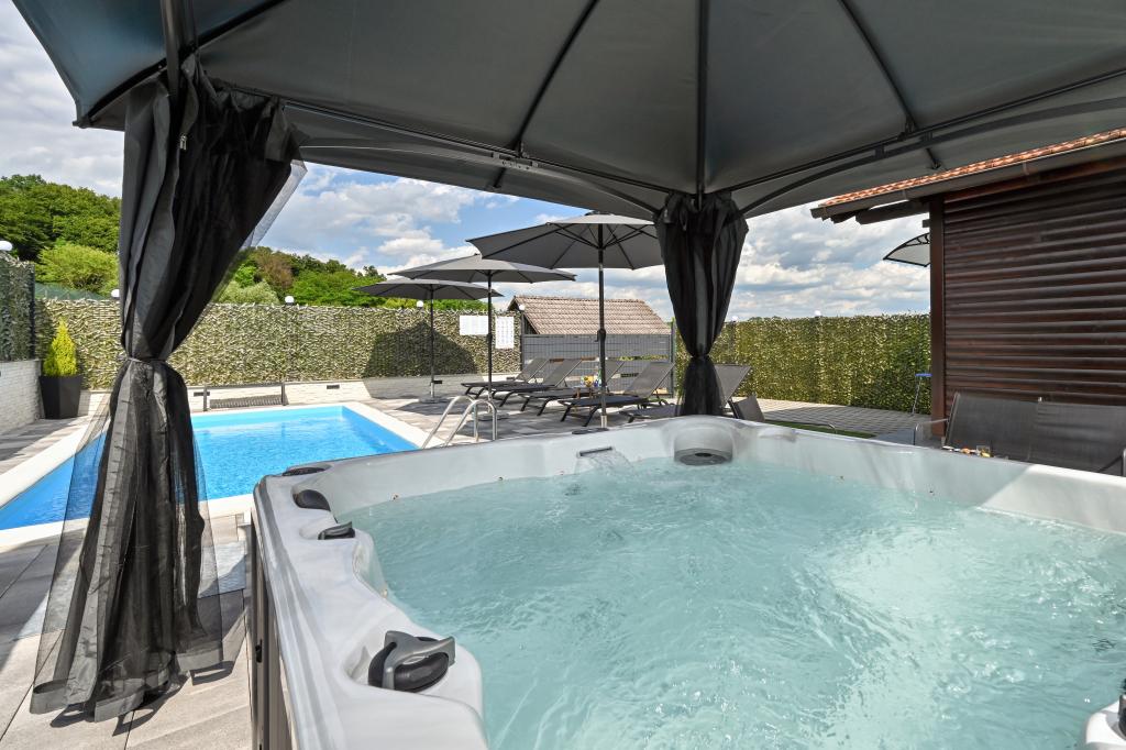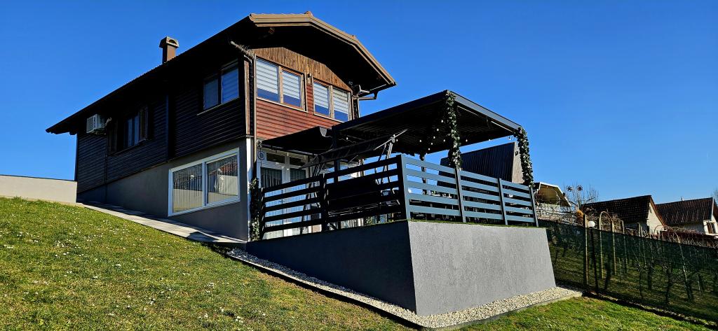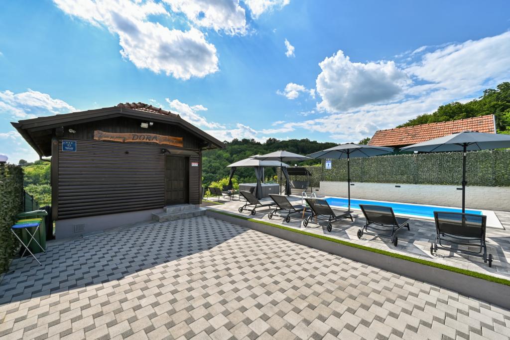 - Three-star holiday house in a quiet part of Croatian Zagorje. - Private parking - Large terrace: pool now with automatic dosing of pH and chlorine for impeccably clean and healthy water, spa/jacuzzi for 5 people - Terrace equipped with 5 sunbeds, garden seating set, bench, outdoor solar shower, umbrellas, garden swing for 3 people - Upper part of the house: dining room, kitchen, bar, TV, sofa bed, fridge, washing machine, bedroom double bed with TV, wardrobes, bathroom / toilet, with a beautiful view - Lower part: terrace with a beautiful view , table and chairs for 8 people, grill, room bed, wardrobes, bedroom double bed with TV, - The house is located 7 minutes from the A2 Zagreb-Macelj highway
