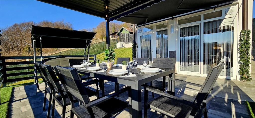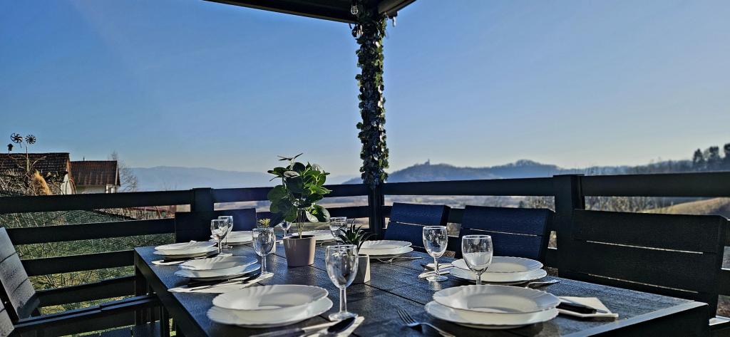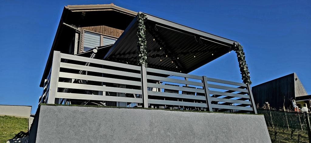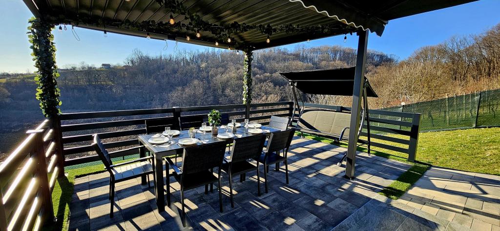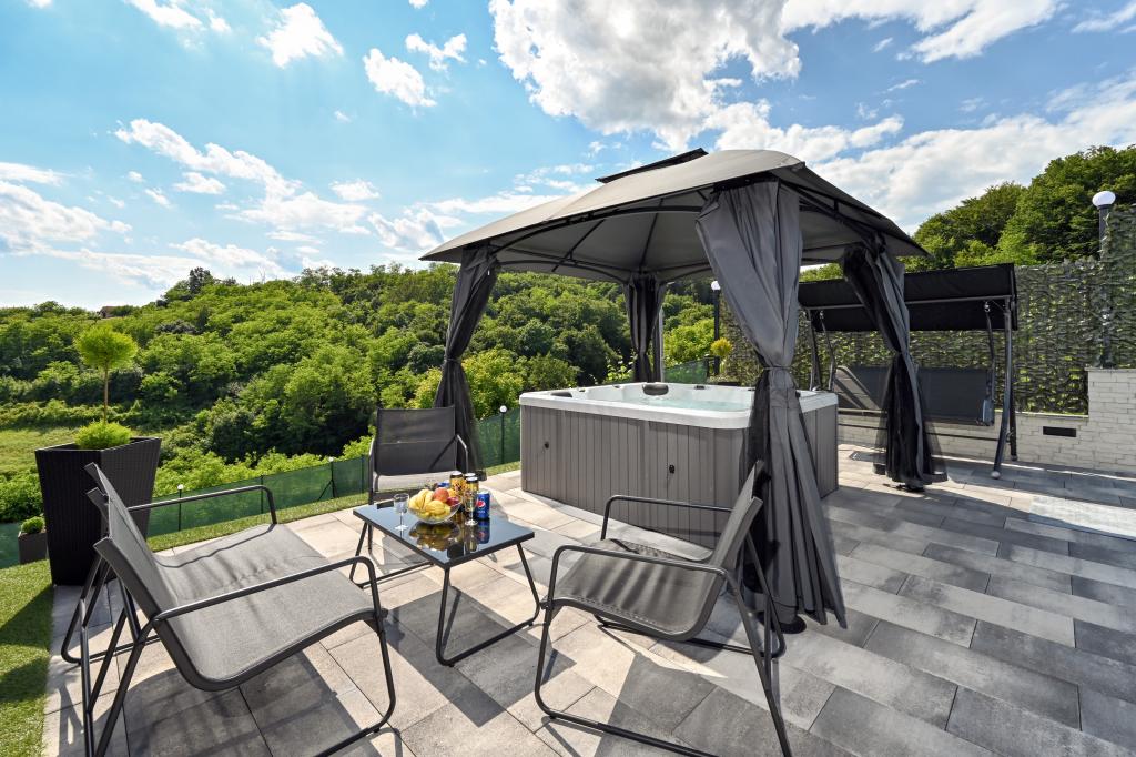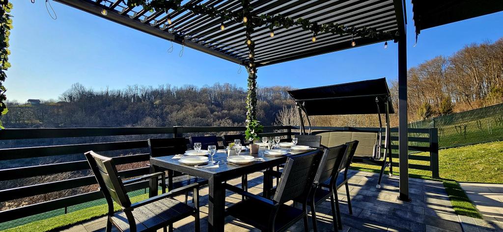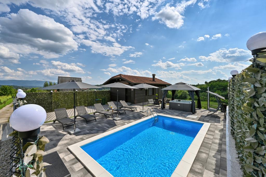 - Three-star holiday house in a quiet part of Croatian Zagorje. - Private parking - Large terrace: pool now with automatic dosing of pH and chlorine for impeccably clean and healthy water, spa/jacuzzi for 5 people - Terrace equipped with 5 sunbeds, garden seating set, bench, outdoor solar shower, umbrellas, garden swing for 3 people - Upper part of the house: dining room, kitchen, bar, TV, sofa bed, fridge, washing machine, bedroom double bed with TV, wardrobes, bathroom / toilet, with a beautiful view - Lower part: terrace with a beautiful view , table and chairs for 8 people, grill, room bed, wardrobes, bedroom double bed with TV, - The house is located 7 minutes from the A2 Zagreb-Macelj highway