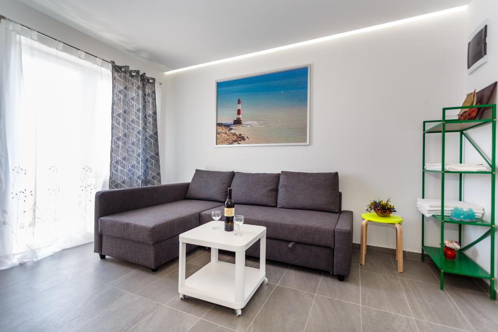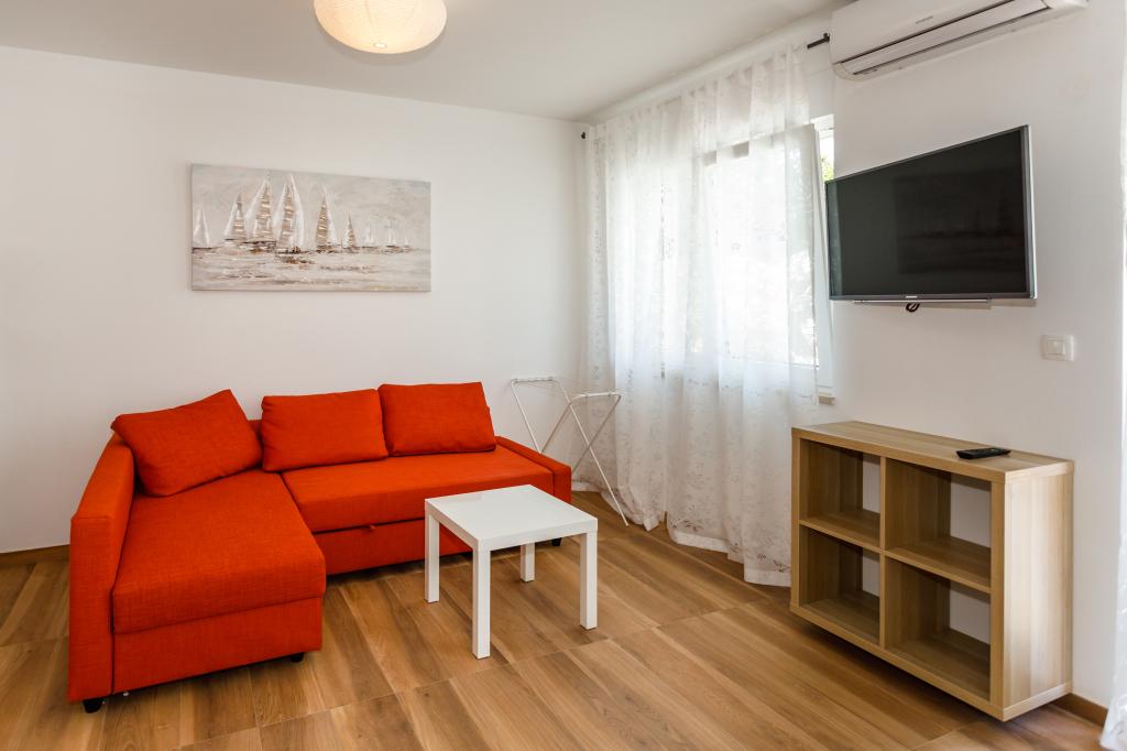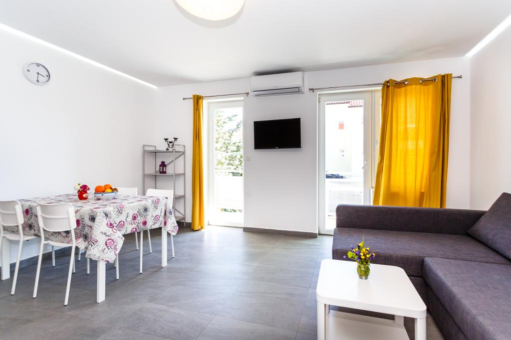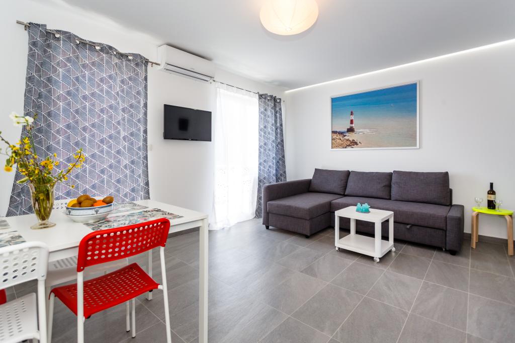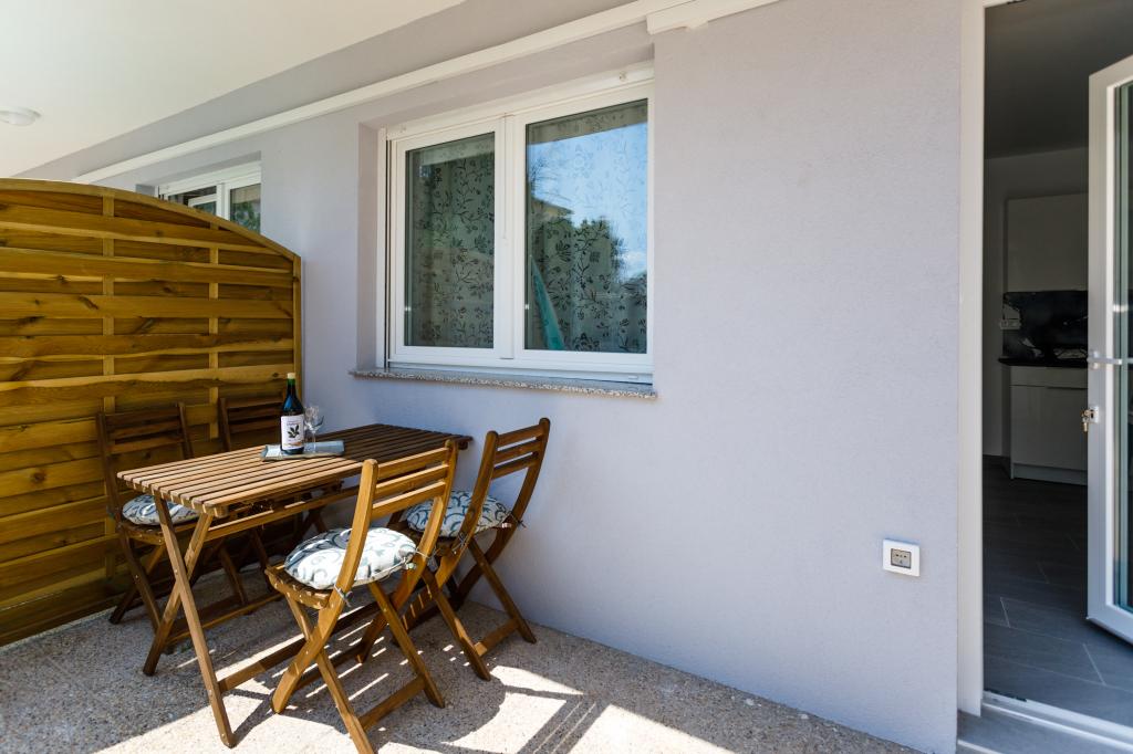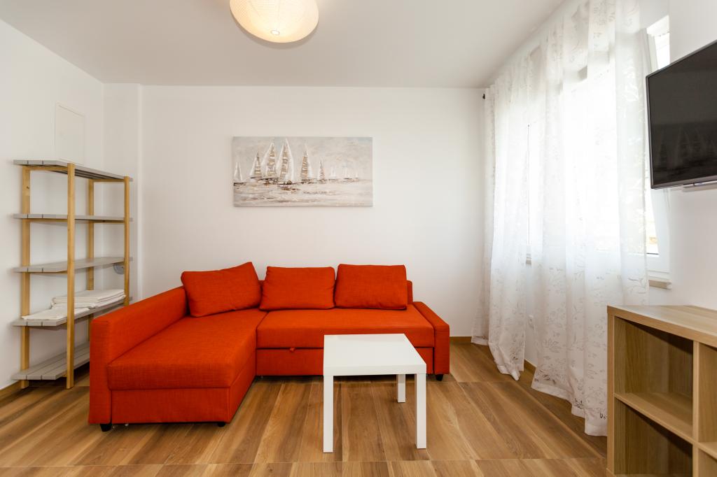 Hello! :) This is our brand new apartment located near the center of Krk (about 5 minutes walk). The apartment has one bedroom with a double bed, a living room with a sofa that can be converted into a double bed, a kitchen and one bathroom with necessary accessories. It also has a balcony, where you can enjoy the sun at any time of the day. We offer free parking space in the shade, free air conditioning, smart TV with Netflix, a BBQ grill in the garden next to the apartment and free WiFi.