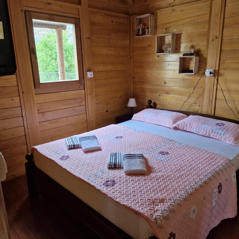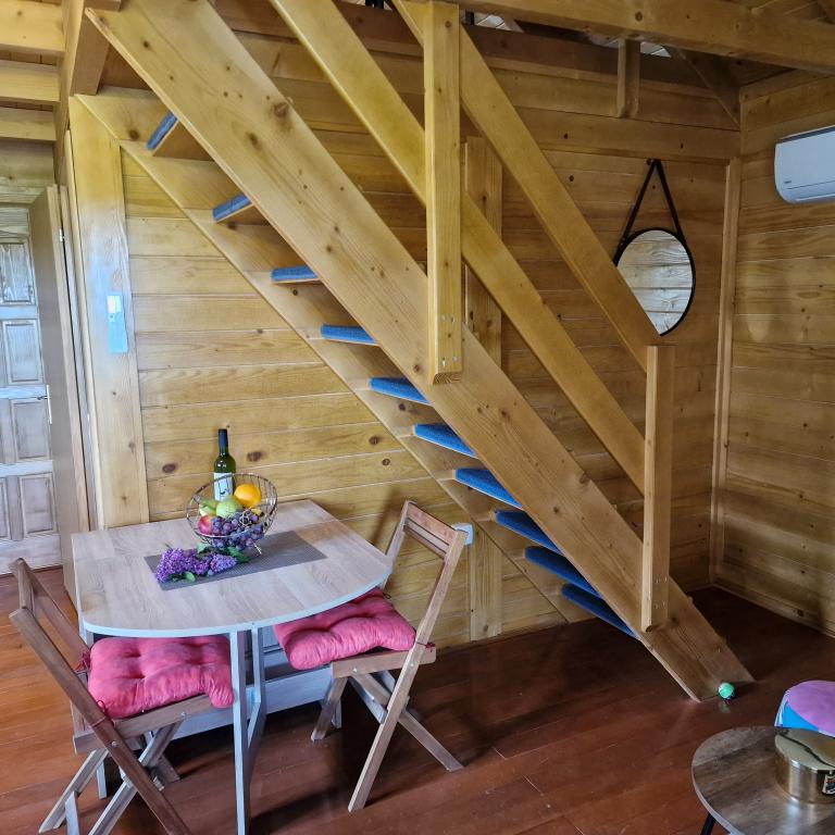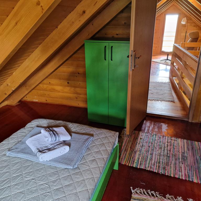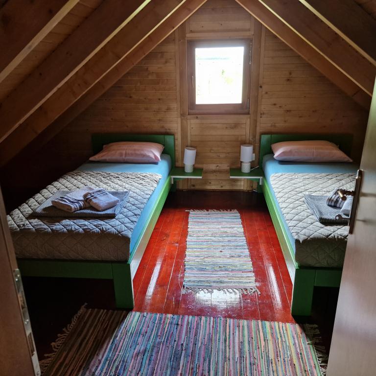 A wooden house for holidays in nature, located in a small, sparsely populated Slavonian village. Ideal for an escape from everyday duties and a true rest with the singing of birds and the daily visit of a couple in love. The house consists of a ground floor with a bedroom, kitchen, living room, bathroom and a large covered terrace. On the first floor, there is an open gallery with a space for reading and relaxing with a view of the lake and a bedroom with two beds. The house also has a mixed orchard with dozens of trees of various fruits and berries, which guests can use when there is something in the garden (a possible option is to pick them for your own needs, make homemade marmalade from fruits from organic farming and take it as a souvenir). Kilometers of nature trails open before the guest, suitable for cycling, walking, exploring. The surrounding attractions are easily accessible and the house is an ideal starting point for discovering Slavonia.