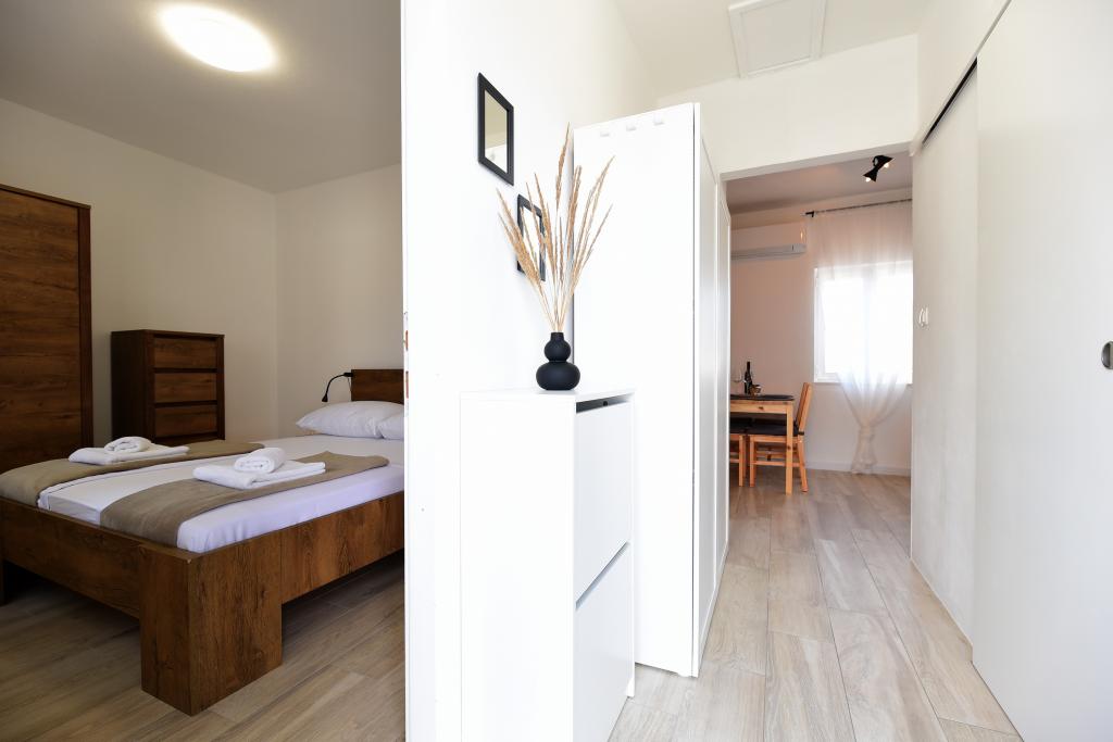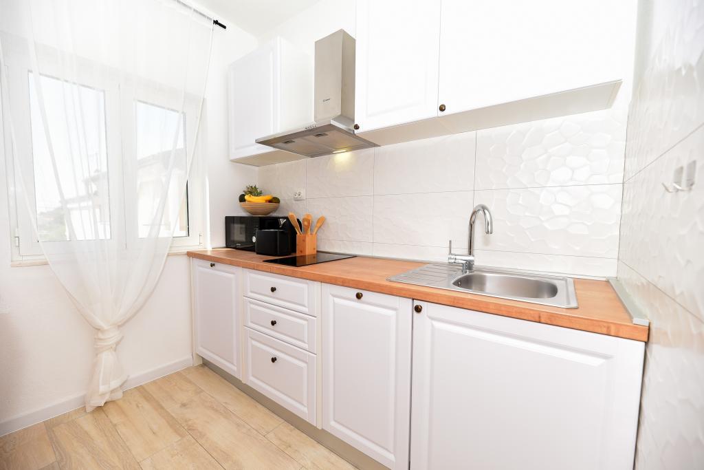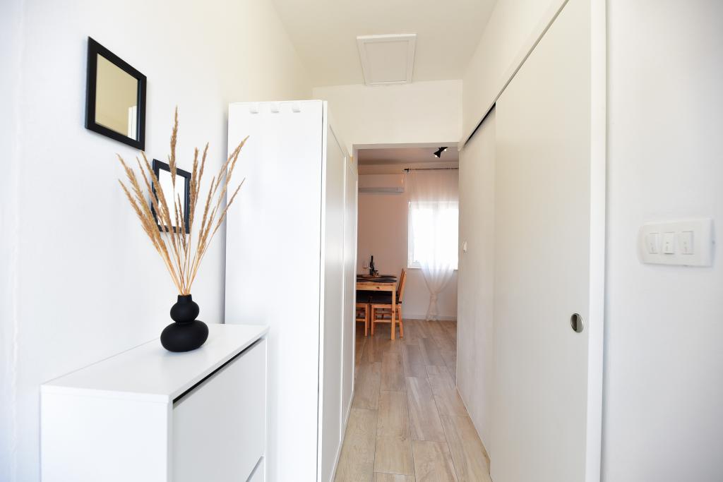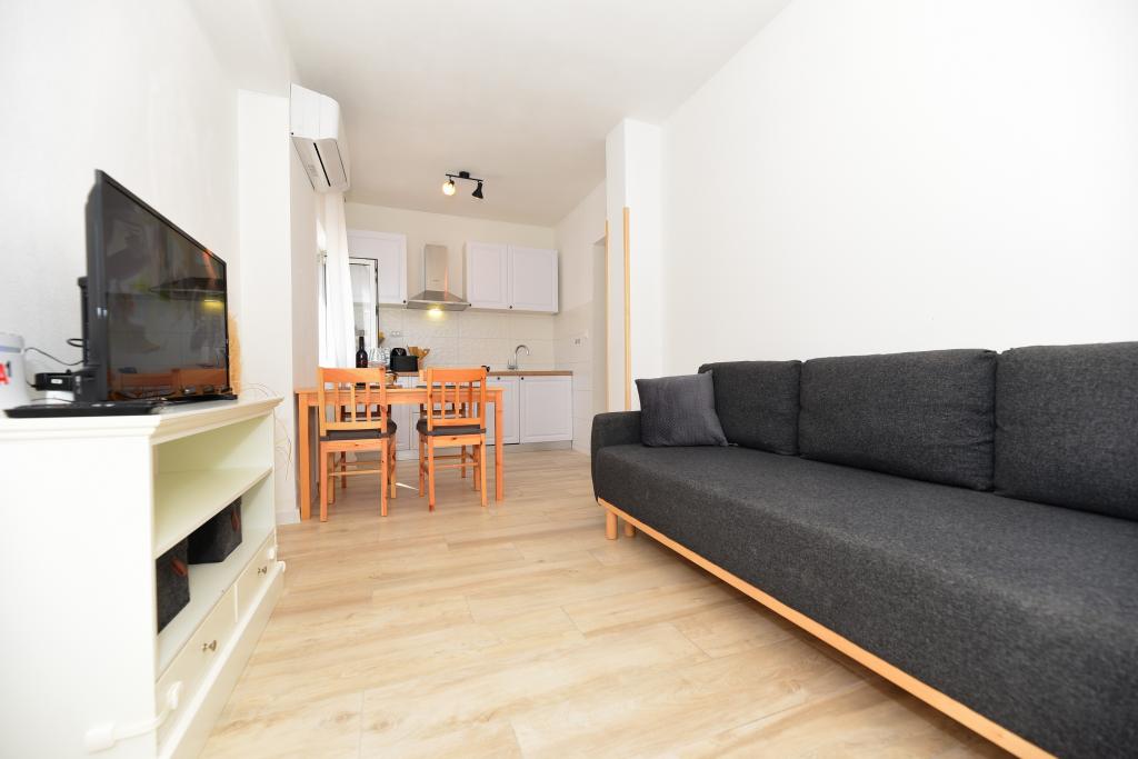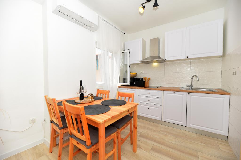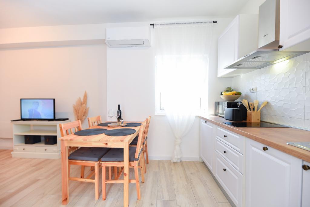 Modernly furnished apartment in an attractive terraced house with a garage, 50 m from the sea and the beach. Ideal for a quiet family holiday, fully equipped with a terrace, garage and a room with a washing machine.