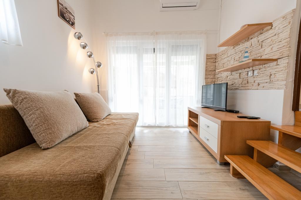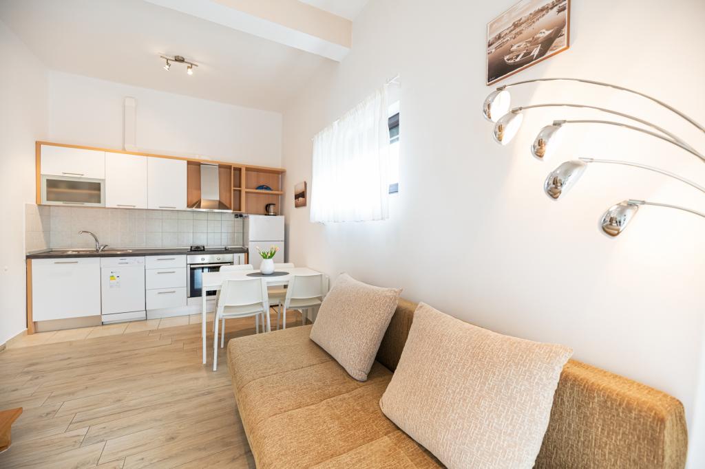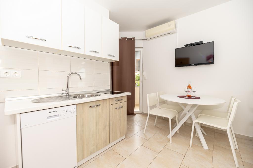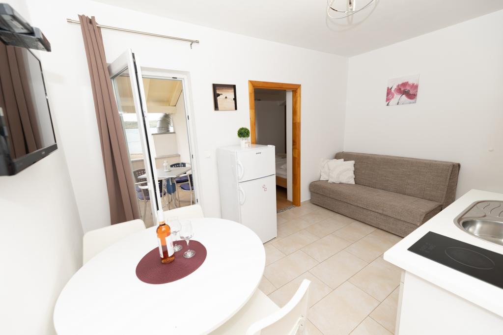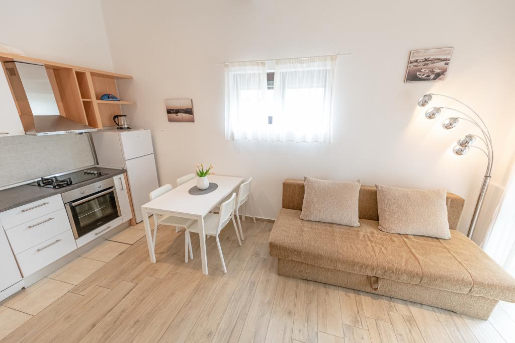 The apartment is well equipped, very clean, well-kept surroundings. The owner is very friendly and helpful. In the inn, which is part of the apartments, excellent, very tasty pizzas. The beach right in front of the apartments, very suitable for small children. A very quiet village for a peaceful, relaxed holiday. Excellent, kudos.