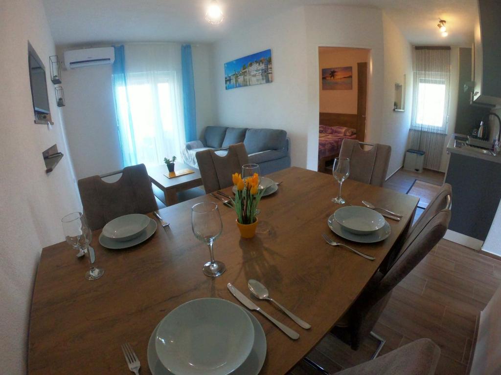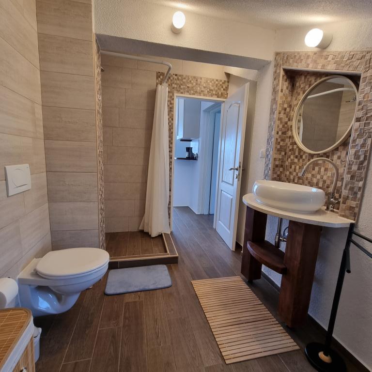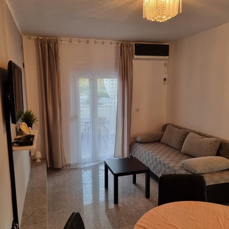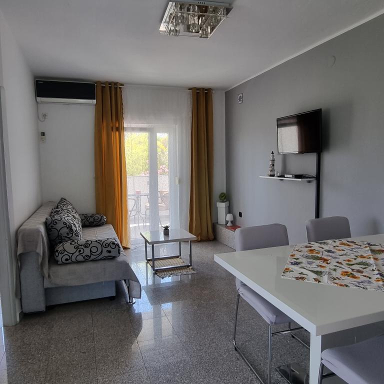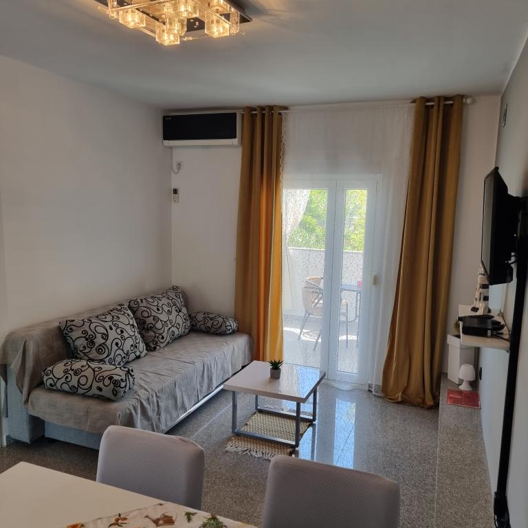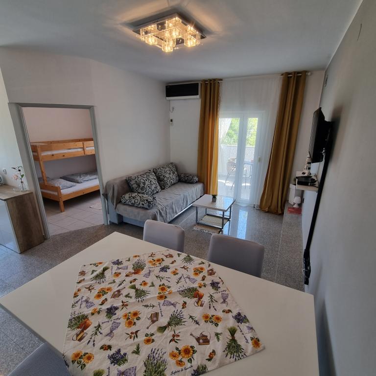 Residential tax is included in price.Our apartments offer comfortable accommodation with equipped kitchens, air conditioning, TV and free Wi-Fi. Guests can enjoy a spacious garden, a barbecue for preparing meals outdoors, and a large parking lot at their disposal. Pets are not allowed. Possibility of using a baby cot. Laundry - additional costs.