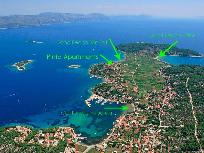 Apartments Pinta are located in the old and quiet part of the small town of Lumbarda on the island of Korčula. They are 5-10 minutes' walk from the sandy beaches of Bilin žal and Pržina, and 10 minutes from the center of Lumbarda. Our family has a long tradition of making travelers happy. In 1928, our ancestors opened the first boarding house in Lumbarda under the name PINTA. In the 1980s, the house was converted into apartments, and in 2012, the house was completely renovated, which brought out the beauty of the old construction. The available capacities and large terraces, with their connection in one house, represent the possibility of a joint holiday for a larger group of guests who at the same time have their own comfort in each apartment. At your disposal: Apartments for two - located on the first floor (with a large terrace), Apartment for five - ground floor and first floor of the house (terrace and balcony); Apartment for four - on the first floor with its own large balcony.