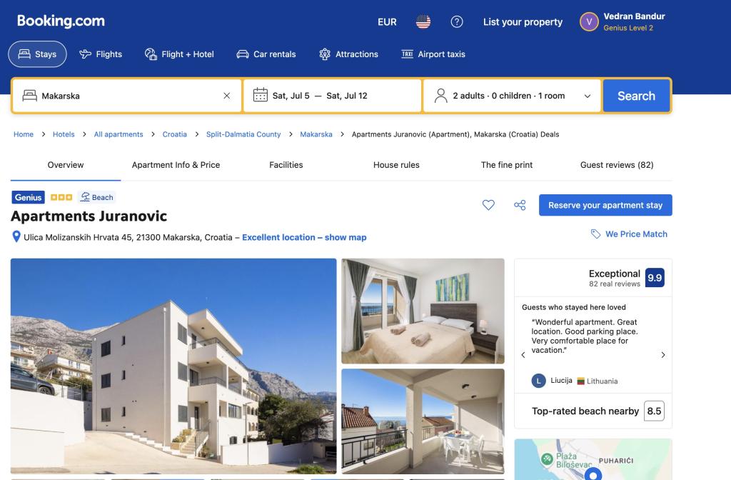 Located in Makarska, just 250 metres from Makarska Beach, Apartments Juranović offers accommodation with sea views, free WiFi and free private parking. All units in the apartment complex are equipped with air conditioning, a seating area, a flat-screen TV, a kitchen, a dining area and a private bathroom with a hairdryer, a shower and a washing machine. An oven, a fridge and stovetop are also available, as well as a kettle. Our staff is available to advise and assist you throughout your stay.