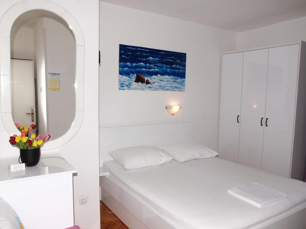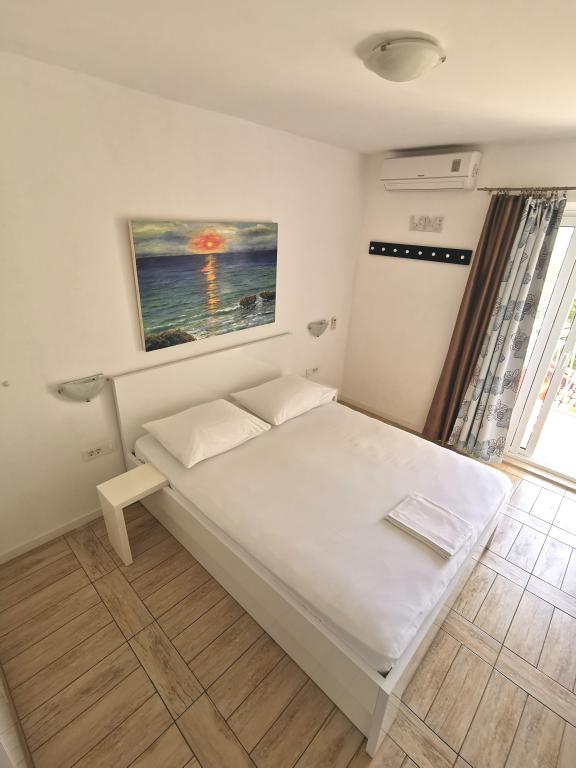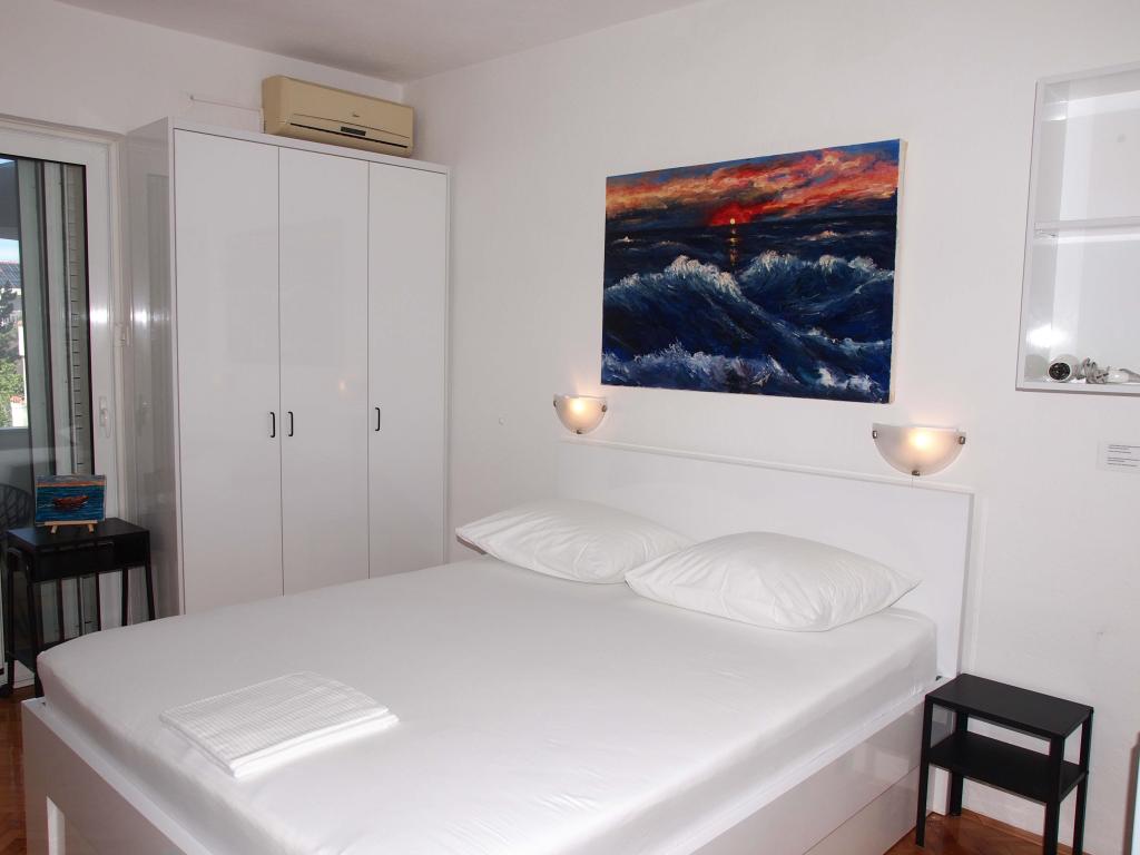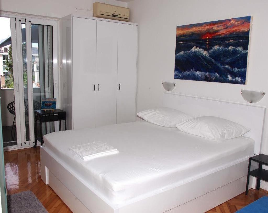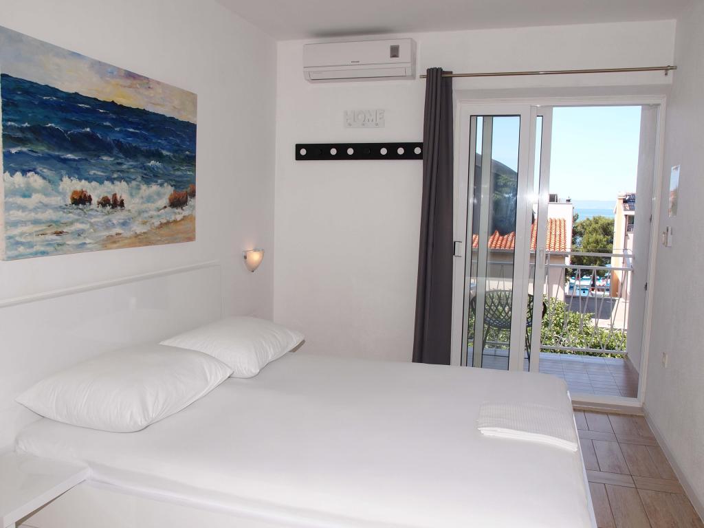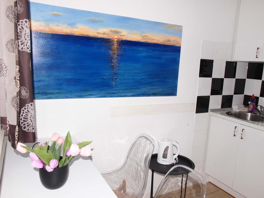 New and modernly equipped apartments with a sea view are located in the quietest, most attractive part of Makarska between the Places-Dalmacija hotel and the Biokovka hotel. Distance from the sea and sandy beach 50 m. A beautiful promenade surrounded by pine trees takes you to the city center in 10 minutes. Along the promenade there are numerous restaurants and interesting facilities. Guests have 4 accommodation units at their disposal. Two identical Studios on the 1st floor. Two identical Apartments on the 2nd floor of the family house. There is a possibility to add an extra bed for a child in the apartments. On the walls there are original works by local artist and host Ivo Glavina. All accommodation units have balconies. In the accommodation units, the kitchens are separated from the sleeping area. The apartments have their own external entrances which allow complete privacy. The accommodation units are not exposed to the street and provide guests with peace. The price includes parking, internet, air conditioning and tourist tax.