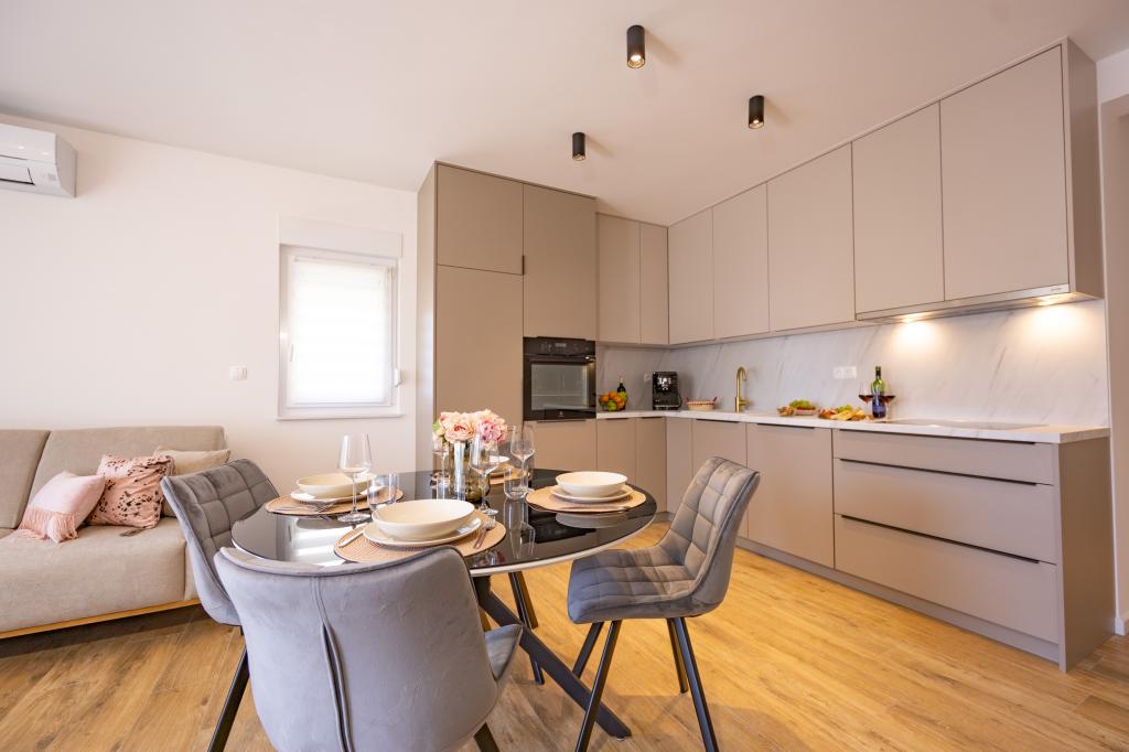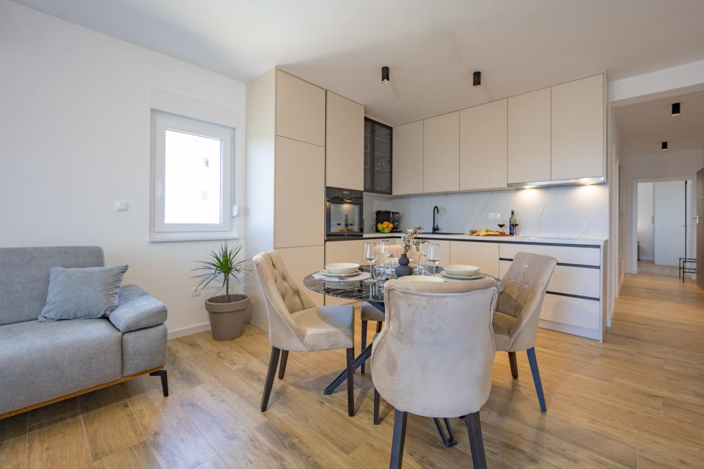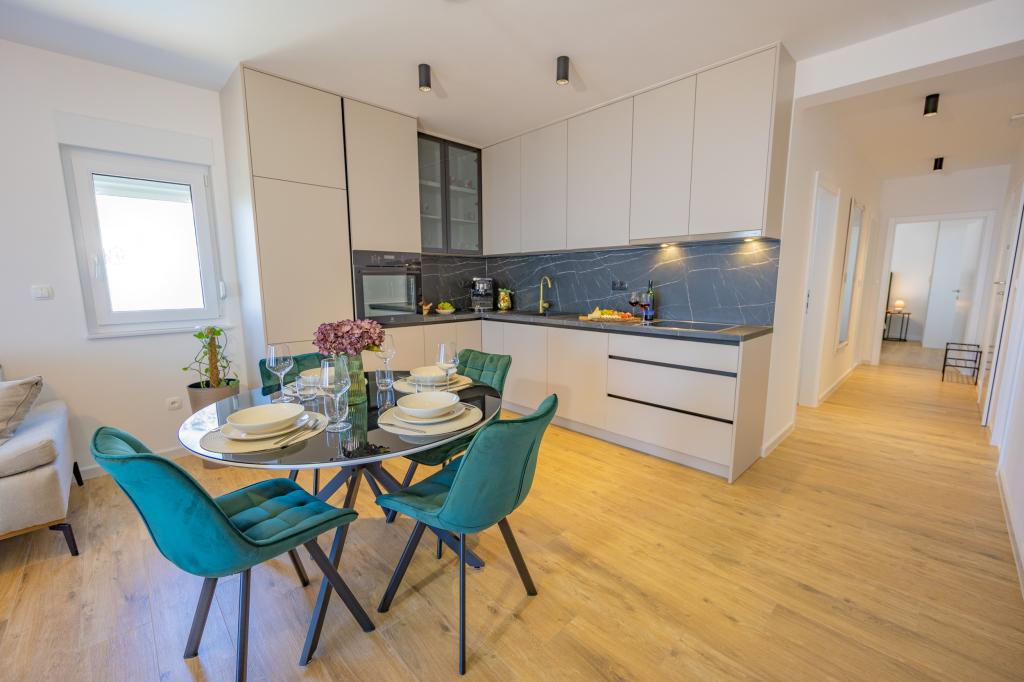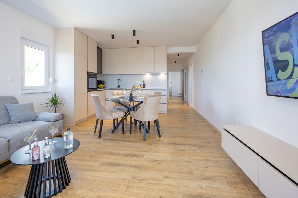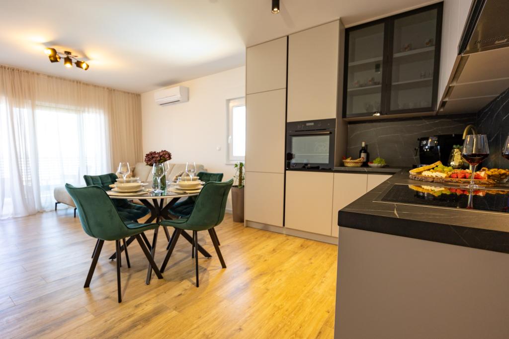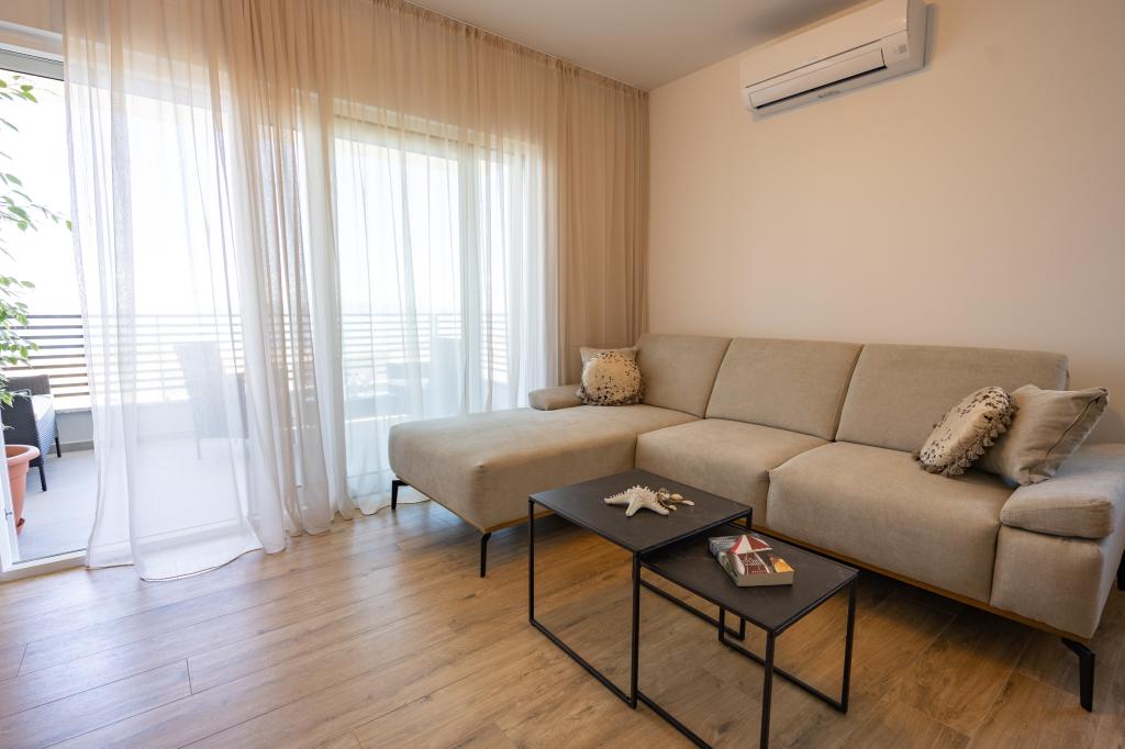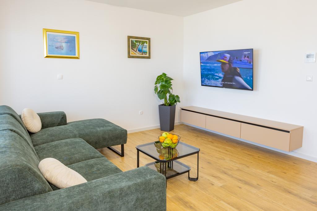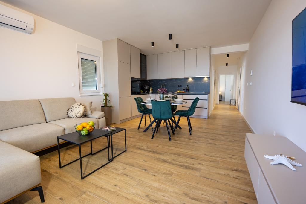 Each apartment exudes modern design and newly renovated interior. In the spacious living room, decorated with tasteful furniture and contemporary details, you will feel right at home. The open concept naturally connects the living room with a fully equipped kitchen, where elegant countertops, quality appliances and all the space you need to prepare your favorite meals await you. The living area opens onto a pleasant balcony - an ideal place for morning coffee or evening relaxation with a glass of wine and an unforgettable sunset over the Adriatic. Each apartment has two comfortable bedrooms with double beds, equipped with soft bedding and plenty of storage space, one modern bathroom and an additional toilet. The apartments are air-conditioned and fully equipped: TV/SAT, internet, washing machine, dishwasher, coffee maker and everything you need for a comfortable and carefree stay. Free parking near the beach is included in the rental price!