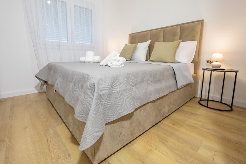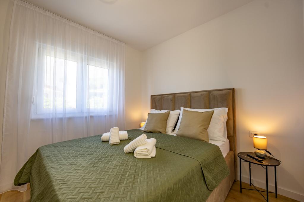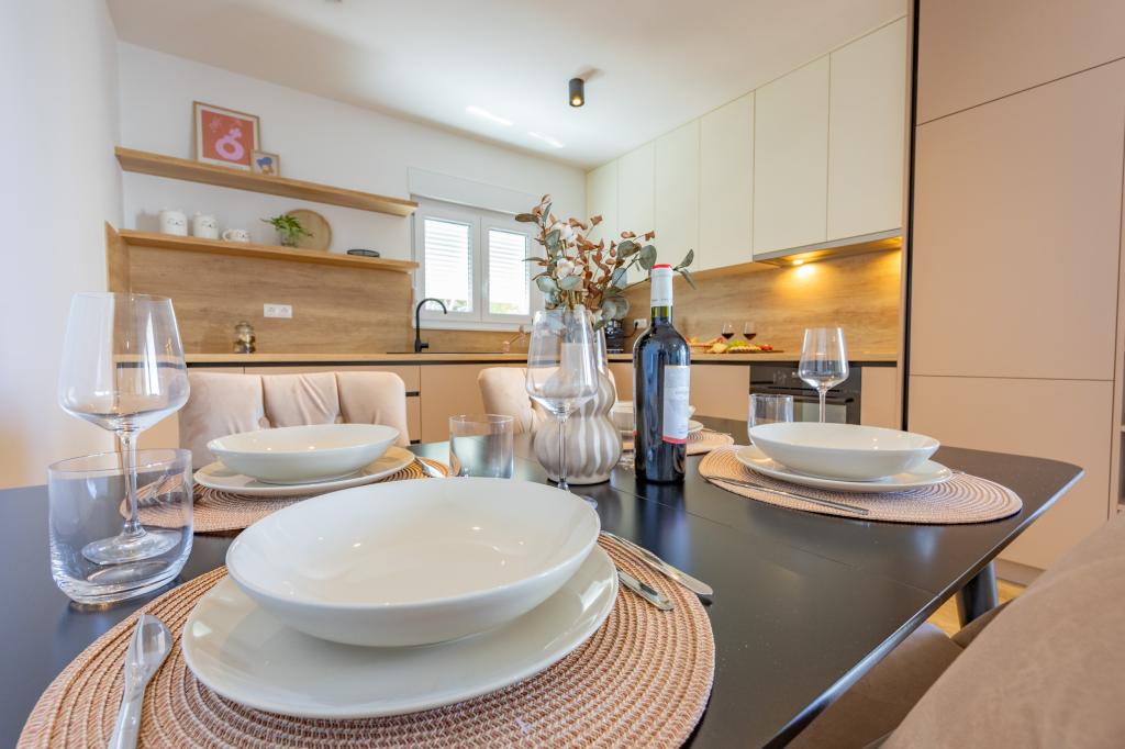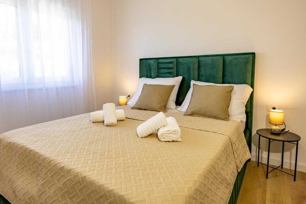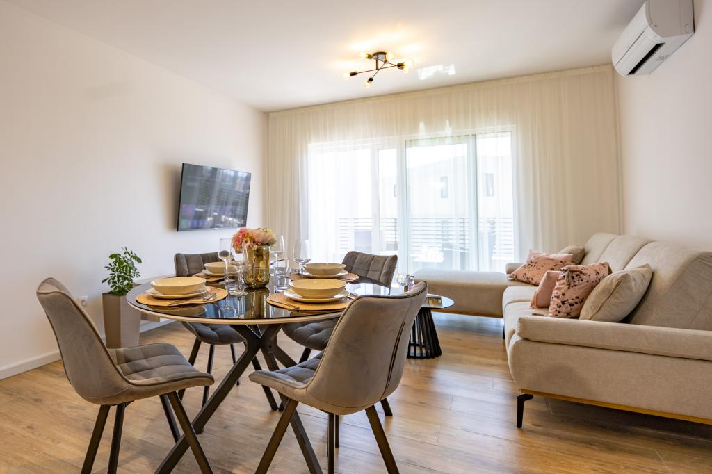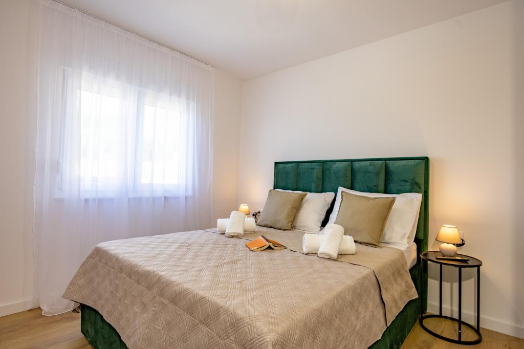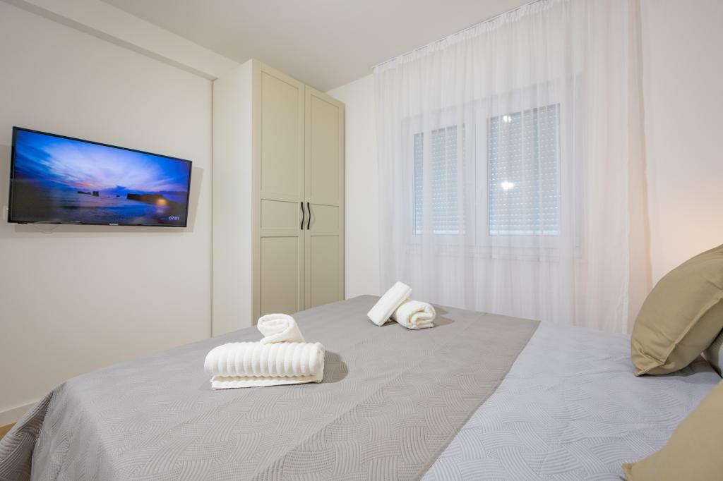 Each apartment exudes modern design and newly renovated interior. In the spacious living room, decorated with tasteful furniture and contemporary details, you will feel right at home. The open concept naturally connects the living room with a fully equipped kitchen, where elegant countertops, quality appliances and all the space you need to prepare your favorite meals await you. The living area opens onto a pleasant balcony - an ideal place for morning coffee or evening relaxation with a glass of wine and an unforgettable sunset over the Adriatic. Each apartment has two comfortable bedrooms with double beds, equipped with soft bedding and plenty of storage space, one modern bathroom and an additional toilet. The apartments are air-conditioned and fully equipped: TV/SAT, internet, washing machine, dishwasher, coffee maker and everything you need for a comfortable and carefree stay. Free parking near the beach is included in the rental price!
