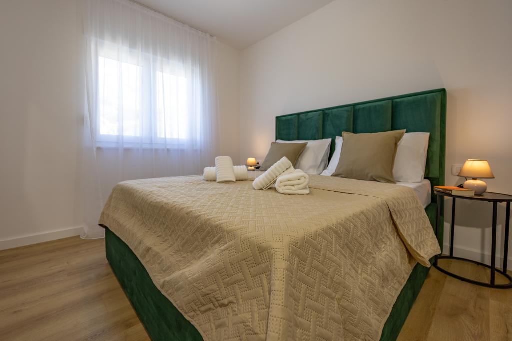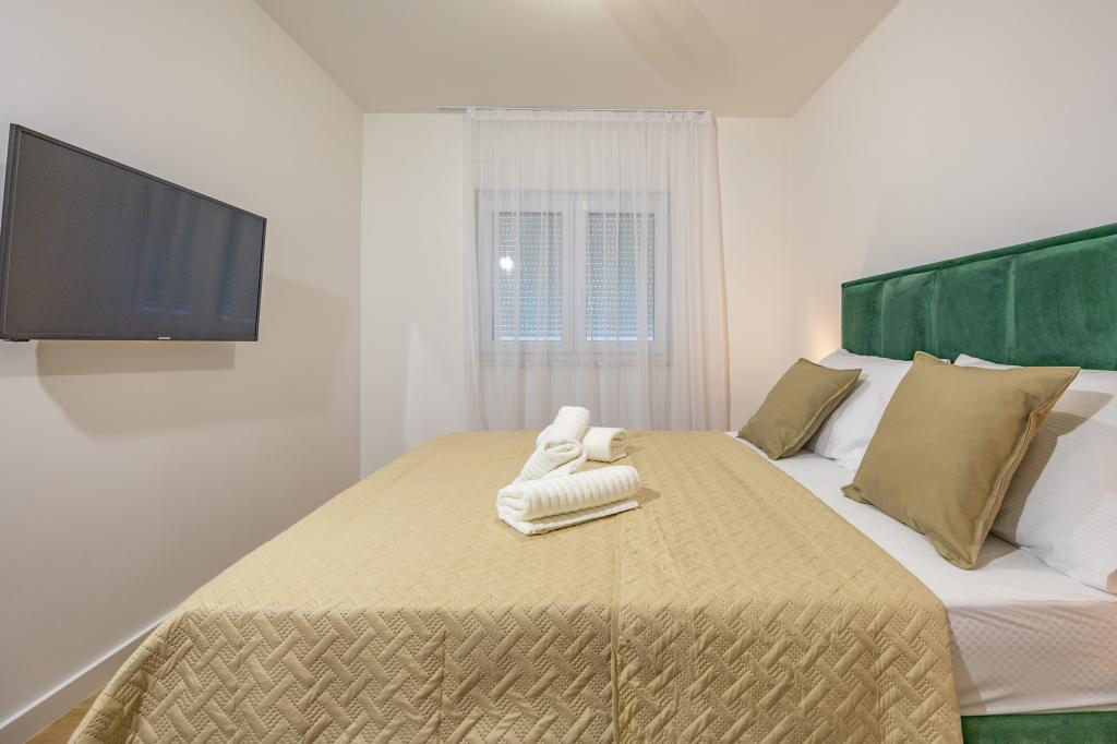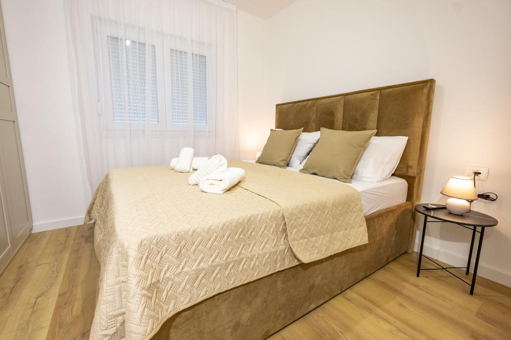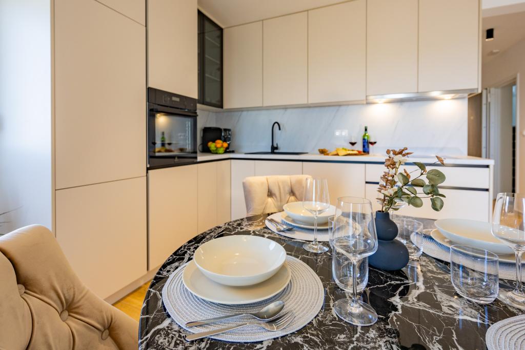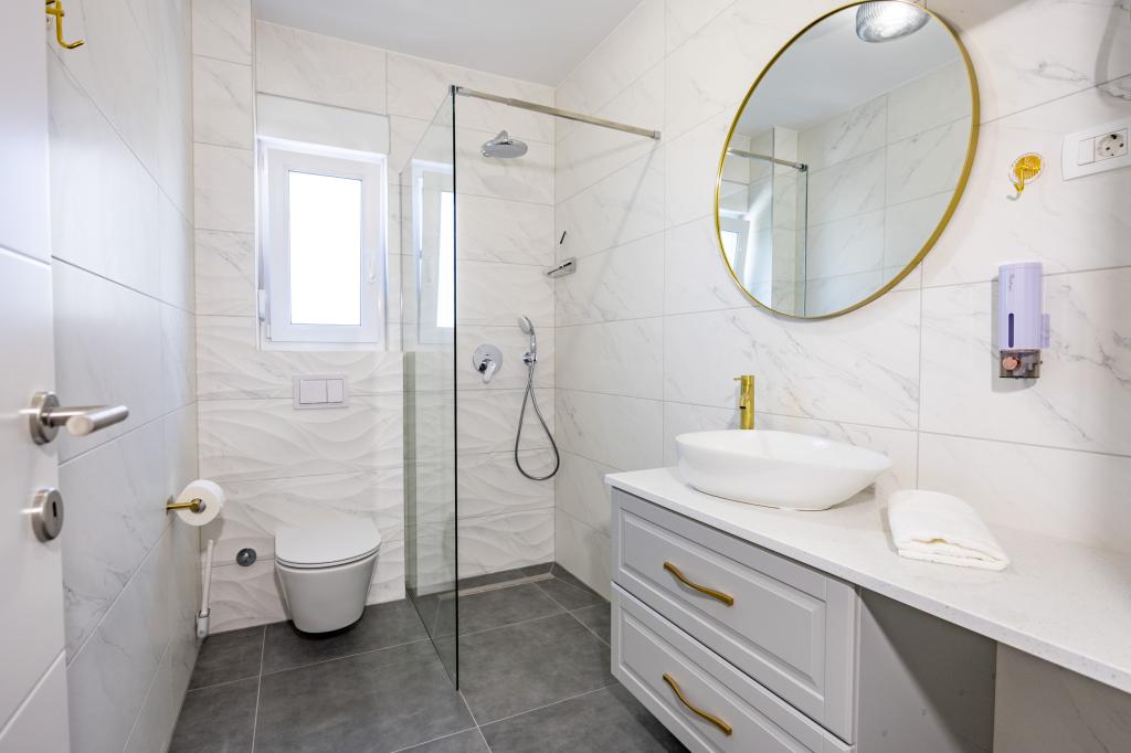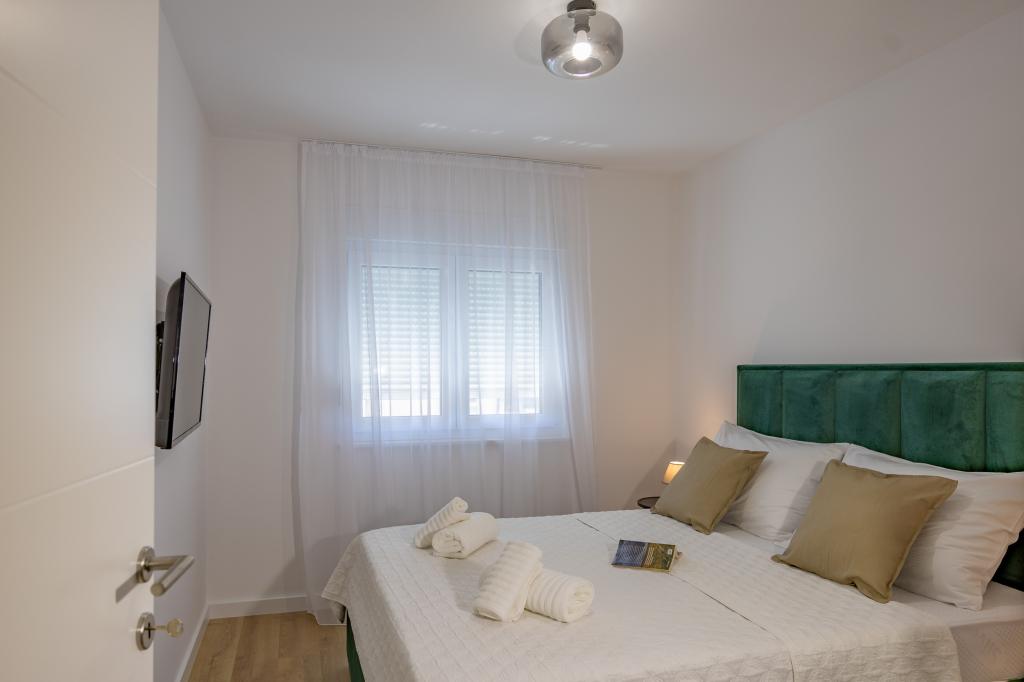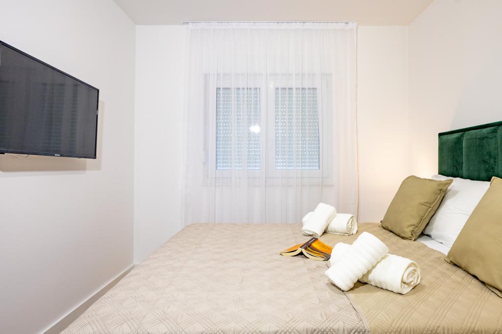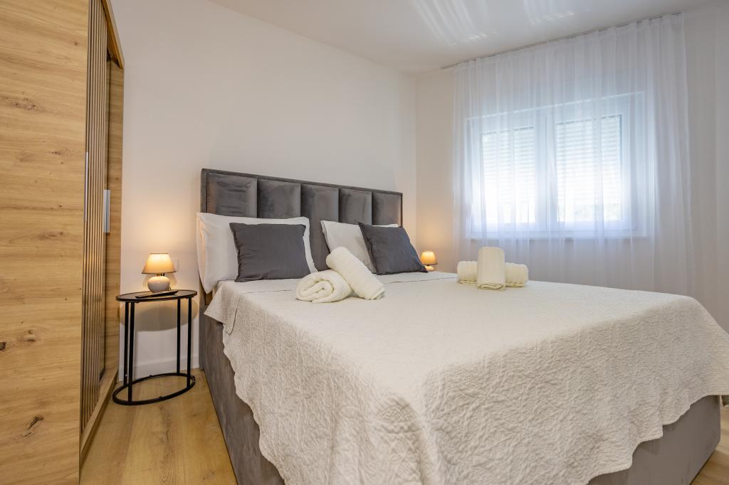 Each apartment exudes modern design and newly renovated interior. In the spacious living room, decorated with tasteful furniture and contemporary details, you will feel right at home. The open concept naturally connects the living room with a fully equipped kitchen, where elegant countertops, quality appliances and all the space you need to prepare your favorite meals await you. The living area opens onto a pleasant balcony - an ideal place for morning coffee or evening relaxation with a glass of wine and an unforgettable sunset over the Adriatic. Each apartment has two comfortable bedrooms with double beds, equipped with soft bedding and plenty of storage space, one modern bathroom and an additional toilet. The apartments are air-conditioned and fully equipped: TV/SAT, internet, washing machine, dishwasher, coffee maker and everything you need for a comfortable and carefree stay. Free parking near the beach is included in the rental price!