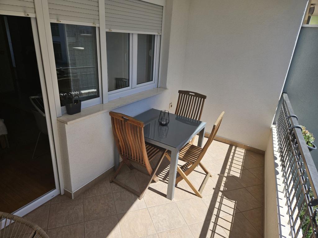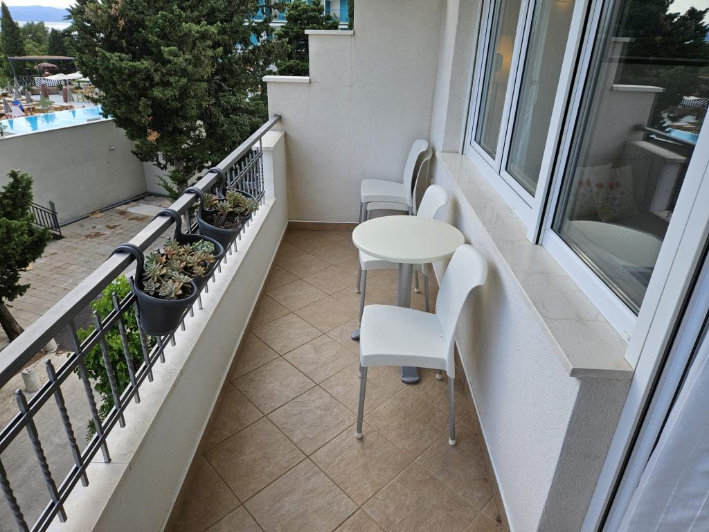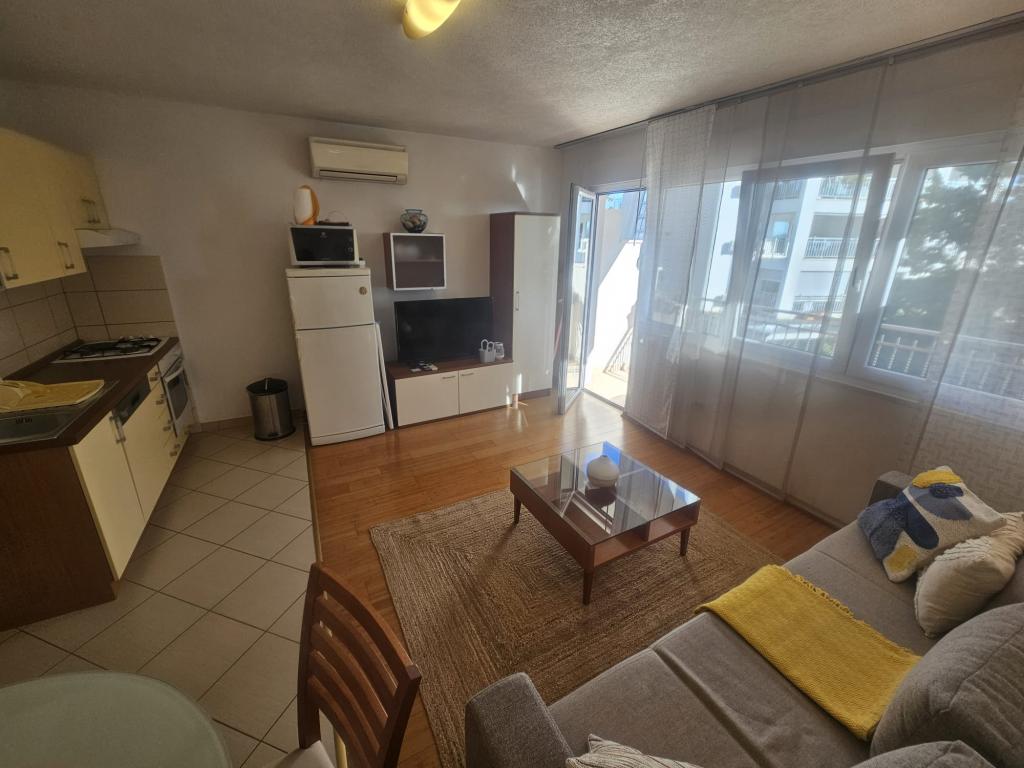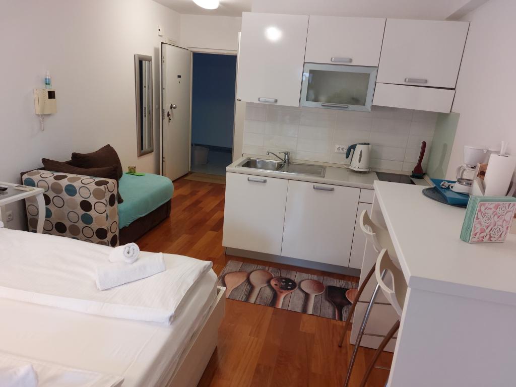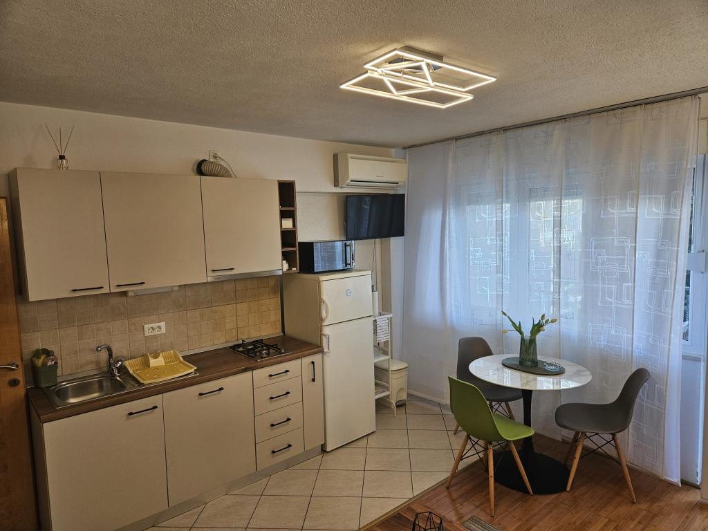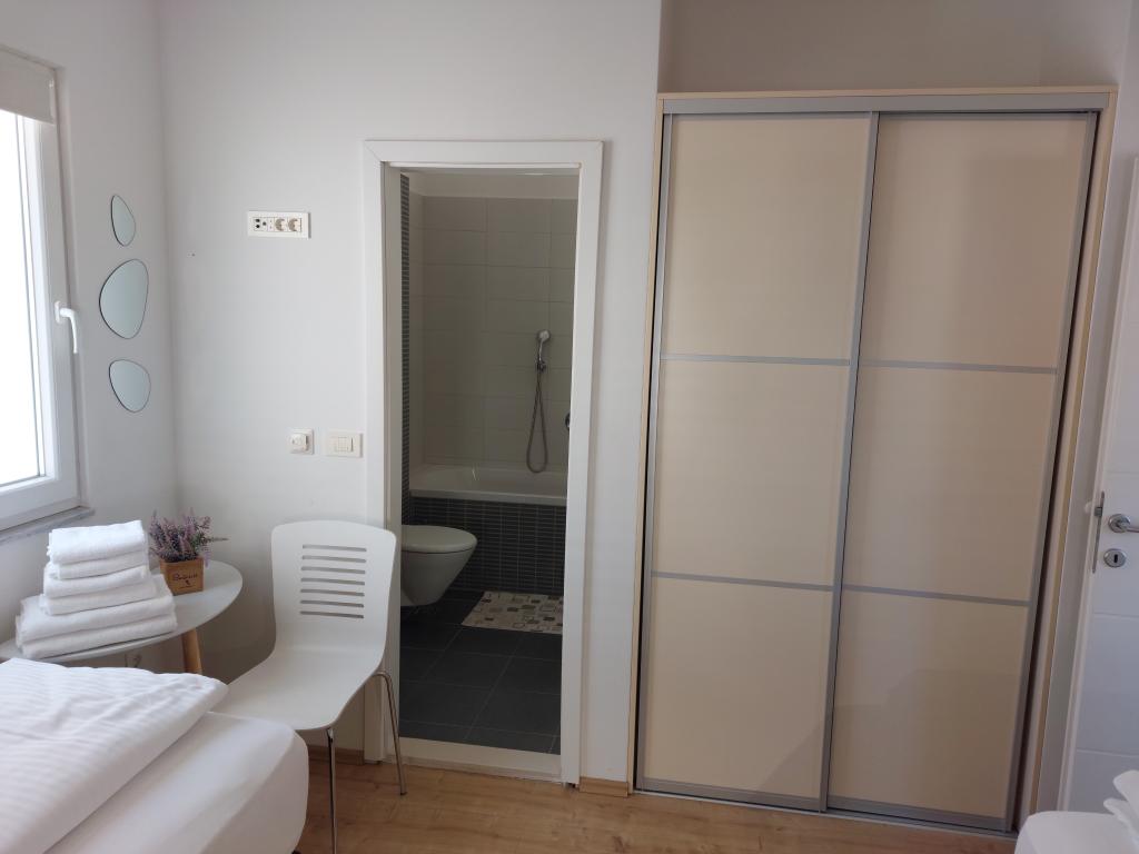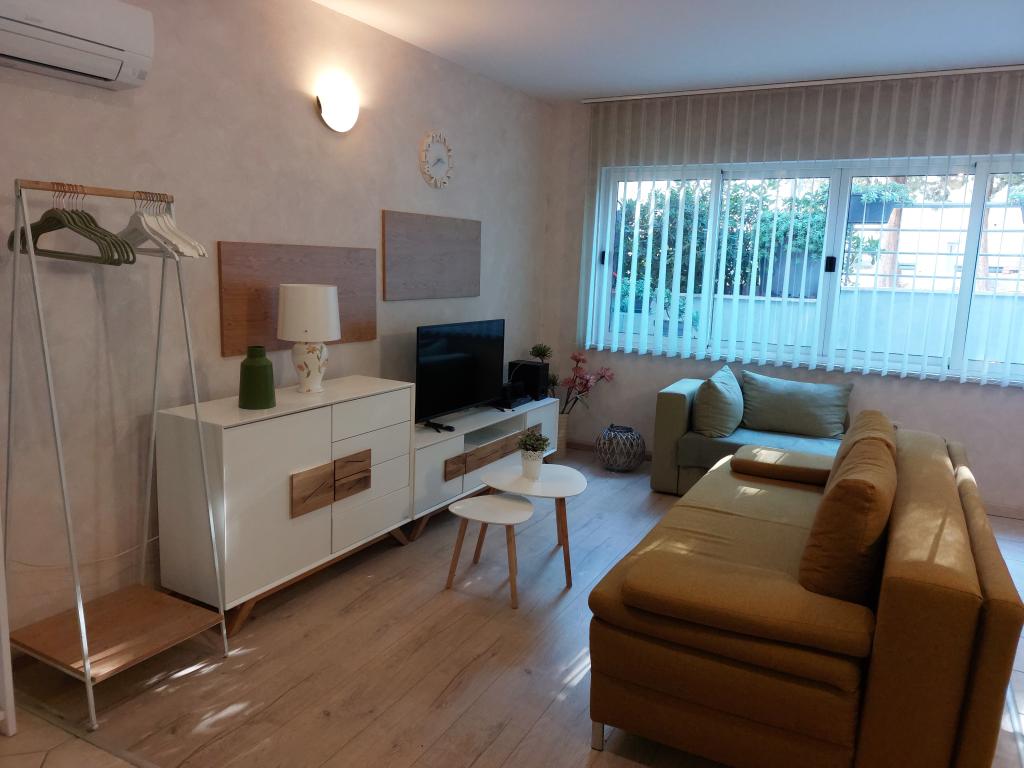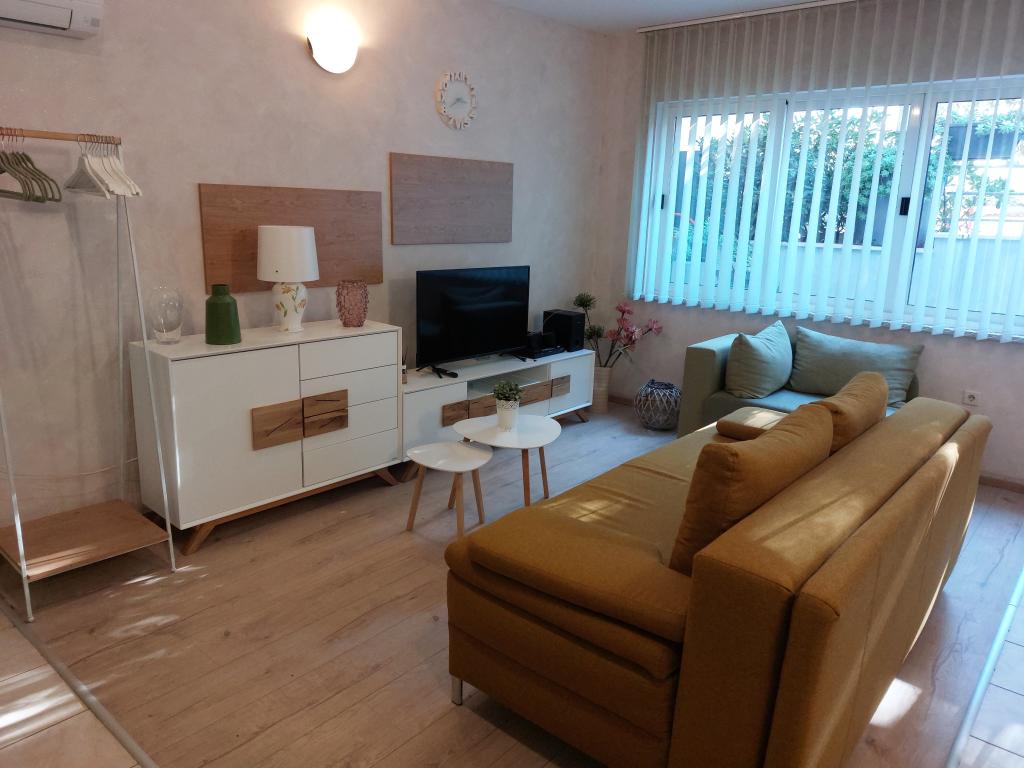Our apartments are modern and fully equipped to make your stay as comfortable and carefree as possible. Each apartment includes an iron and ironing board, hairdryer, filter coffee maker, kettle, microwave. Guests also have access to complete utensils for preparing and serving food. All accommodation units have a flat-screen TV, free Wi-Fi, indoor and outdoor seating and relaxation areas. The accommodation units are air-conditioned. Parking must be reserved in advance due to the limited number of parking spaces within the facility. Fresh bed linen and towels await you upon arrival, which are changed as agreed. A baby cot, with prior notice, is available in this facility and is free of charge. Within the facility there is a shared courtyard with seating furniture, surrounded by Mediterranean plants - an ideal place to relax. The facility is located in a quiet area, in the second row from the sea, just a 2-minute walk to the beach and a ten-minute easy walk to the center.