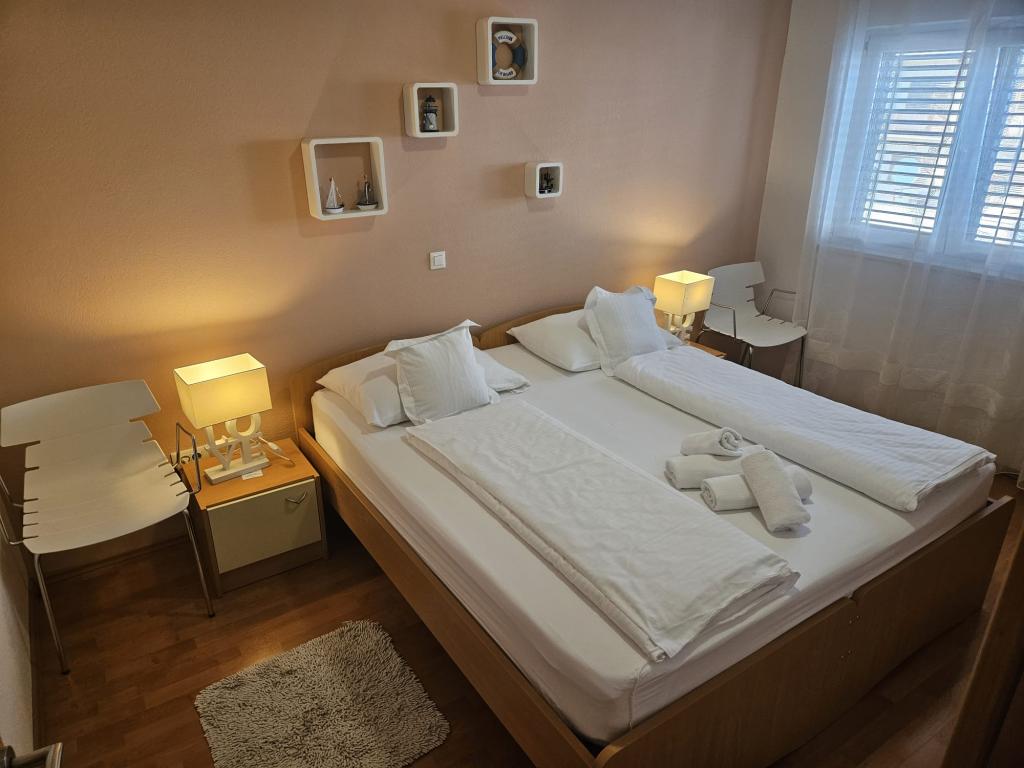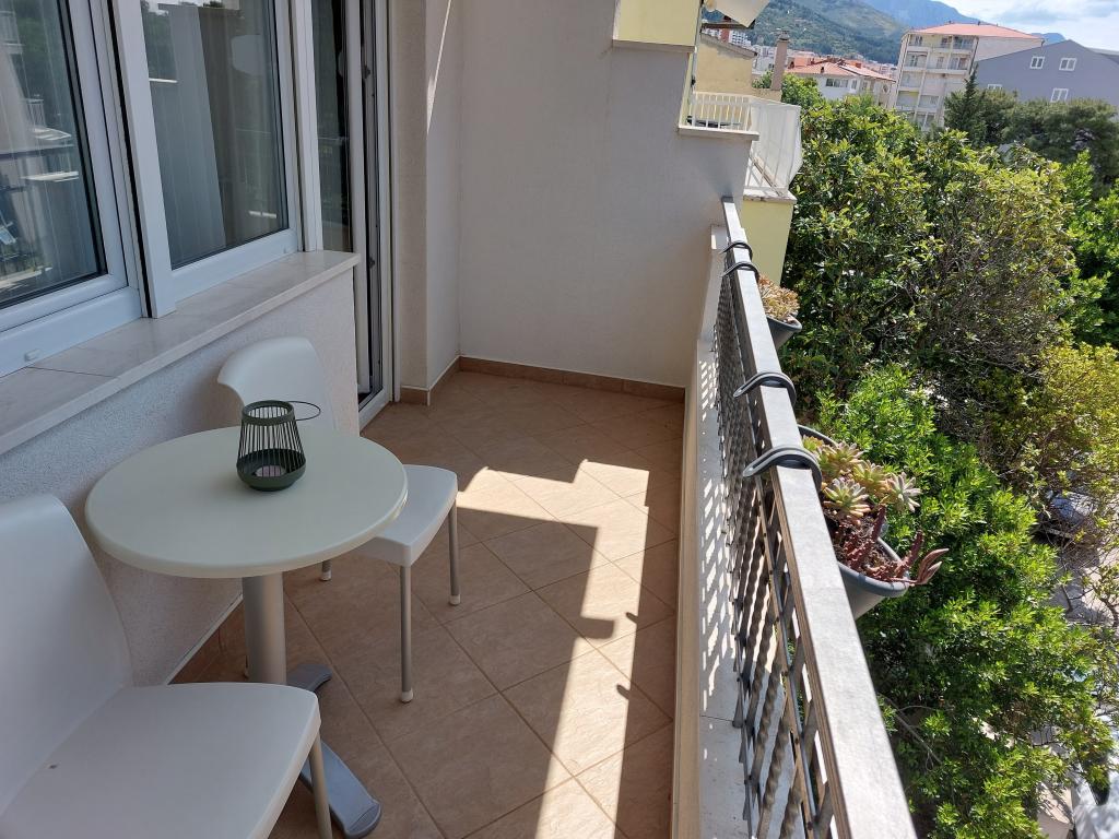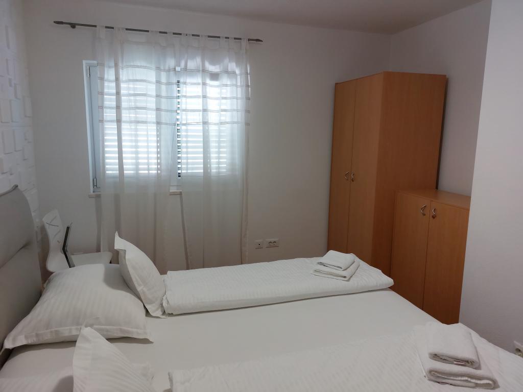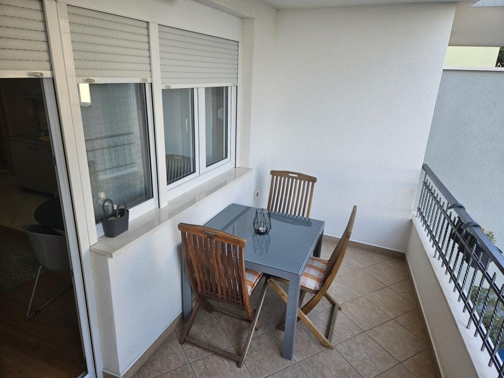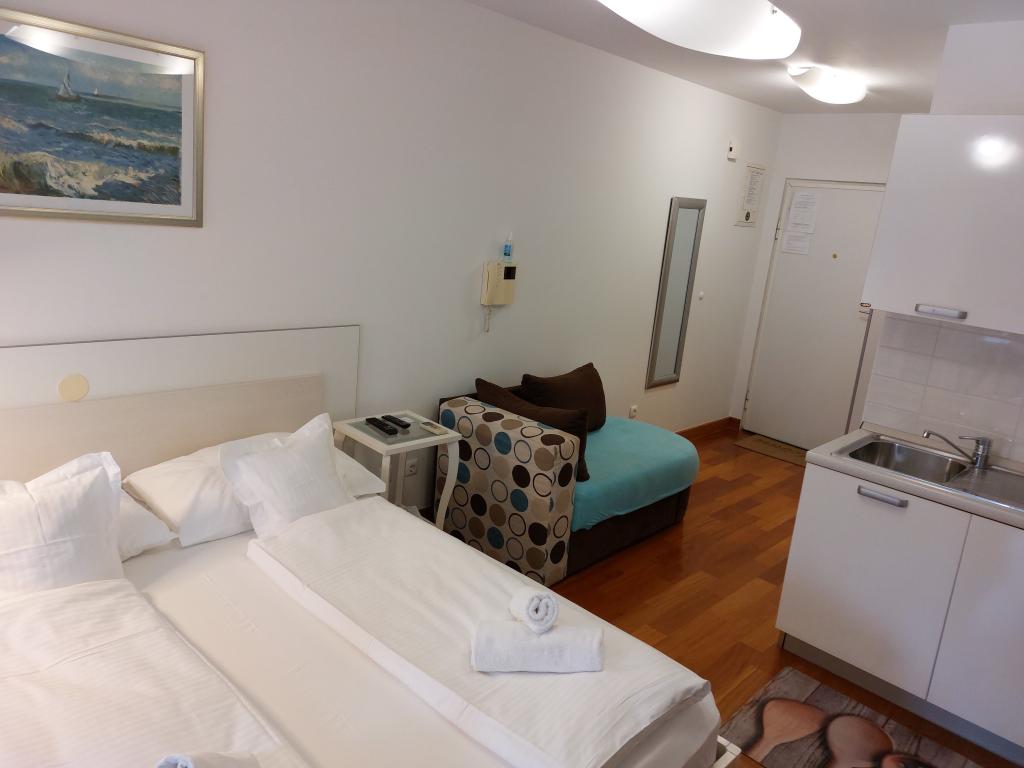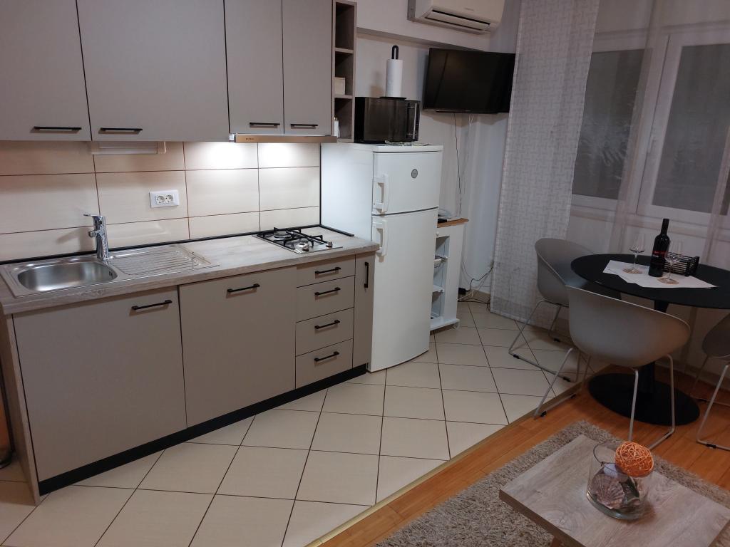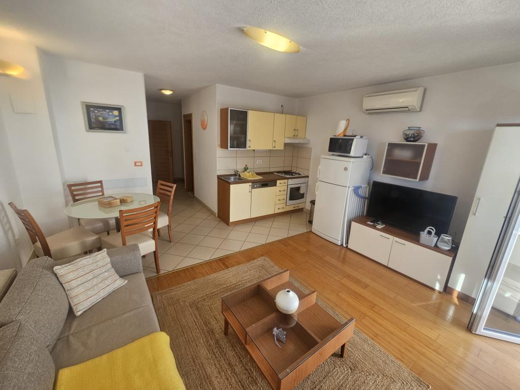 Our apartments are modern and fully equipped to make your stay as comfortable and carefree as possible. Each apartment includes an iron and ironing board, hairdryer, filter coffee maker, kettle, microwave. Guests also have access to complete utensils for preparing and serving food. All accommodation units have a flat-screen TV, free Wi-Fi, indoor and outdoor seating and relaxation areas. The accommodation units are air-conditioned. Parking must be reserved in advance due to the limited number of parking spaces within the facility. Fresh bed linen and towels await you upon arrival, which are changed as agreed. A baby cot, with prior notice, is available in this facility and is free of charge. Within the facility there is a shared courtyard with seating furniture, surrounded by Mediterranean plants - an ideal place to relax. The facility is located in a quiet area, in the second row from the sea, just a 2-minute walk to the beach and a ten-minute easy walk to the center.