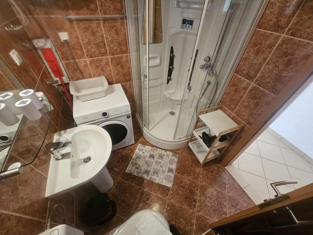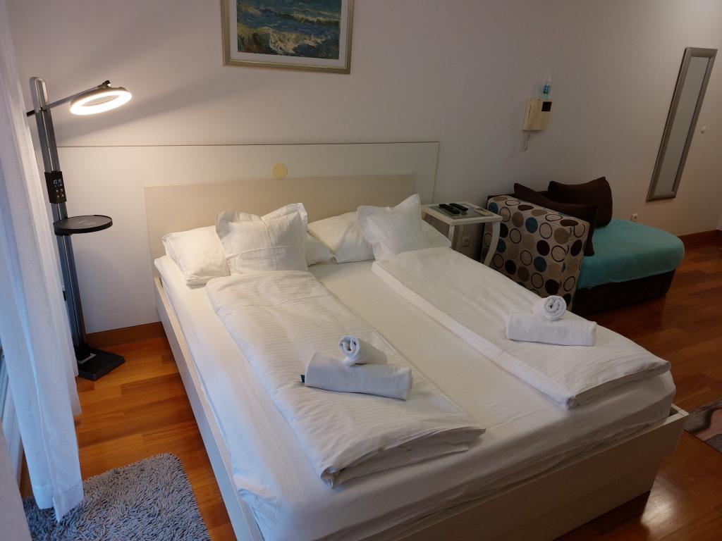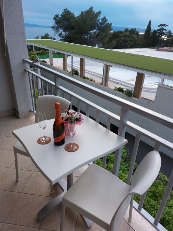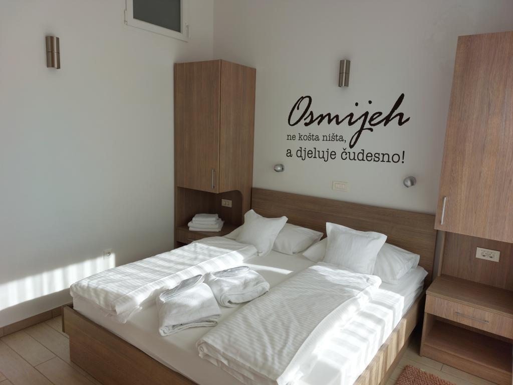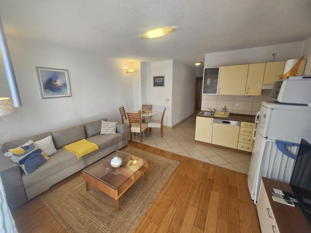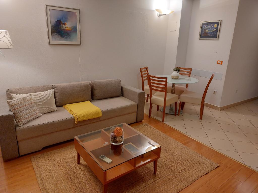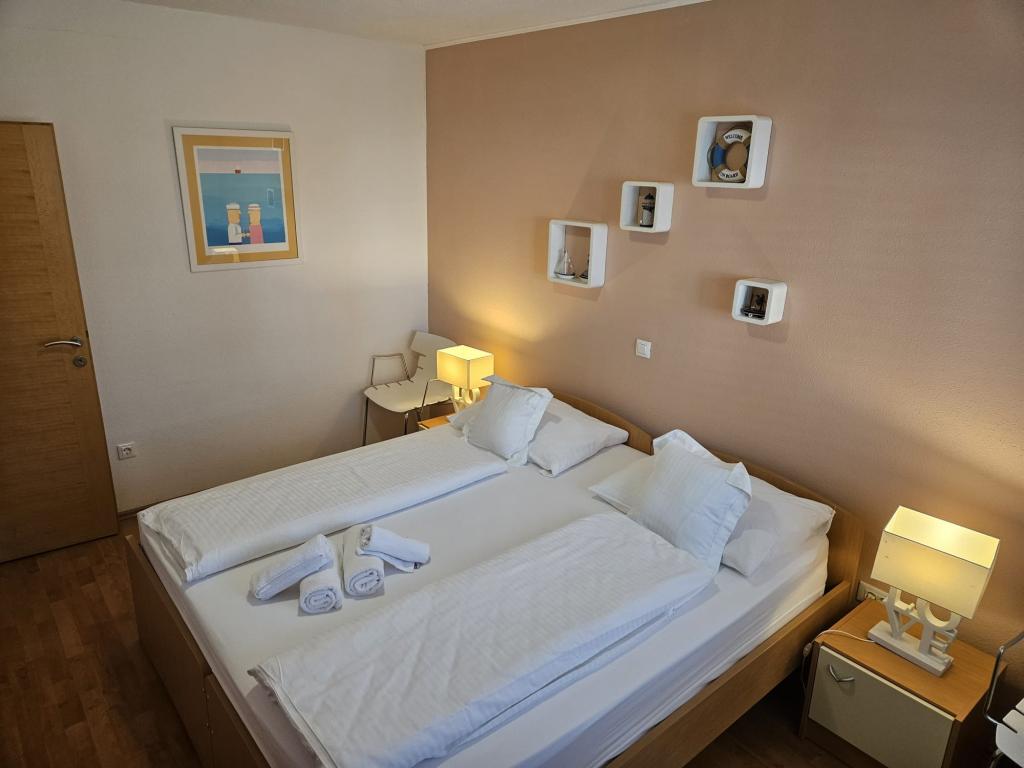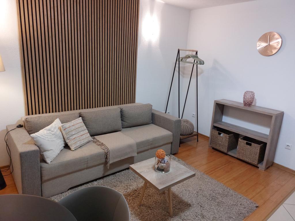 Our apartments are modern and fully equipped to make your stay as comfortable and carefree as possible. Each apartment includes an iron and ironing board, hairdryer, filter coffee maker, kettle, microwave. Guests also have access to complete utensils for preparing and serving food. All accommodation units have a flat-screen TV, free Wi-Fi, indoor and outdoor seating and relaxation areas. The accommodation units are air-conditioned. Parking must be reserved in advance due to the limited number of parking spaces within the facility. Fresh bed linen and towels await you upon arrival, which are changed as agreed. A baby cot, with prior notice, is available in this facility and is free of charge. Within the facility there is a shared courtyard with seating furniture, surrounded by Mediterranean plants - an ideal place to relax. The facility is located in a quiet area, in the second row from the sea, just a 2-minute walk to the beach and a ten-minute easy walk to the center.