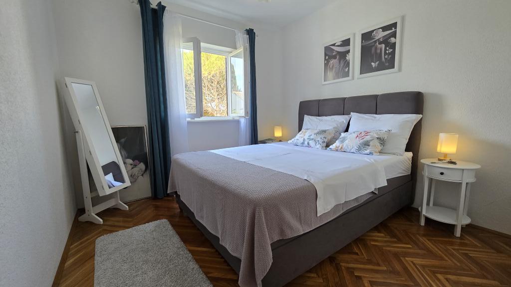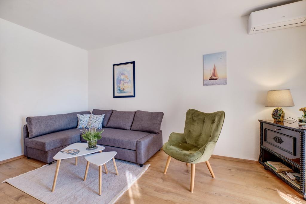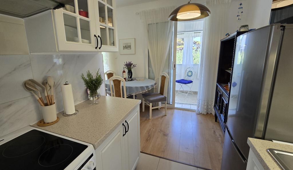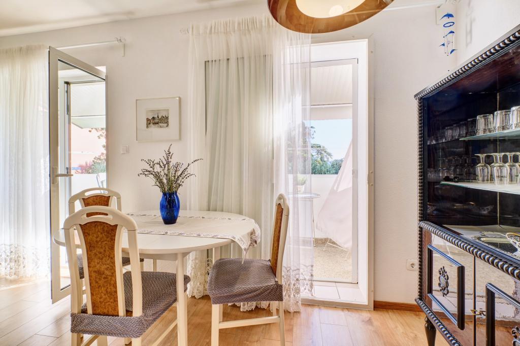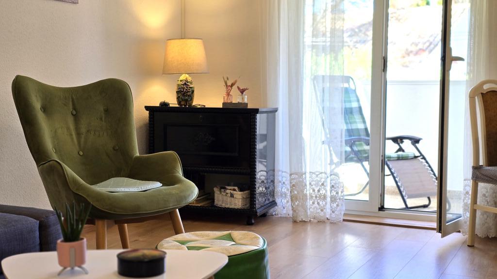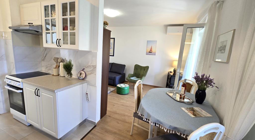 Apartment Blanka 1 is ideal for your vacation, it can accommodate 3 people. It offers you a bedroom with a double bed, an additional bedroom for one person, a living room, a dining room, a kitchen and a bathroom. A spacious terrace overlooking the garden provides additional space for relaxation and socializing. Additional amenities include WiFi, air conditioning and private parking, making this apartment a practical and comfortable choice for your stay.