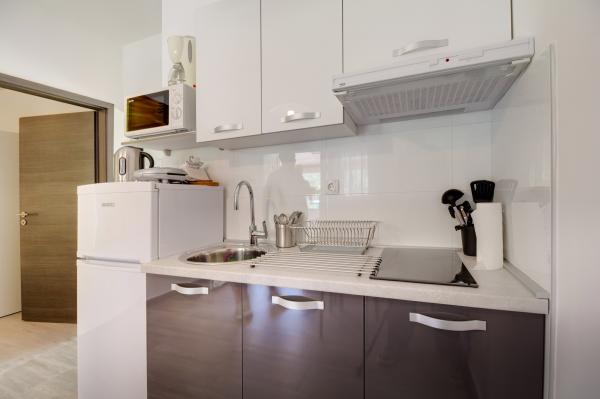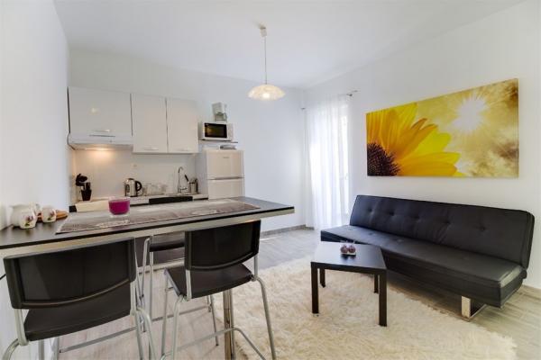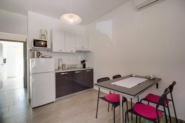 Upon arrival, the apartment was not satisfactorily cleaned, let's say 2/5 (a layer of dust under the beds in both rooms, food remains on the cooking utensils, a couple of mosquito remains on the tiles in the bathroom, the terrace not cleaned). The location of the apartment is excellent (close to shops, promenade). Since there is a restaurant under the apartment late at night, the smell of cooking oil is quite intense. I do not recommend staying for families with one/two children, it is more for couples without children. It is quite warm in the apartment despite the air conditioning, so I do not recommend staying for older people.