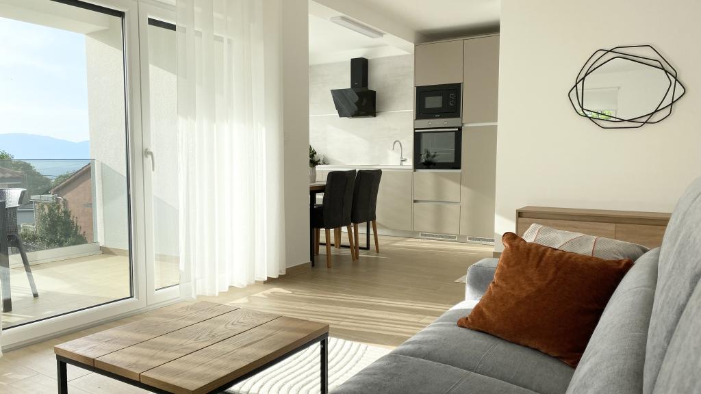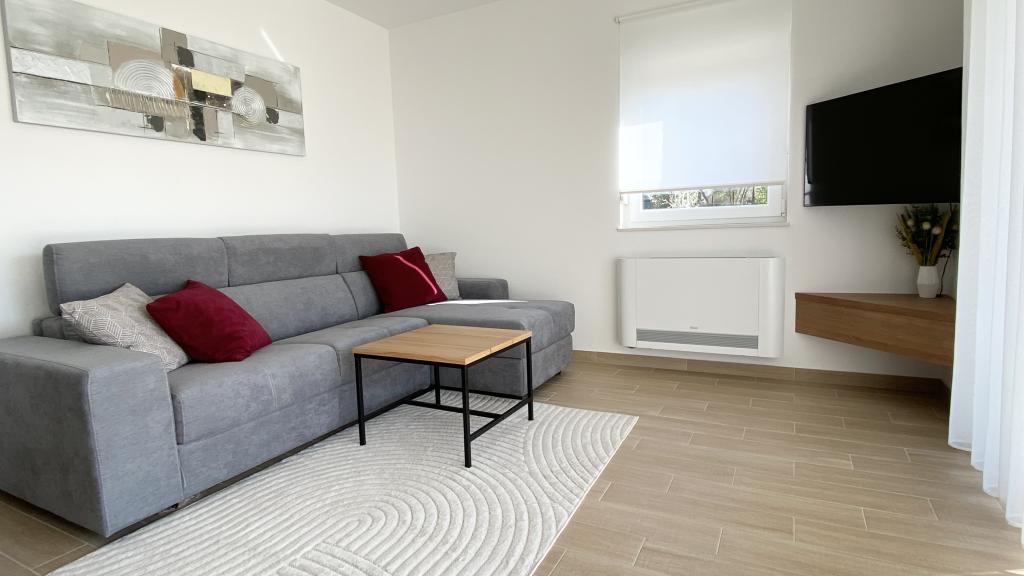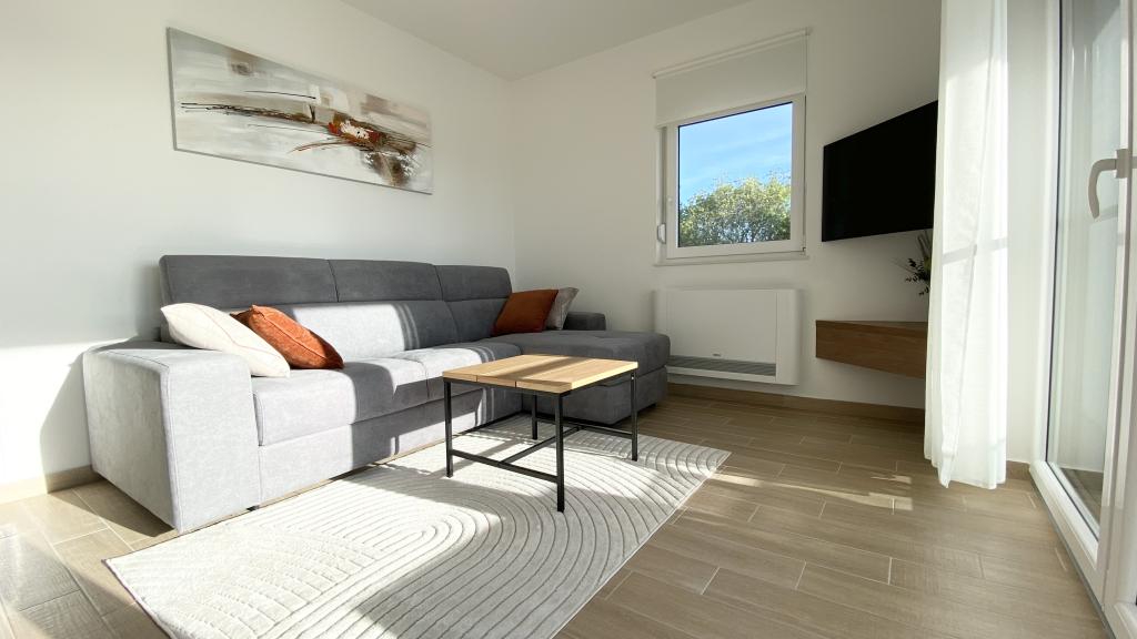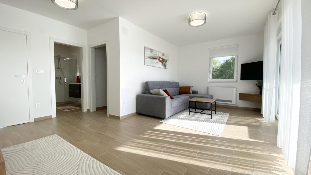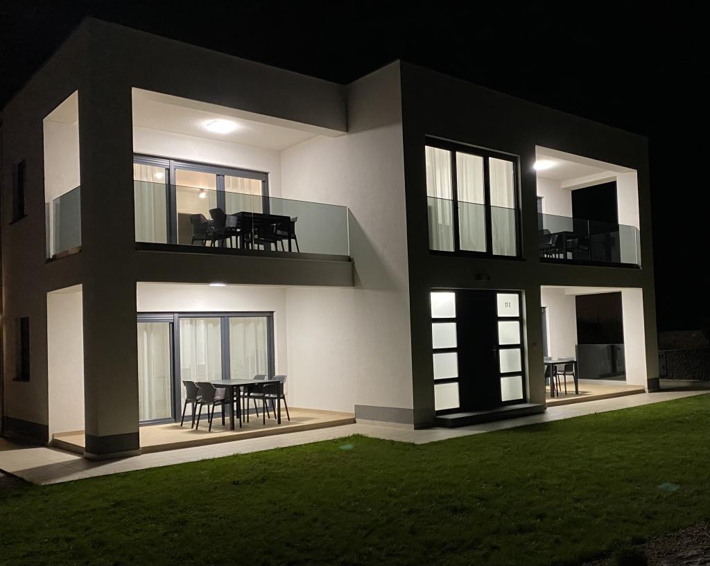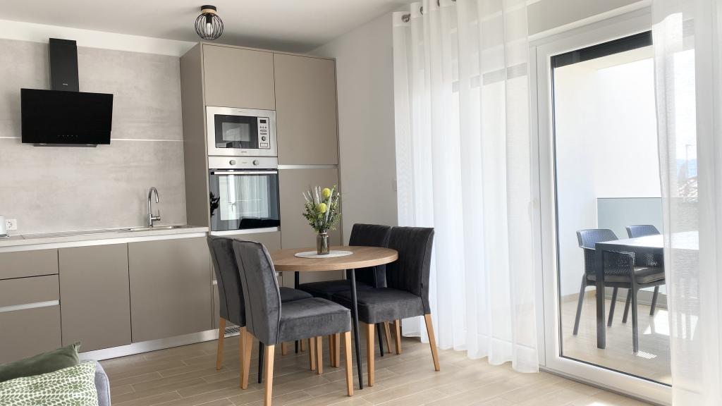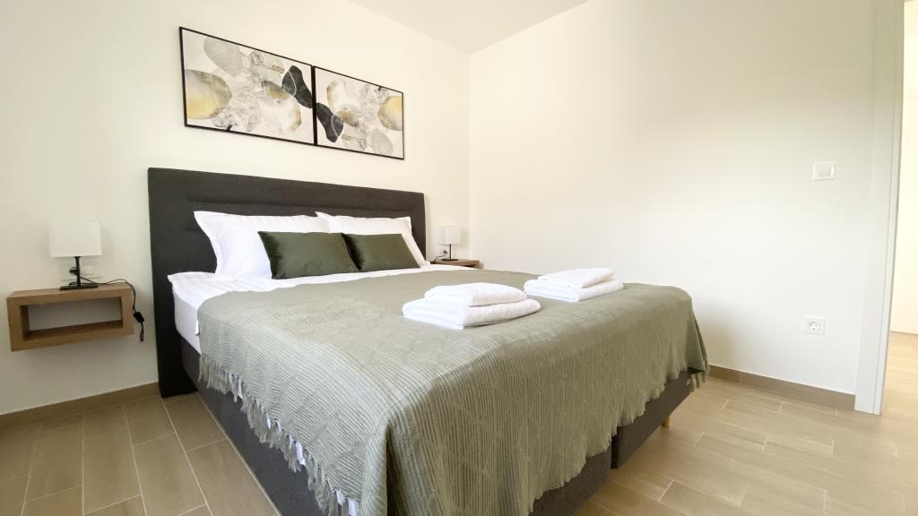 Villa Malina is a new apartment house located in a quiet part of the village. It has three modernly equipped apartments of 50, 55 and 60 m2 with separate entrances and secured parking spaces in the yard. Each apartment has a living room, bedroom, bathroom, kitchen and a covered terrace. In the living room there is a sofa bed that can be used as an extra bed for two people. The kitchen is equipped with dishes, kitchen towels, oven, microwave, refrigerator with freezer, kettle, electric stove, toaster and dishwasher. Additional equipment includes internet connection, air conditioning in every room, vacuum cleaner, washing machine, hairdryer and mosquito nets on all windows. A free baby cot is available on request. Guests have access to a shared terrace with barbecue and an outdoor shower. For stays of 10 days or more, a 10% discount is available.