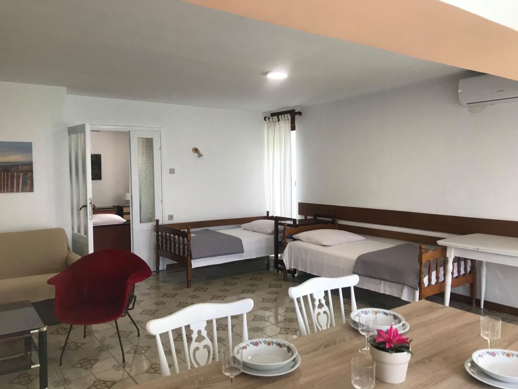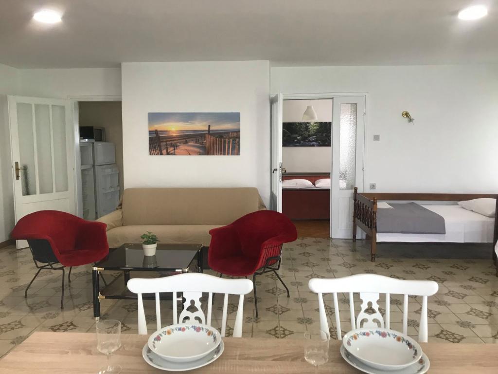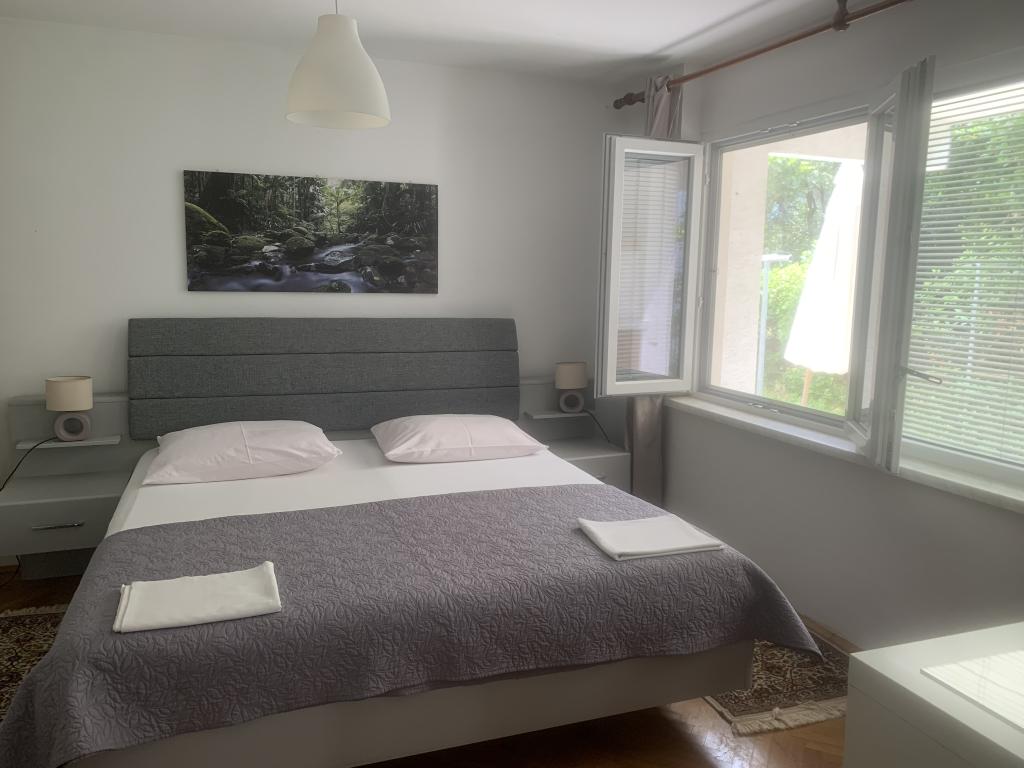 Residential tax is included in price. Booking confirmation document upon reservationApartment 2+2 (55 m2) is located on the ground floor and consists of a bedroom with a double bed, while two extra beds are located in the living room (two beds with mattresses). The kitchen is equipped with dishes, a refrigerator with a freezer, a microwave, an electric stove with an oven, a kettle and a coffee machine. The apartment has a front and back terrace. Pets are welcome at an additional cost of €5 per day per pet. ------------------------------------------------------------------ Apartment 4+2 (85 m2) is located on the first floor and consists of 2 bedrooms with double beds, while 2 extra beds are located in the living room. The apartment has a bathroom (shower/toilet) and a separate toilet. The kitchen is equipped with dishes, a double refrigerator with a freezer, a microwave, an electric stove with an oven, a kettle and a filter coffee machine. The apartment has a large terrace on the front facing the courtyard and a balcony facing the garden.