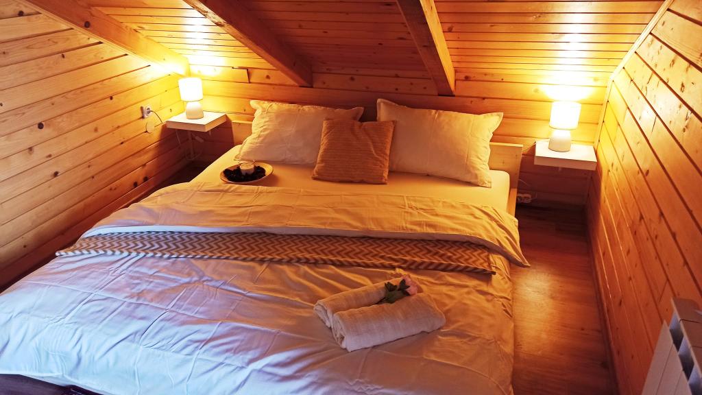Holiday Home King's Lodge is a wooden oak house located in Hrvatsko Zagorje with a view of the Ivanščica mountain ... At your disposal: - 3 separate bedrooms - 2.5 bathrooms - spacious living room with fireplace - sauna - barbecue with covered terrace - room for socializing and playing (darts, billiards, PS, board games...) - outdoor fireplace - children's playground - children's corner and reading corner
