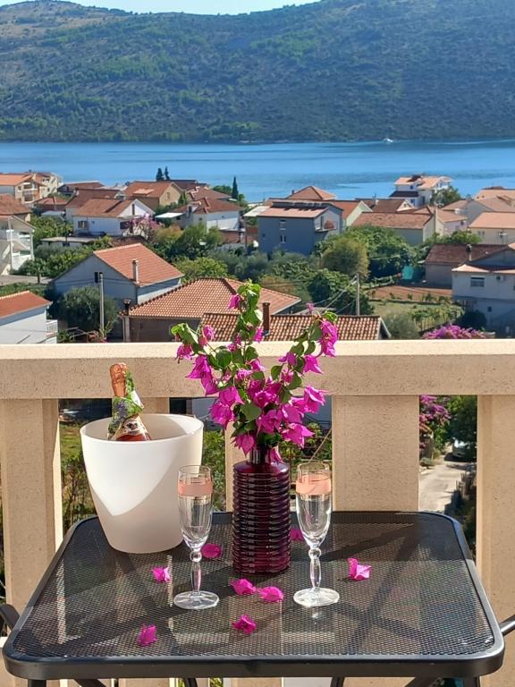 Fully equipped and modern apartments in a quiet part of Poljica with a beautiful view of the sea and the Marina bay. At your disposal a large apartment for 2-8 people with Velka balcony overlooking directly to the sea from the south side and a large terrace on the north side, which also has a sea view and is equipped with garden furniture, sun loungers and parasols, ideal for lunch and afternoon rest. The terrace is connected directly to the parking lot which is free and a small basketball court. The apartment has three bedrooms with a double-double beds, of which one room has an extra bathroom. Large spacious hallway, bathroom, kitchen and living room. In the garden there is a fireplace -gril that you can use at any time. Small apartment for 2 people has an extra entrance and private terrace surrounded by flowers and greenery, offering a breathtaking view of the sea ... Both apartments are situated in a quiet place so that you can enjoy the peace and quiet ...
