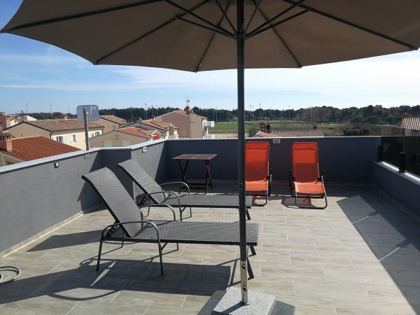 First of all, the booking, the communication between us and the owner, and finally the payment went without any hassle. This was our first great impression. Then, when we arrived, finding the apartment was a bit tricky (the whole area is filled with new, astonishing little buildings - great zone of town), but the owner helped on phone. The building is very tidy, the apartment was clean (as almost we would have stepped into a totally new place), the furnitures are new, modern, including all extra stuff (kitchenware, washing machine, air conditioner...etc.)... all in all, it can not measure up to some previous experiences. Ceja is great and it is optimal for younger people and for families as well. The windows close out the slightest party sounds of the town. The terrace has a gorgeous view of the surroundings. WiFi is available (don't expect fast HD streams from Youtube however, haha!), two parking space is available in the garden (shared with the apartment below), but there is a parking lot just beyond after the fence, so if any extra car is present (due to a 6 person stay, for example) you could see your car 20m from the terrace. The sea is literally 100m away, which means a 2 minute walk down to the rocky beach (which is IMO the greatest along the coastline), and the town center is also not too far (1,5~2 km, 15 minutes of walk along the coast). The owner was very helpful, he is always in the vicinity, so anything question arises, he could help you. We were there with 6 adult person, which is still manageable (but dont expect too much about the convertible double sofa in the living room). All in all, the modern outlook, the clean and exceptionally prepared rooms guaranteed a pleasure stay in Medulin. The apartment is a great-great value for its price!