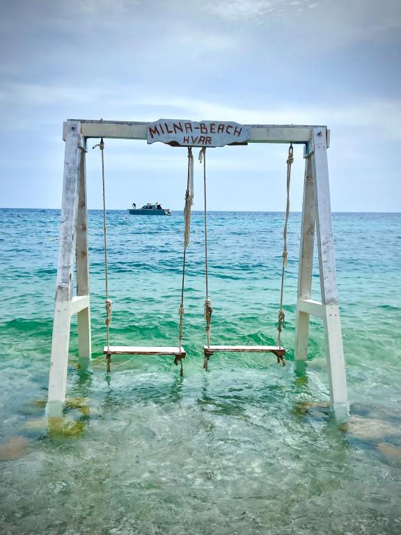Double and quadruple apartments, and an apartment with a large terrace, are located in a quiet part of Milna. It is located 5 minutes from the center and the first beach. Suitable for families with children. The proximity of the town of Hvar (3 km) is also suitable for young people where during the day they enjoy the benefits of the small town of Milna and hidden bays for swimming, and at night the town of Hvar provides them with unforgettable night entertainment.