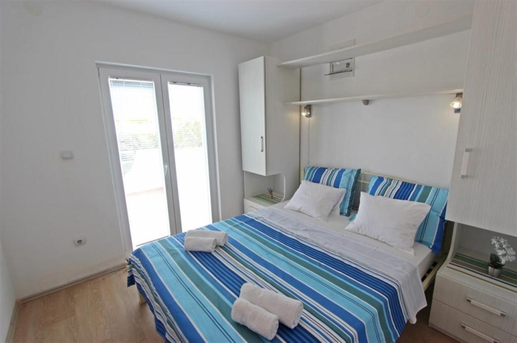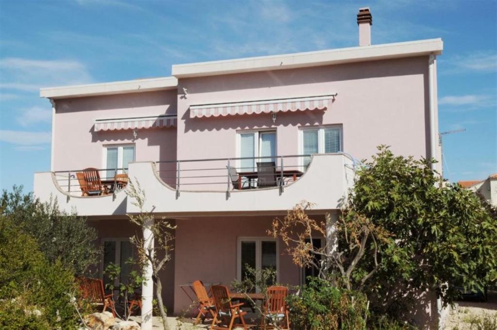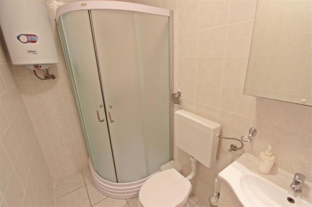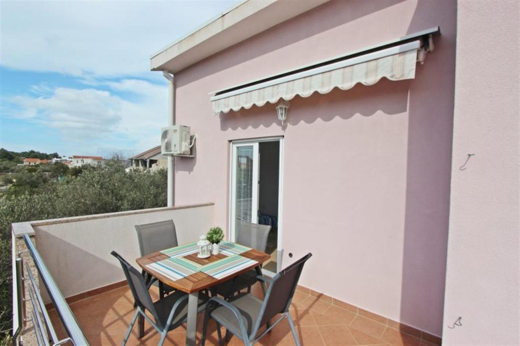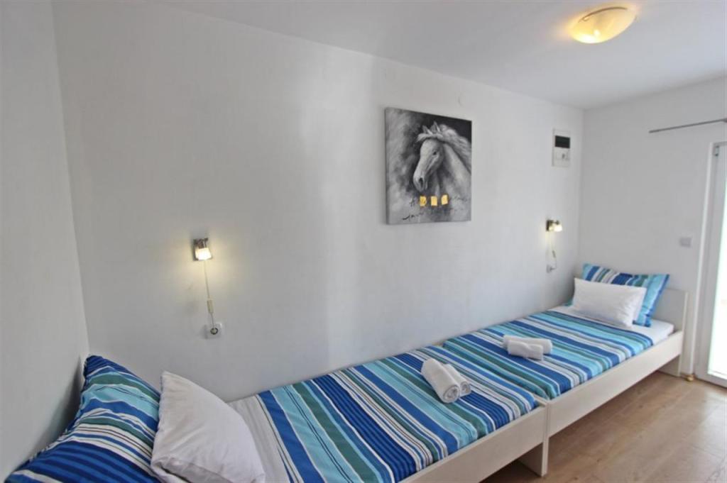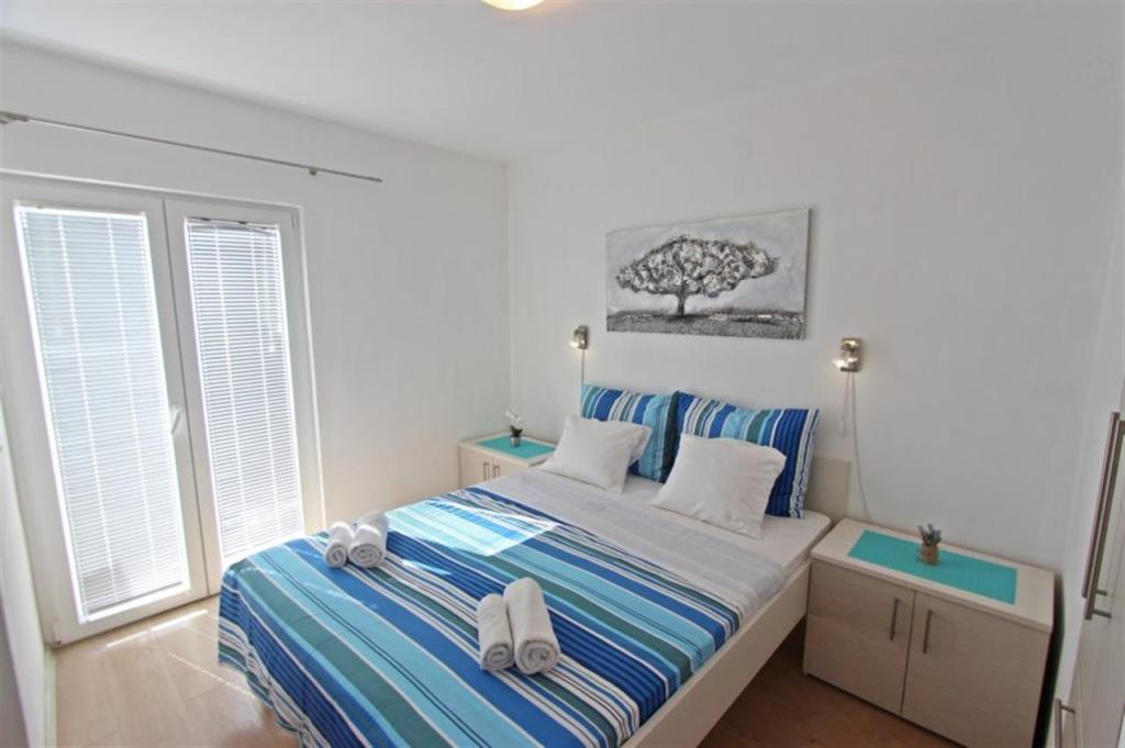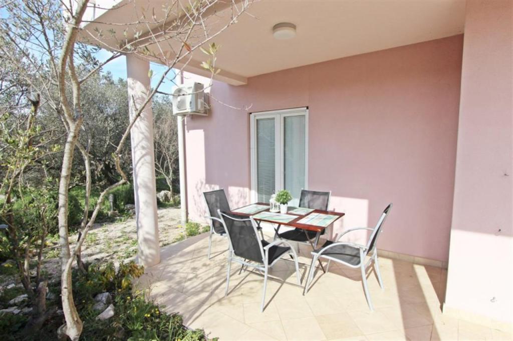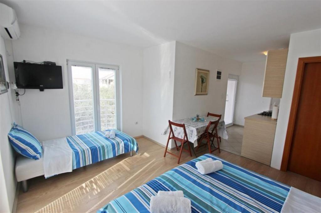 Apartments for four persons 2 + 2 or studio apartments 2 + 1. They consist of a bedroom (one double bed) and a room with two single beds (dimensions 200x90) or a bedroom and a bed in the living room, while studio apartments consist of a double bed with extra bed, kitchen, bathroom and large terrace (15m2 / 18m2). Also, on the ground floor there is a room with a washing machine that guests can use. The apartments are equipped with TV and air conditioning, wi-fi, microwave and refrigerator with freezer. In front of the apartment we have an outdoor grill that guests can use at any time. Parking is provided and located in the yard. The distance to the first beach and shops is 250 m while the center is 1 km away