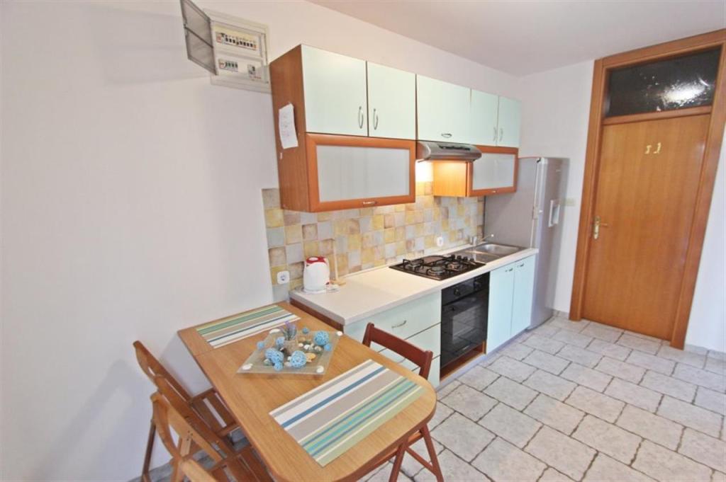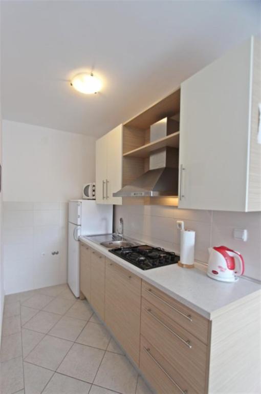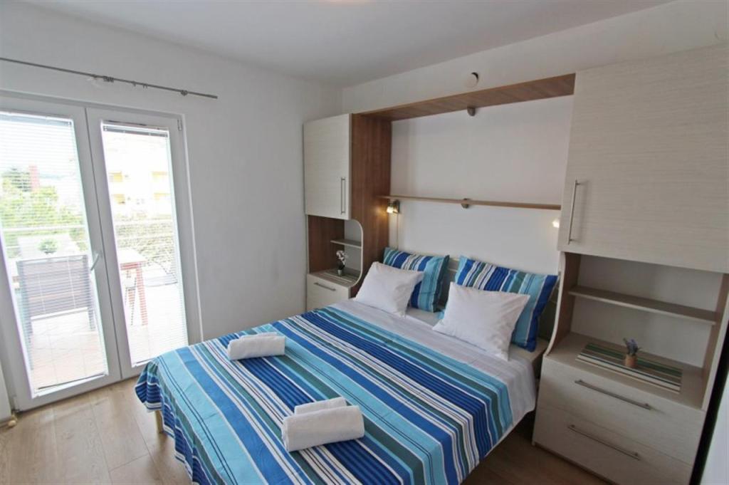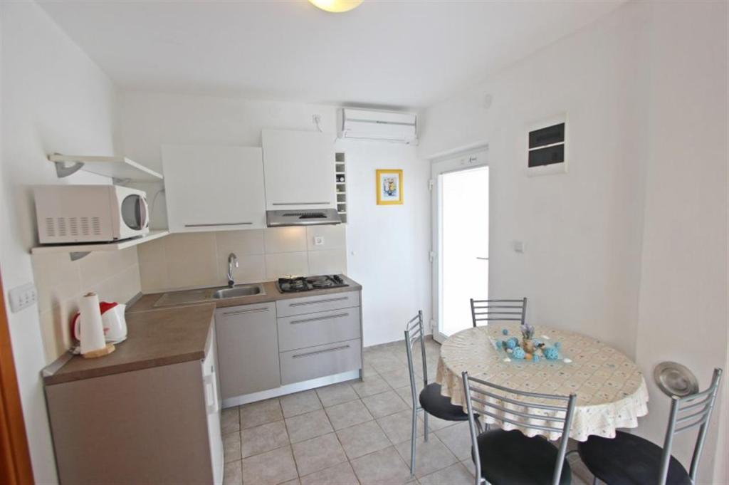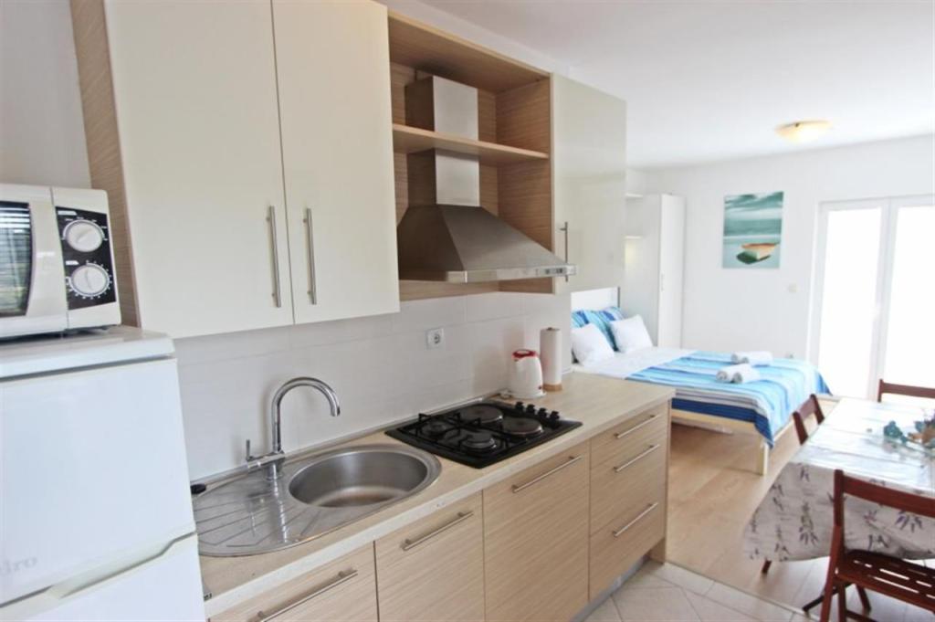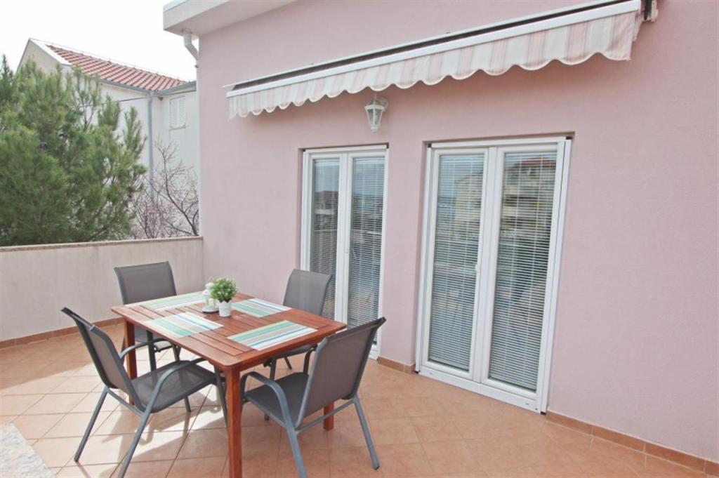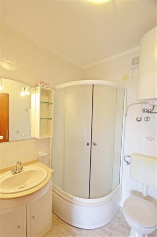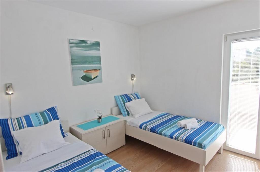 Apartments for four persons 2 + 2 or studio apartments 2 + 1. They consist of a bedroom (one double bed) and a room with two single beds (dimensions 200x90) or a bedroom and a bed in the living room, while studio apartments consist of a double bed with extra bed, kitchen, bathroom and large terrace (15m2 / 18m2). Also, on the ground floor there is a room with a washing machine that guests can use. The apartments are equipped with TV and air conditioning, wi-fi, microwave and refrigerator with freezer. In front of the apartment we have an outdoor grill that guests can use at any time. Parking is provided and located in the yard. The distance to the first beach and shops is 250 m while the center is 1 km away