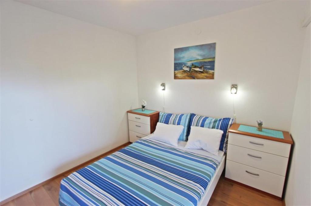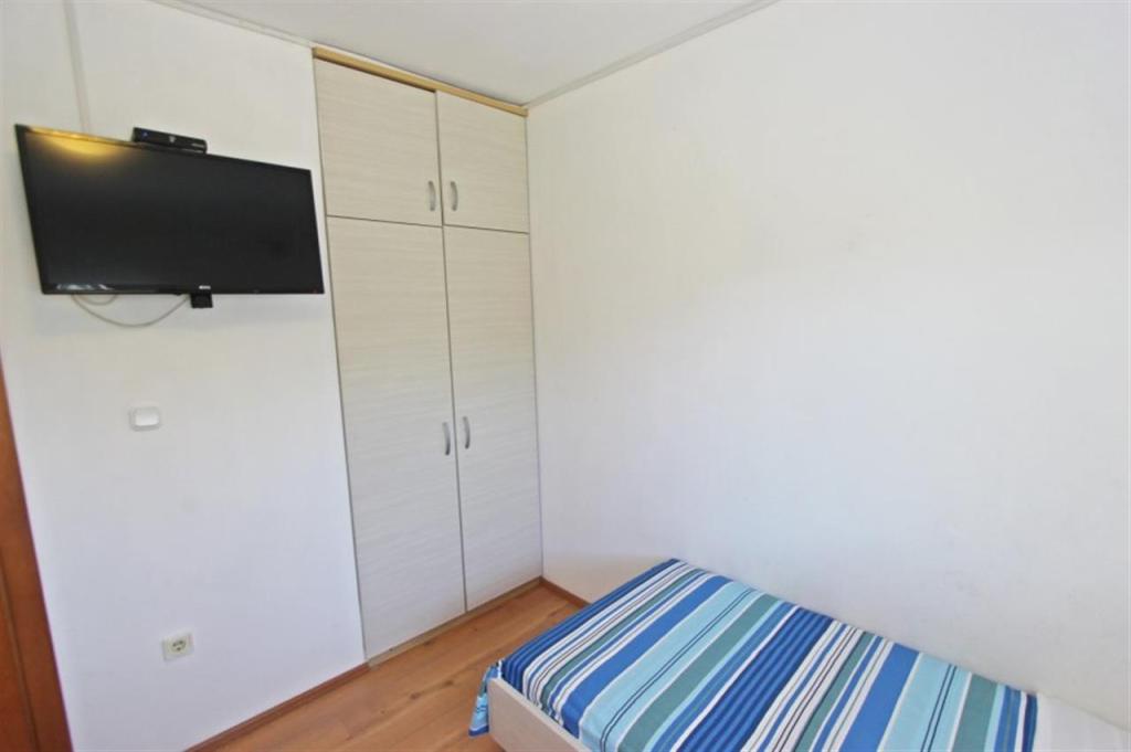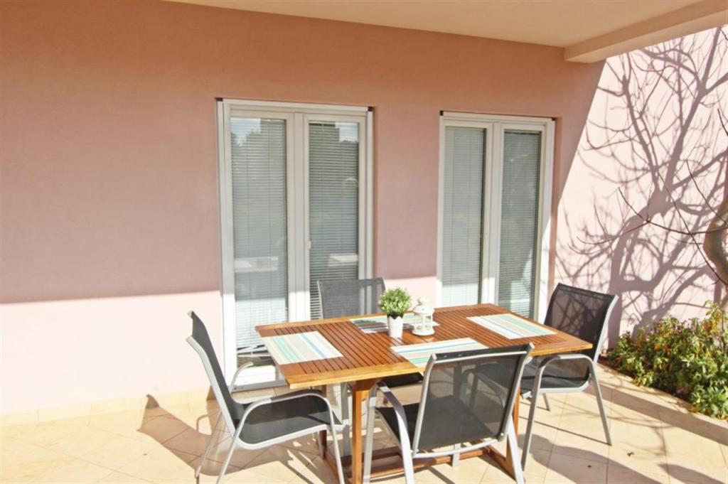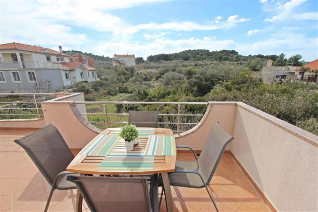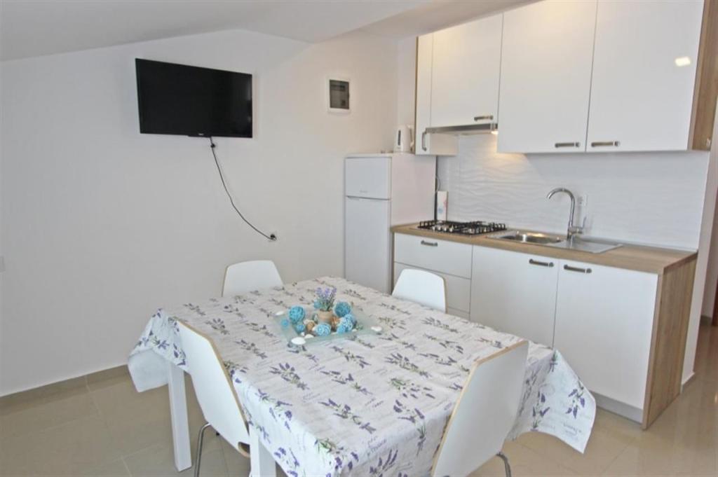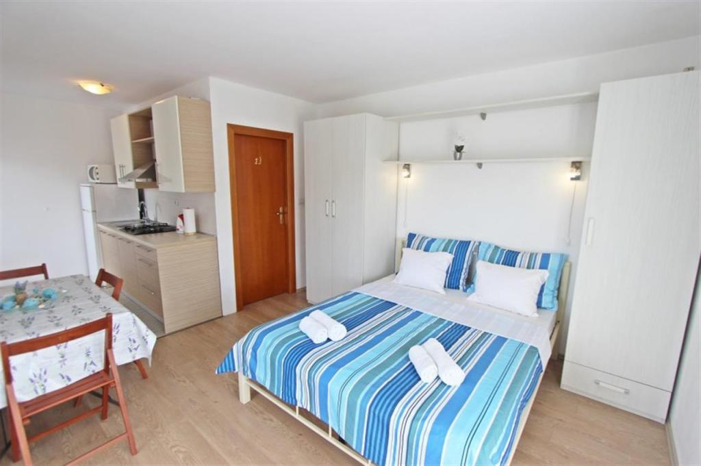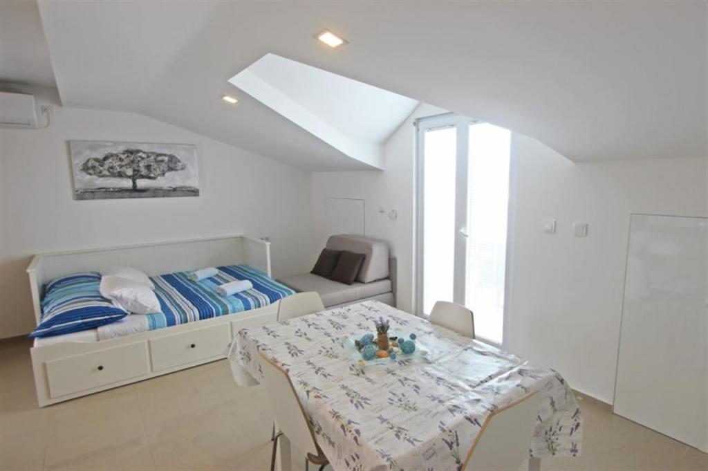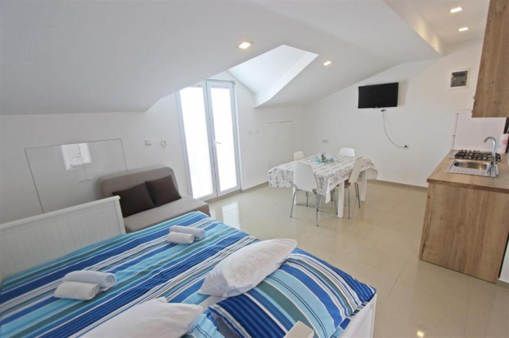 Apartments for four persons 2 + 2 or studio apartments 2 + 1. They consist of a bedroom (one double bed) and a room with two single beds (dimensions 200x90) or a bedroom and a bed in the living room, while studio apartments consist of a double bed with extra bed, kitchen, bathroom and large terrace (15m2 / 18m2). Also, on the ground floor there is a room with a washing machine that guests can use. The apartments are equipped with TV and air conditioning, wi-fi, microwave and refrigerator with freezer. In front of the apartment we have an outdoor grill that guests can use at any time. Parking is provided and located in the yard. The distance to the first beach and shops is 250 m while the center is 1 km away