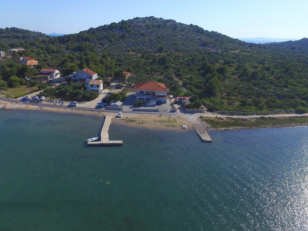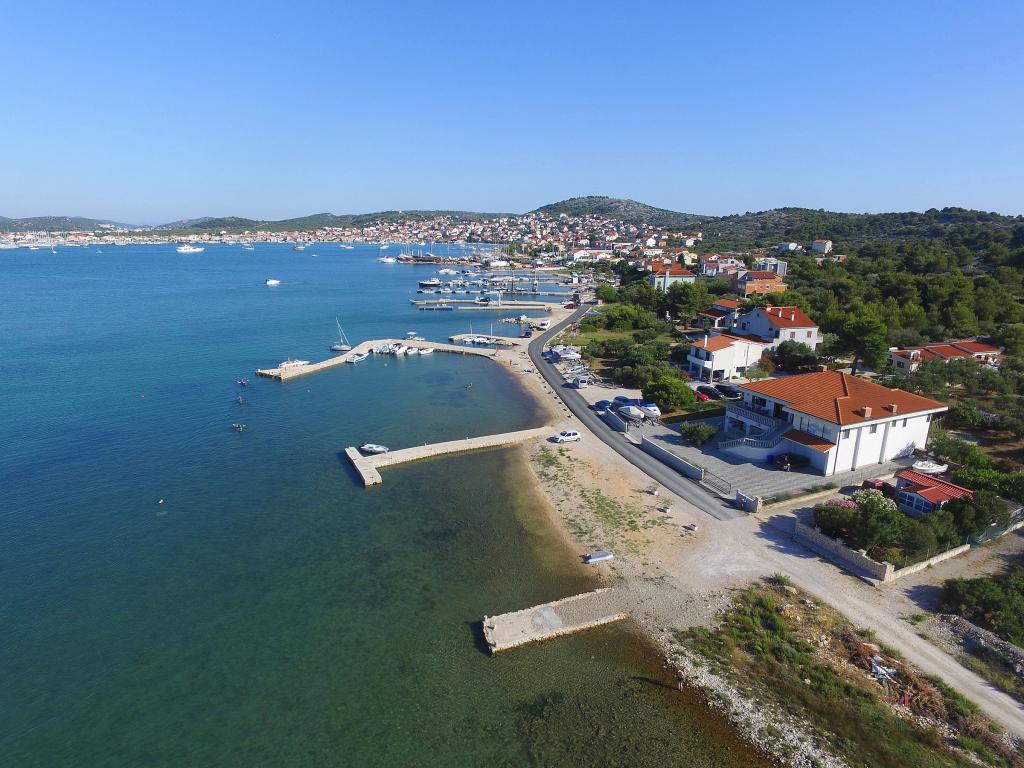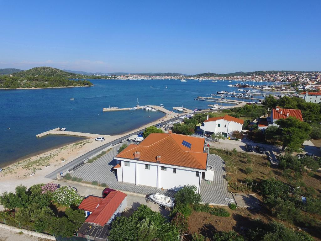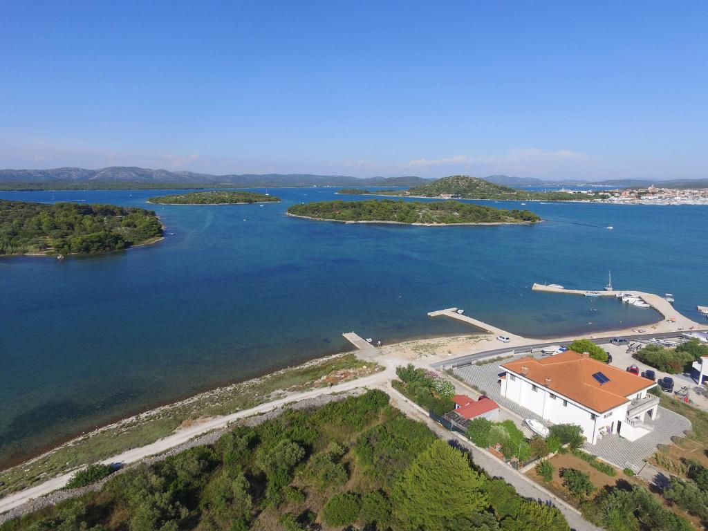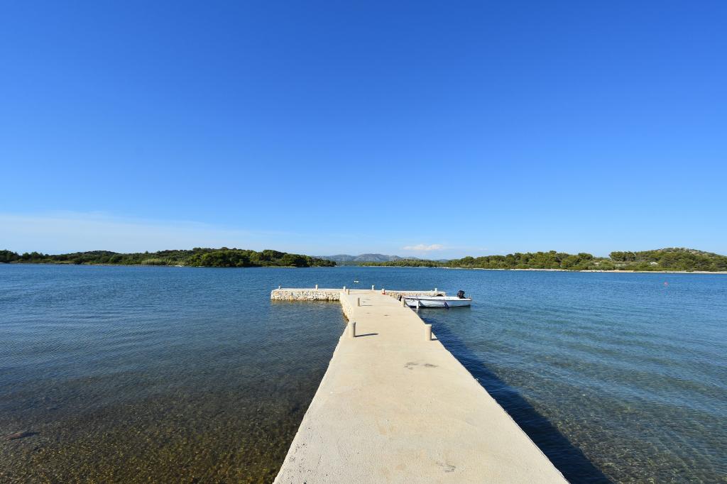 Apartments Milan are located directly by the sea. The house is located in a large olive grove at the end of the street, so the location is quiet and with little traffic. The road continues with a promenade along the sea around the island, perfect for relaxing walks and finding a secluded spot for swimming. In front of the house is a pier where you can moor your boat. On the shore, guests can enjoy swimming and sunbathing. The apartments have a view of the islets in front of Murter. The center of Murter starts about 1 km from the house, where you can find shops and restaurants.