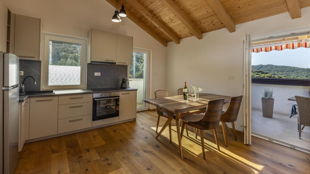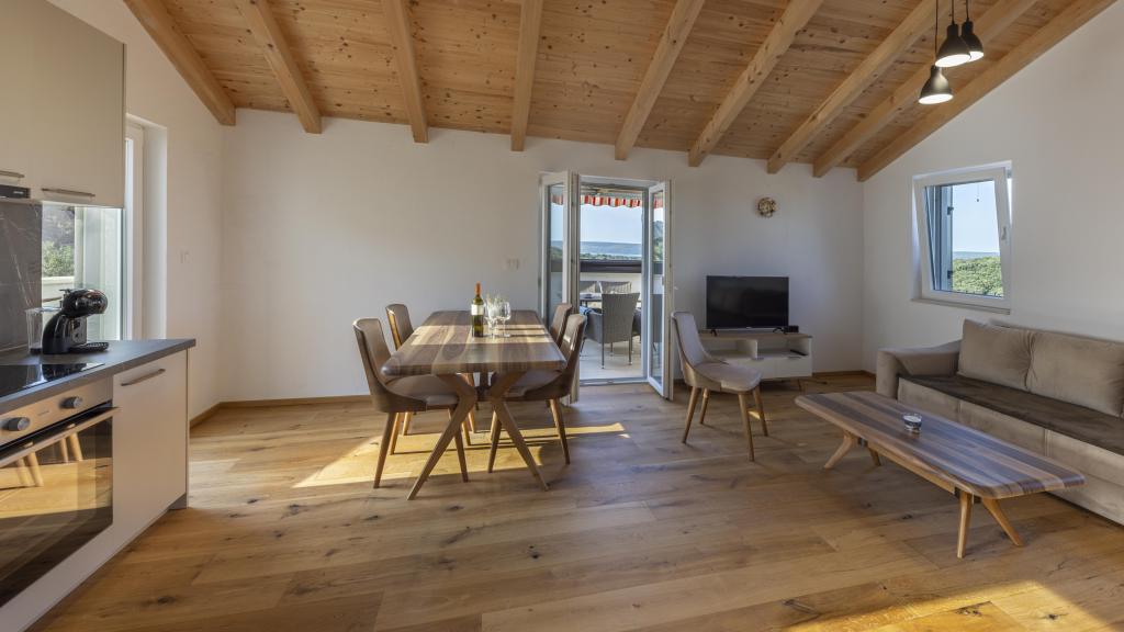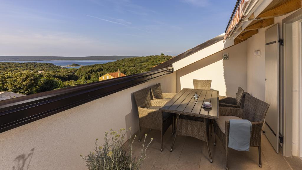 Apartment Sabina is located in Villa Ancora in Sveti Jakov, a quiet fishing village. The new apartment is located in a high attic, modernly equipped with all the necessary facilities. The apartment offers free bed linen, towels, Wi-Fi internet, LCD SAT TV, ironing equipment, hair dryer, coffee machines for espresso and filter coffee, free parking space, and in the common yard there is a barbecue with garden furniture. The apartment consists of a hallway, 2 bedrooms, a bathroom with a washing machine, a kitchen with complete dishes and appliances, a dining room, a living room with a sofa, a balcony and a spacious terrace with a view of the sea. There are fantastic beaches nearby, which are a few minutes' easy walk away. (Lanena, Faldomak, Studenac 600m - 800m), restaurants, numerous tourist and sports facilities and cultural sights of the island. Surroundings Museum of Apoxyomena in M. Losinj Ancient city of Osor Kula in Veli Losinj Aqua park Čikat in M. Losinj Institute for the protection of dolphins Blue World in Veli L.