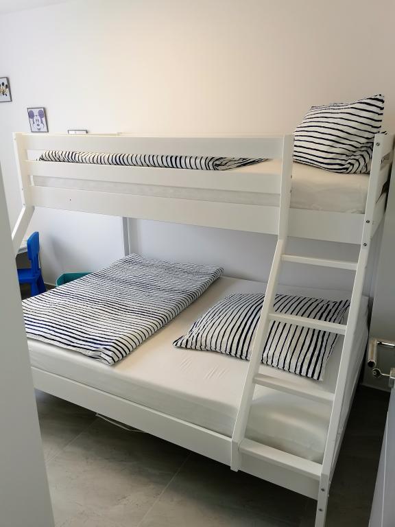 LE apartment equipment 87m² of living space • Parking next to the house • Complete bedding • Baby travel cot including mattress 60x120cm • Large bathroom with floor-level shower • Washing machine + drying rack • Hairdryer • Towels The open living room is equipped with a sofa bed, satellite TV and Smart TV • Dishwasher • Oven • Electric stove • Refrigerator with freezer compartment • Coffee machine with thermos jug • Toaster • Kettle • Heaters for baby bottles and porridge • For our youngest guests we have a high chair with children's dishes • Guest toilet • Air conditioning on each floor • Free WiFi throughout the house • Vacuum cleaner • 2x bicycles • Electricity and water included Outdoor space beautiful covered terrace with an open wooden terrace, ideal for children and dogs, fully fenced • Garden furniture with cushions • Sun loungers with cushions • Parasol and awning​ • Magic solar shower • Barbecue fireplace • Sand toys • Jacuzzi boat • Buoy 150 meters from the house