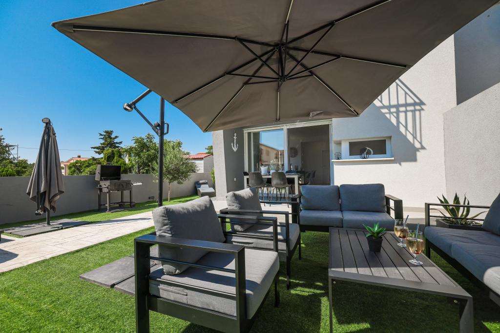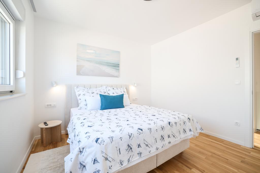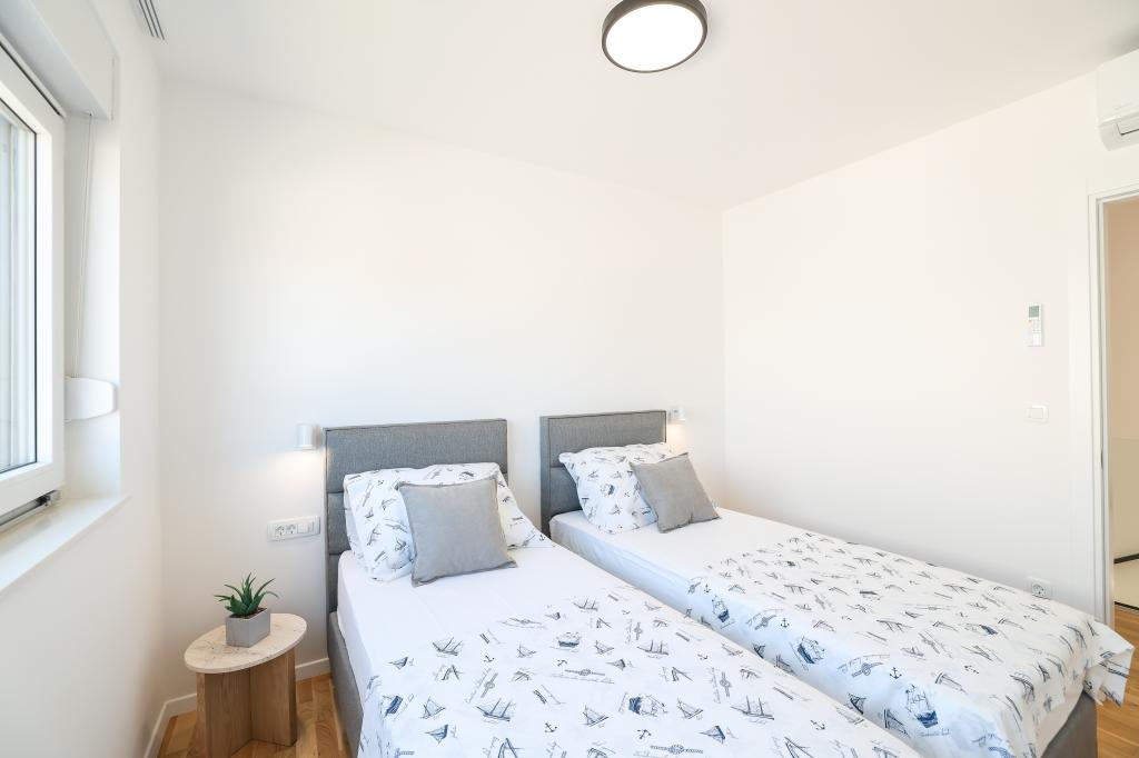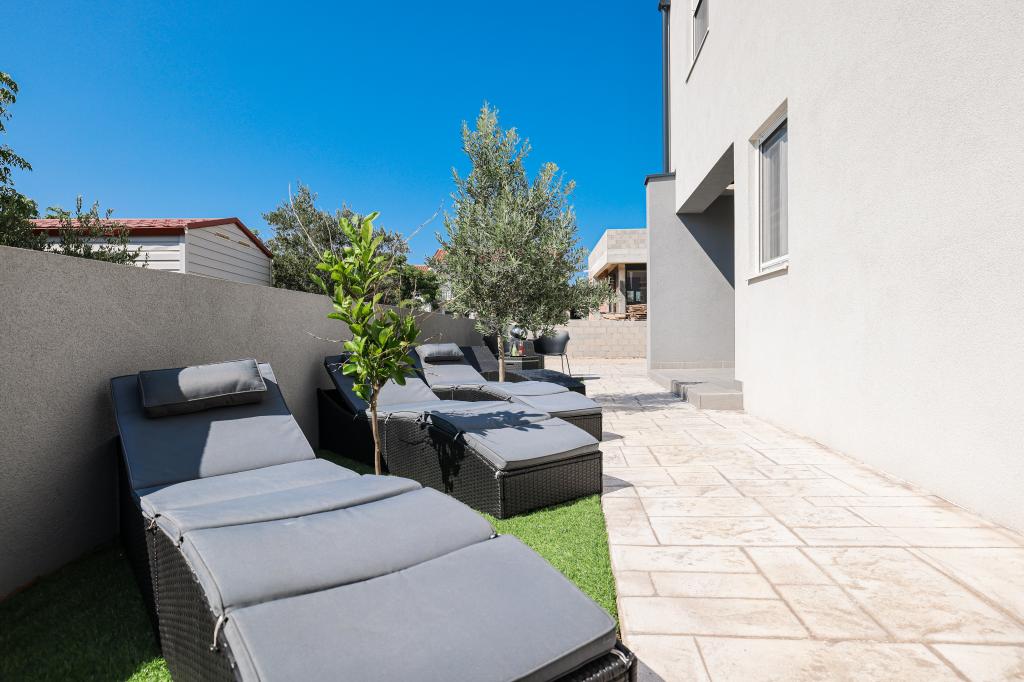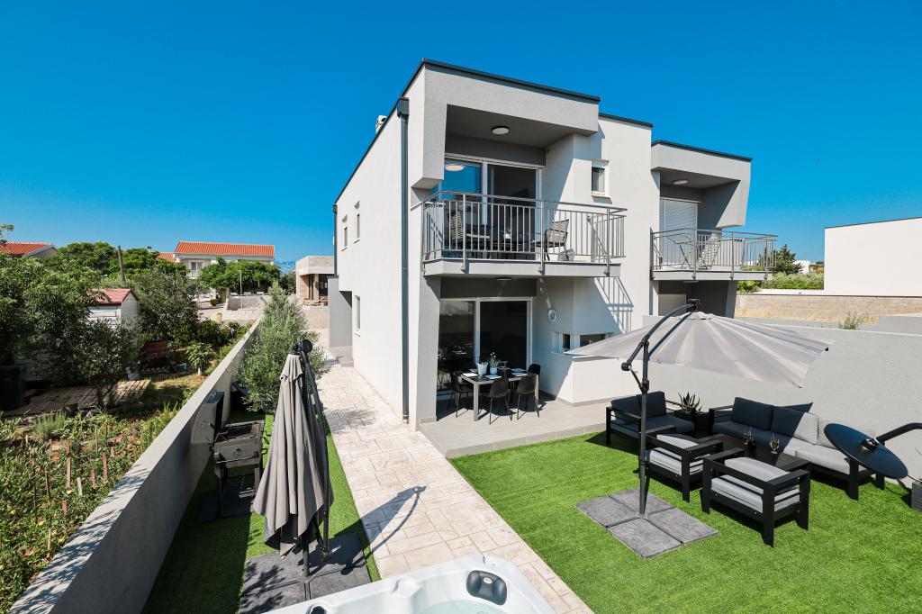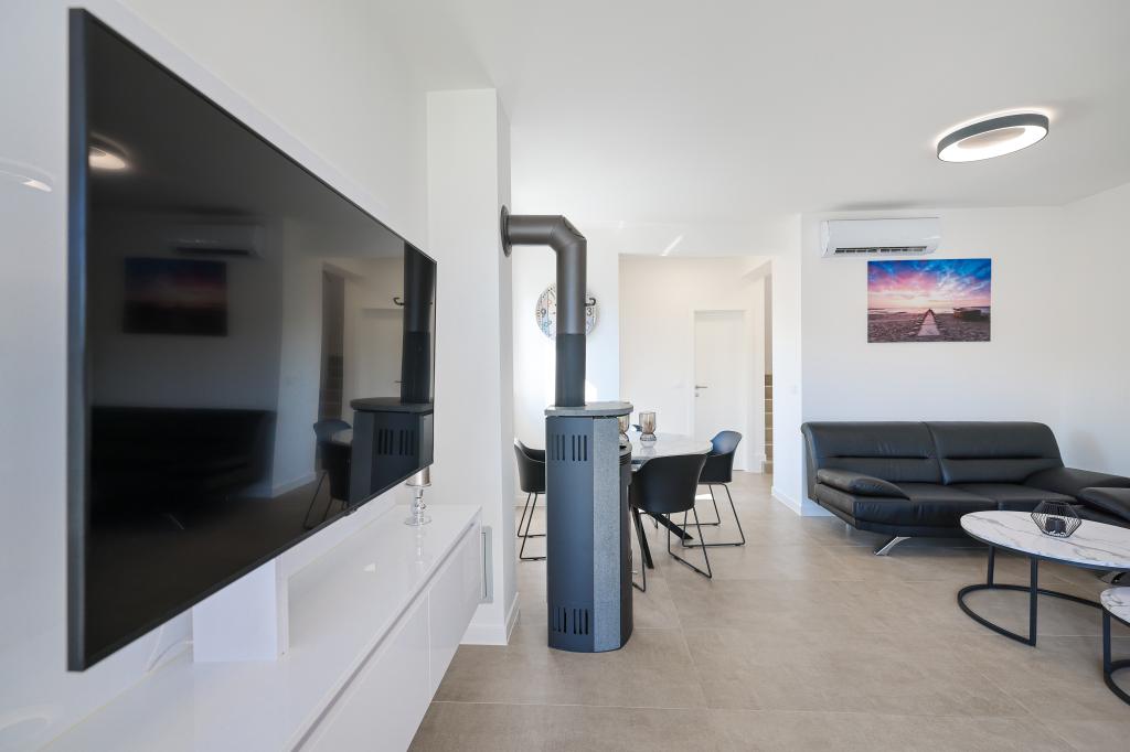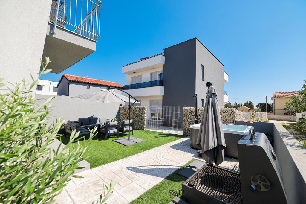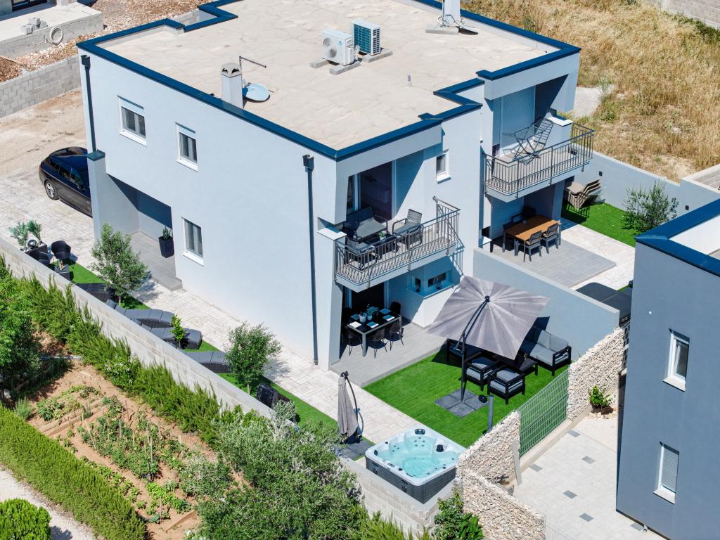Modern and fully furnished three-room apartment in a peaceful and quiet part of the village of Vrsi. The property is located 800 meters from the sea, has 3 bedrooms equipped with air conditioning and TV, two bathrooms, a beautiful terrace with a massage tub, a dining table and sun loungers. The kitchen is fully equipped, and another TV and air conditioner are available in the common area.