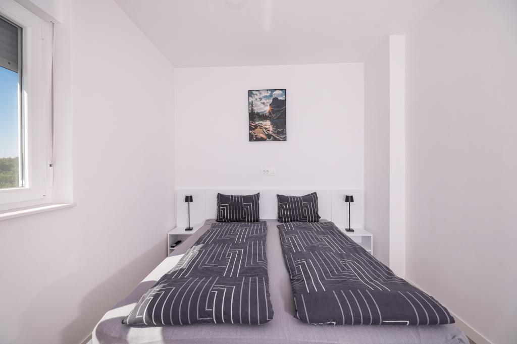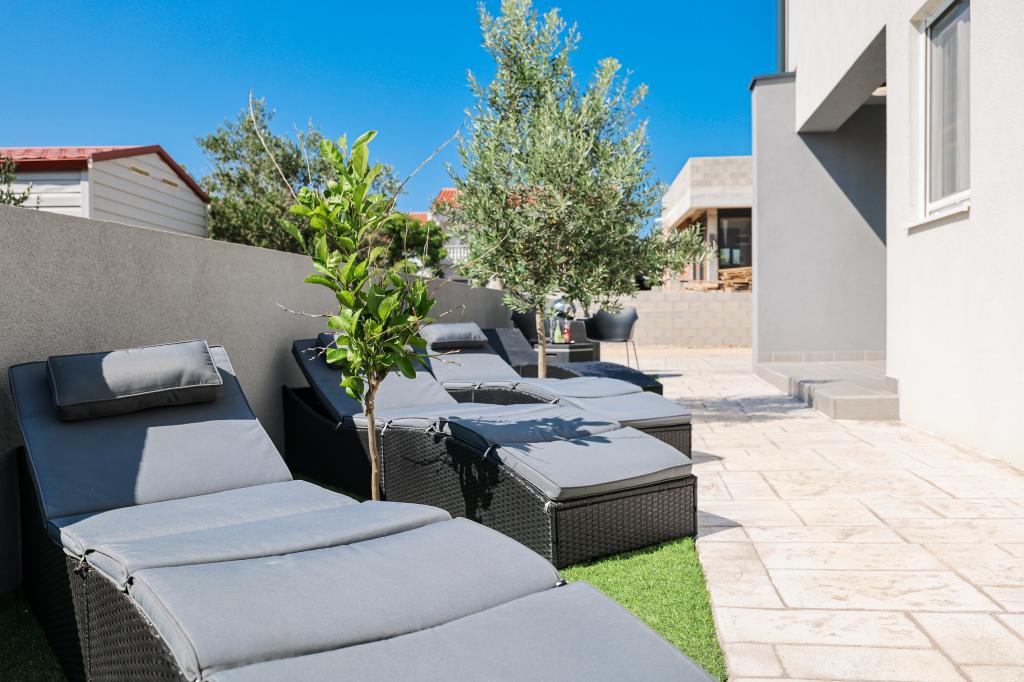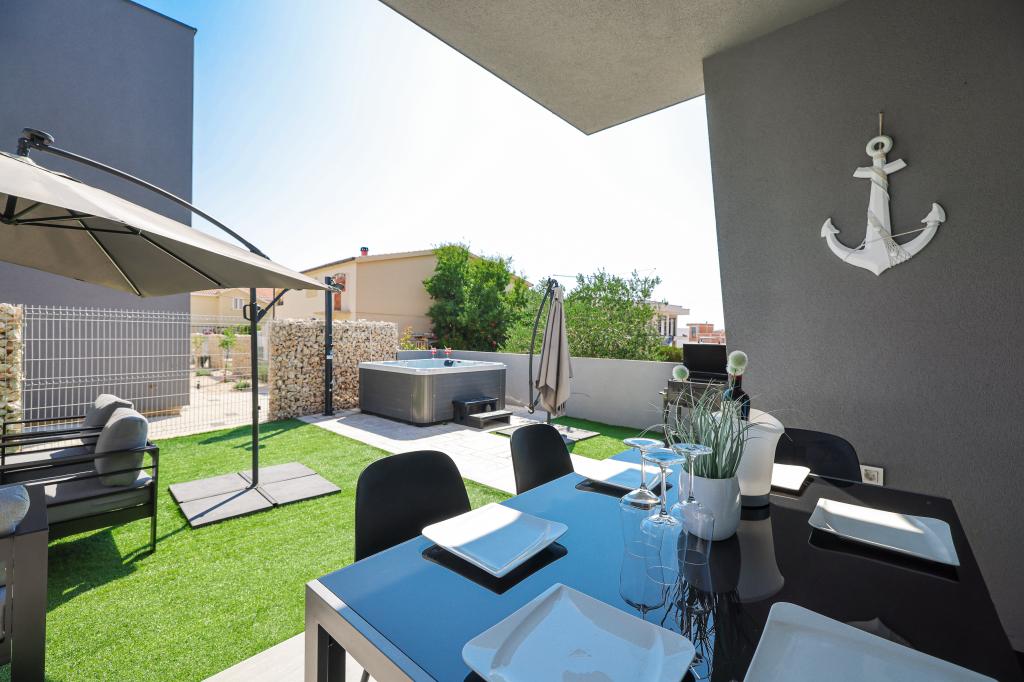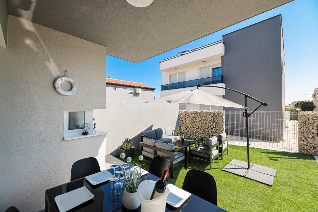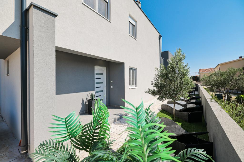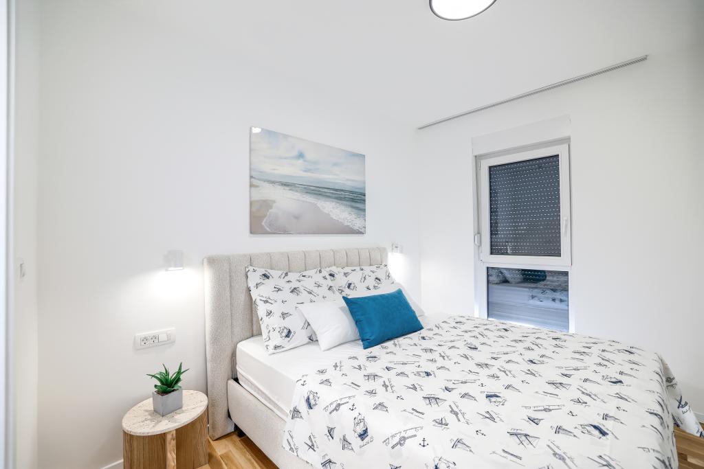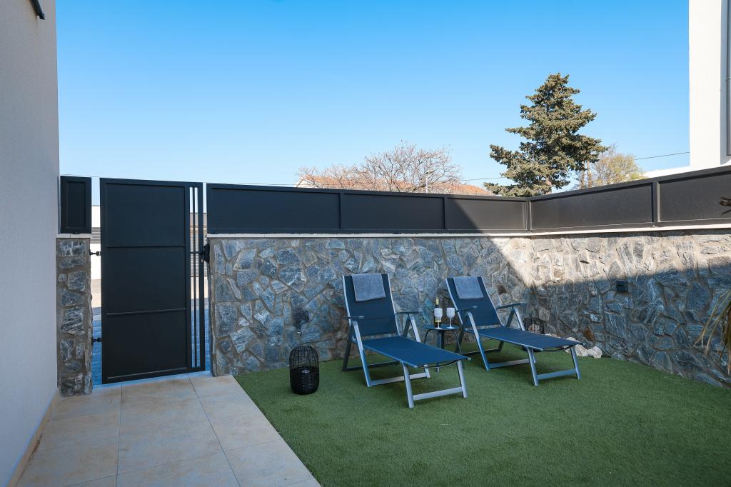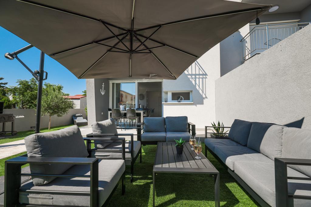Modern and fully furnished three-room apartment in a peaceful and quiet part of the village of Vrsi. The property is located 800 meters from the sea, has 3 bedrooms equipped with air conditioning and TV, two bathrooms, a beautiful terrace with a massage tub, a dining table and sun loungers. The kitchen is fully equipped, and another TV and air conditioner are available in the common area.