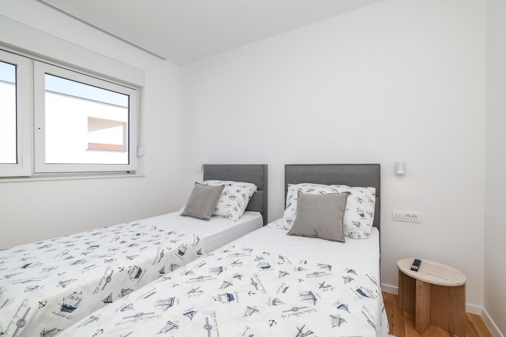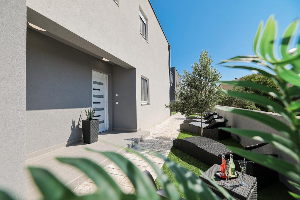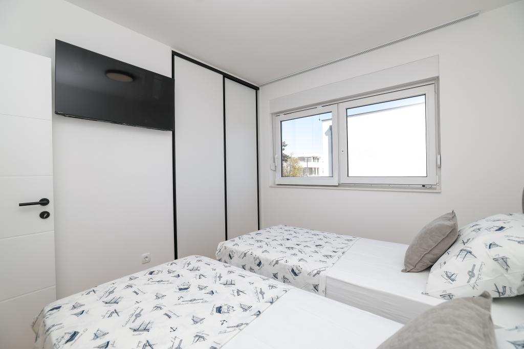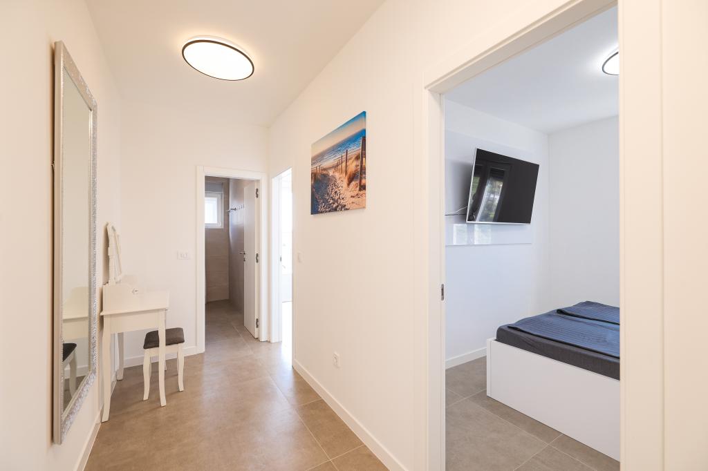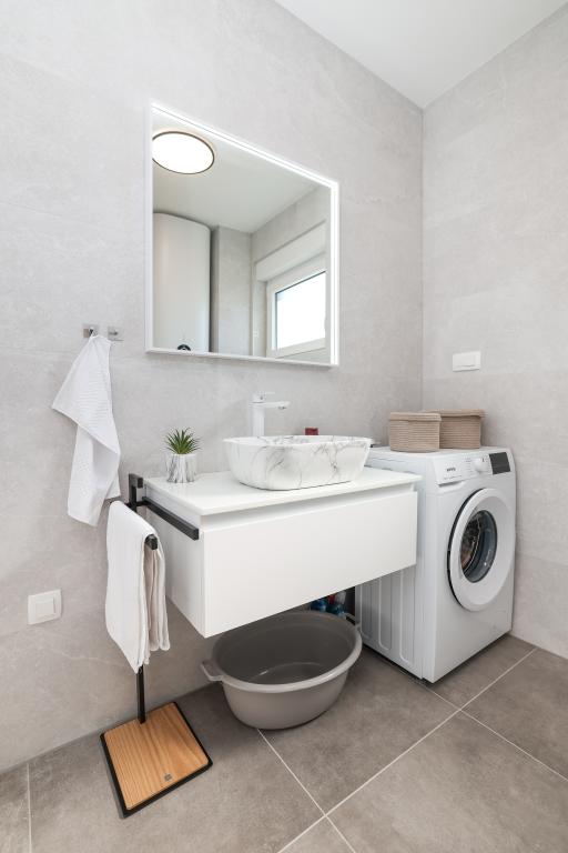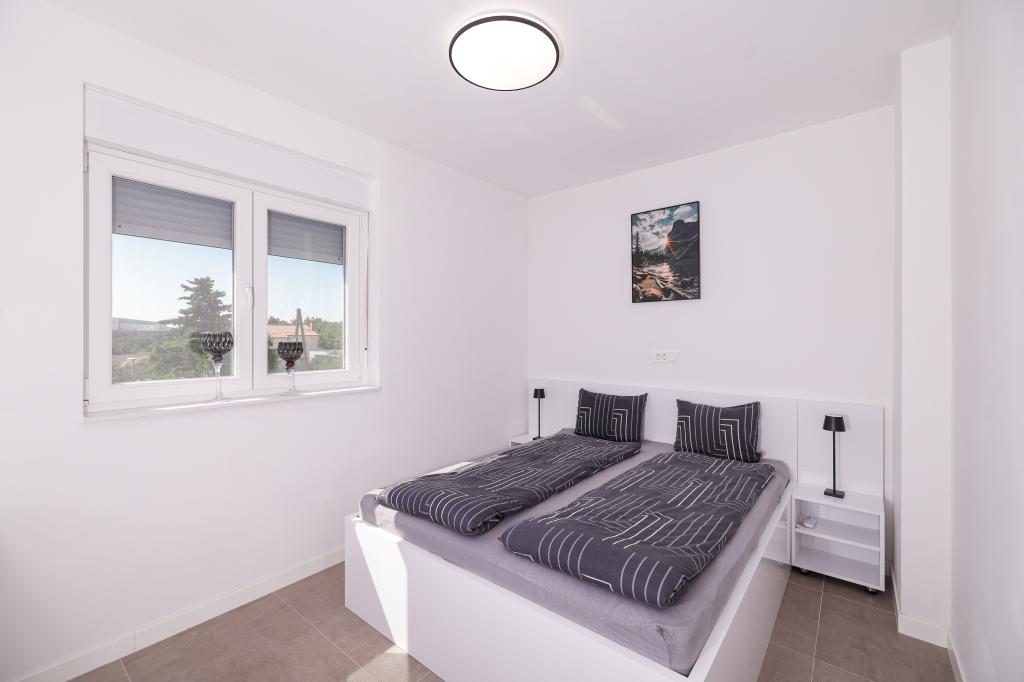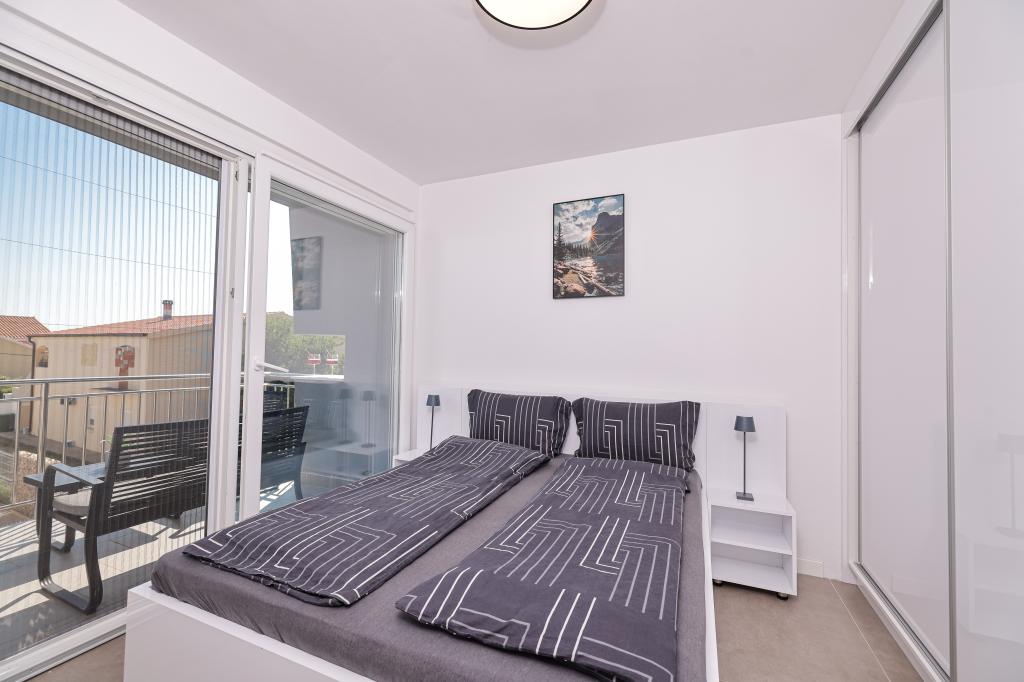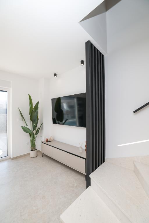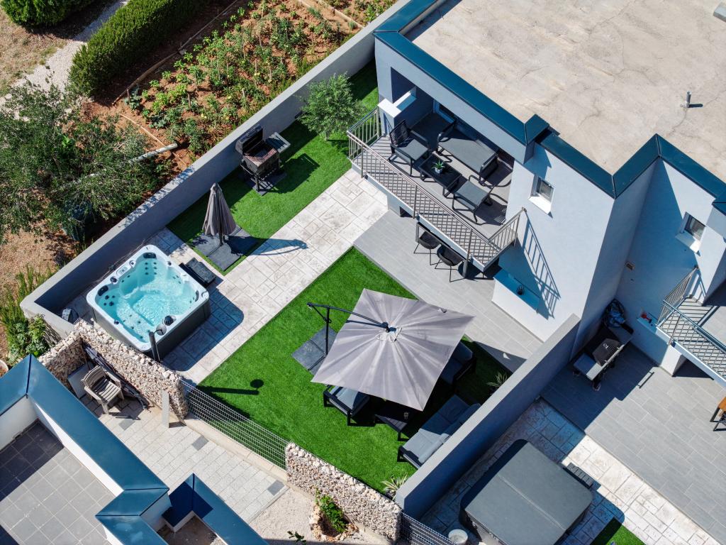 Modern and fully furnished three-room apartment in a peaceful and quiet part of the village of Vrsi. The property is located 800 meters from the sea, has 3 bedrooms equipped with air conditioning and TV, two bathrooms, a beautiful terrace with a massage tub, a dining table and sun loungers. The kitchen is fully equipped, and another TV and air conditioner are available in the common area.