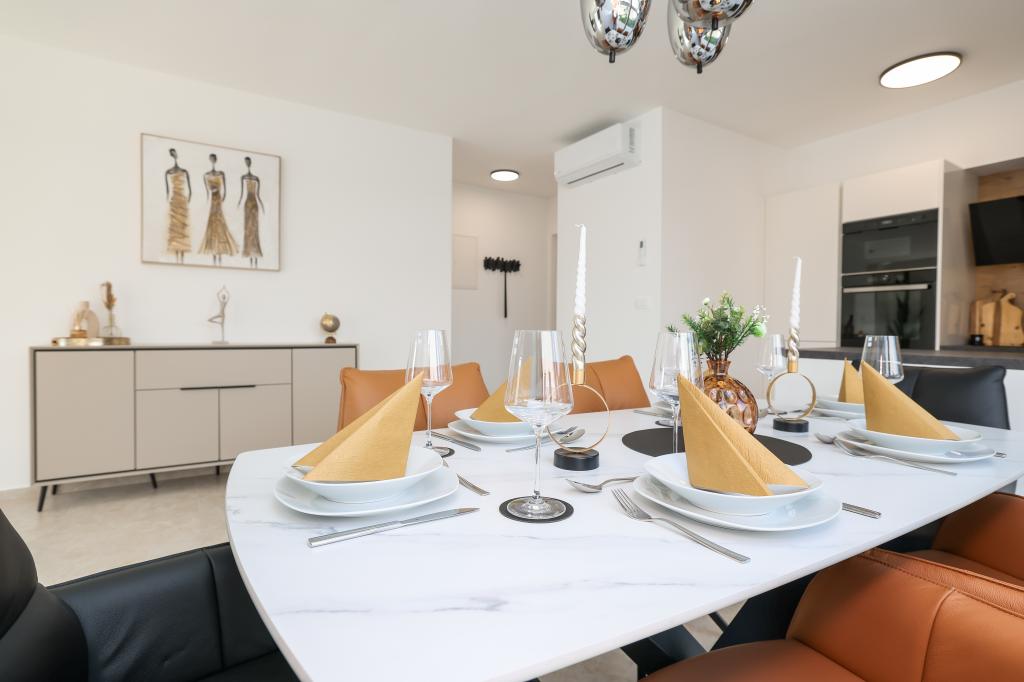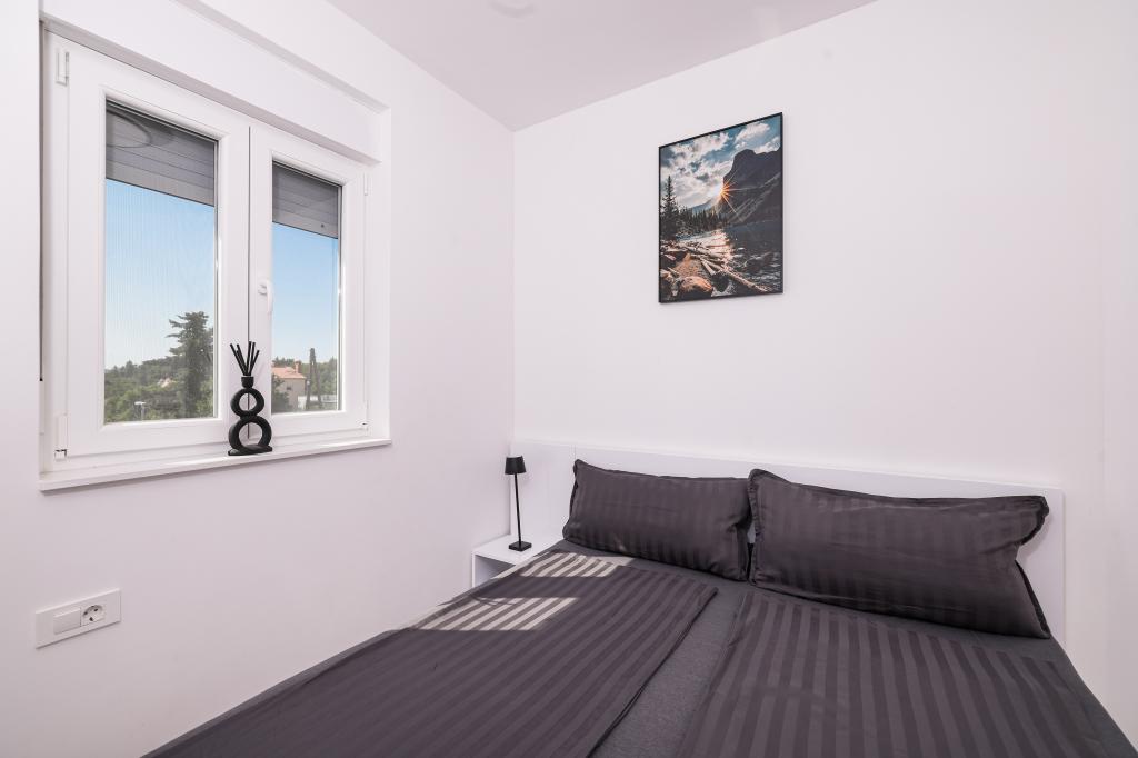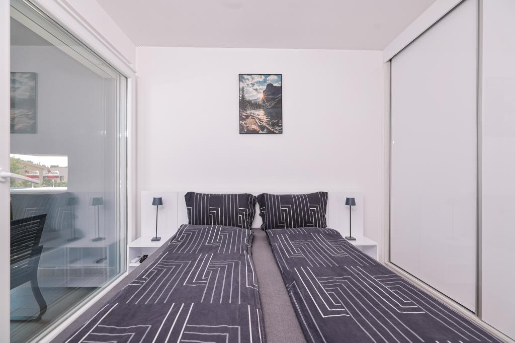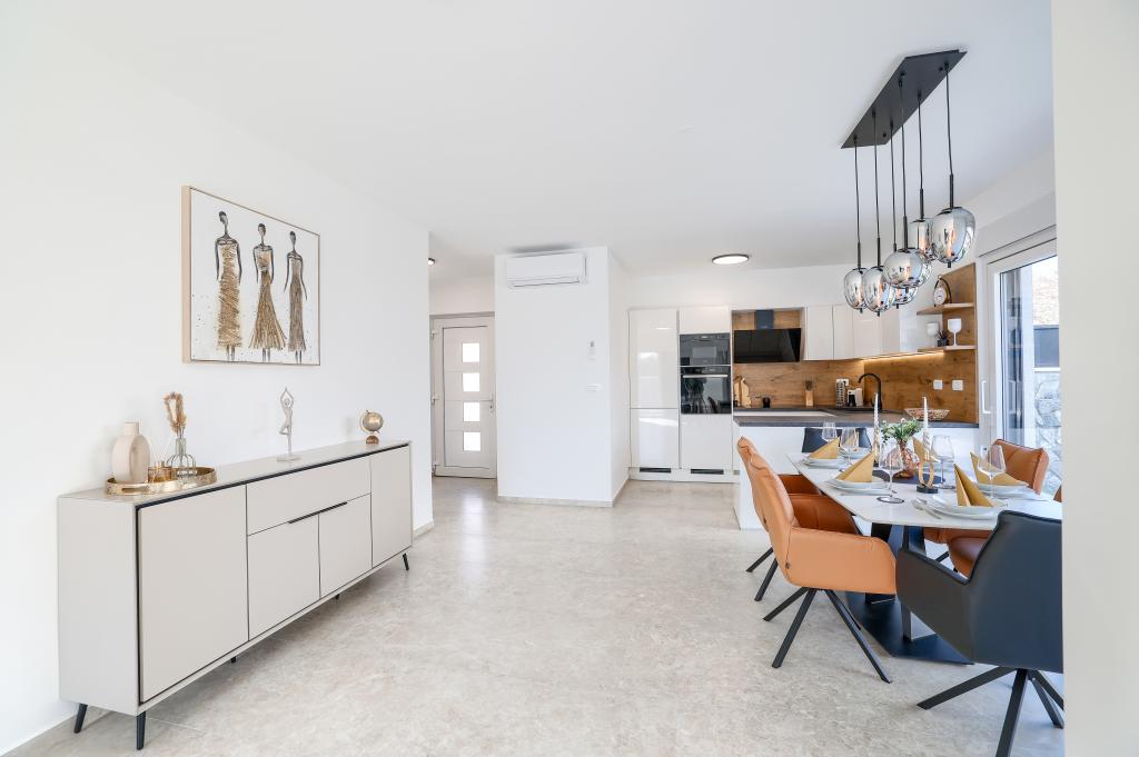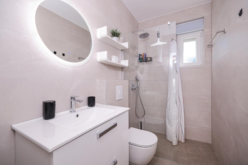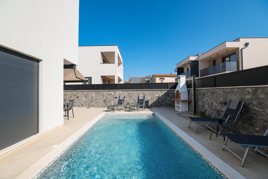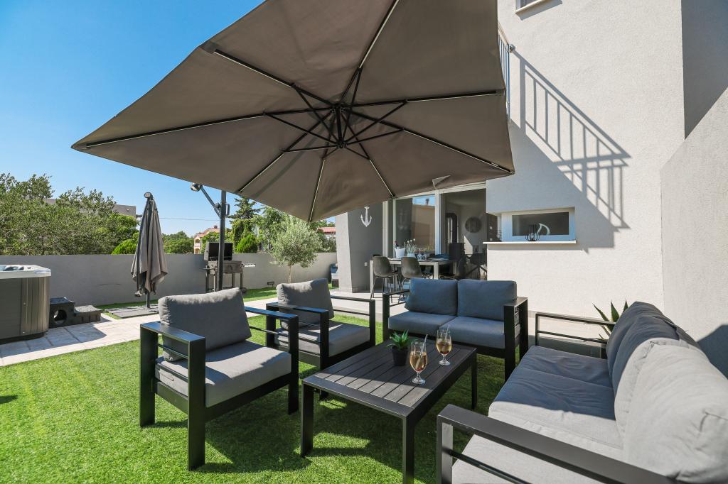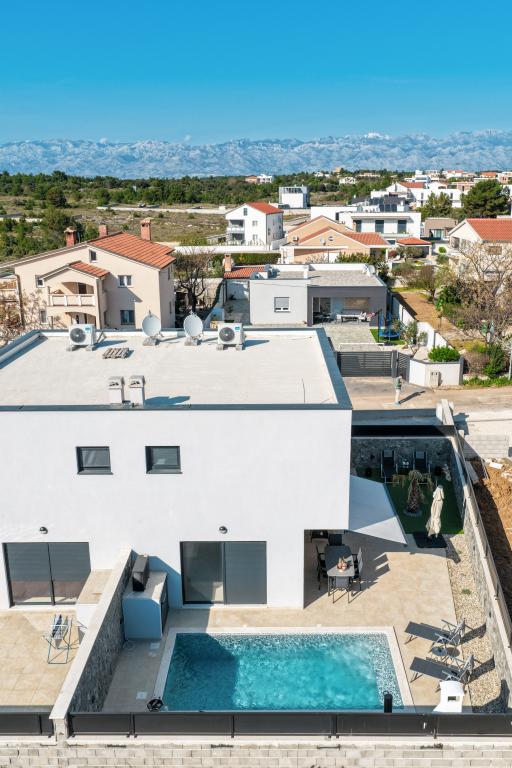 Modern and fully furnished three-room apartment in a peaceful and quiet part of the village of Vrsi. The property is located 800 meters from the sea, has 3 bedrooms equipped with air conditioning and TV, two bathrooms, a beautiful terrace with a massage tub, a dining table and sun loungers. The kitchen is fully equipped, and another TV and air conditioner are available in the common area.