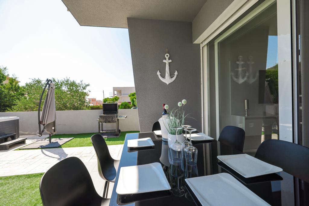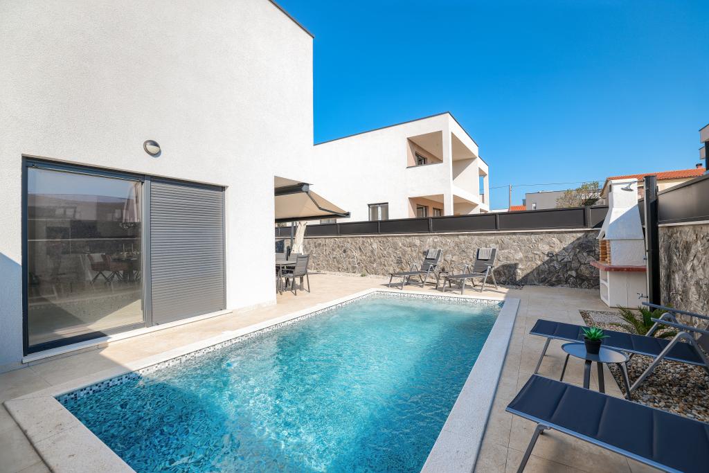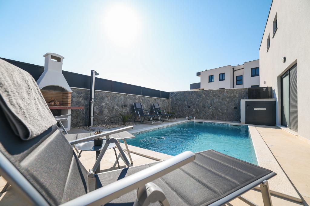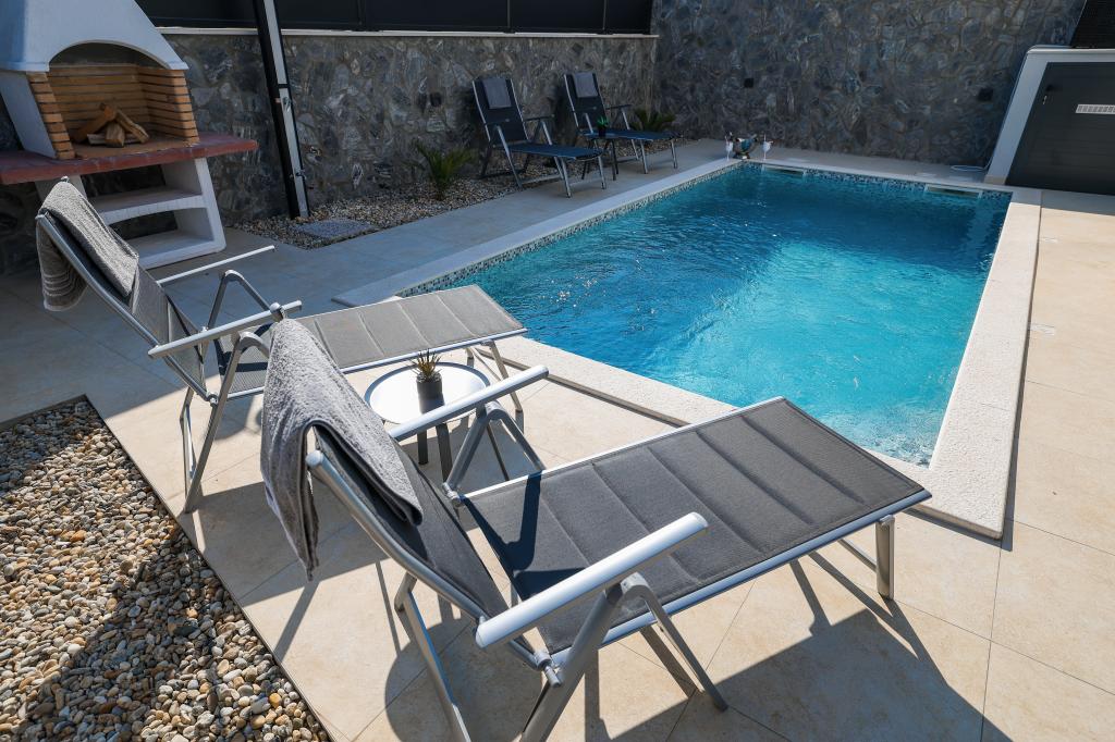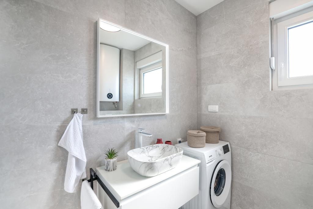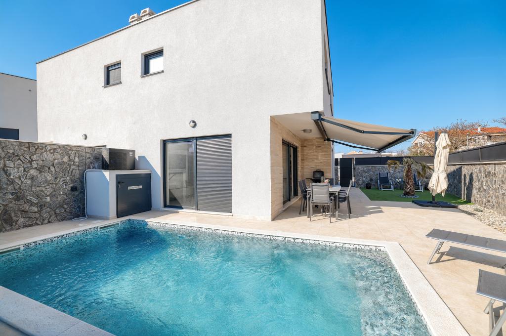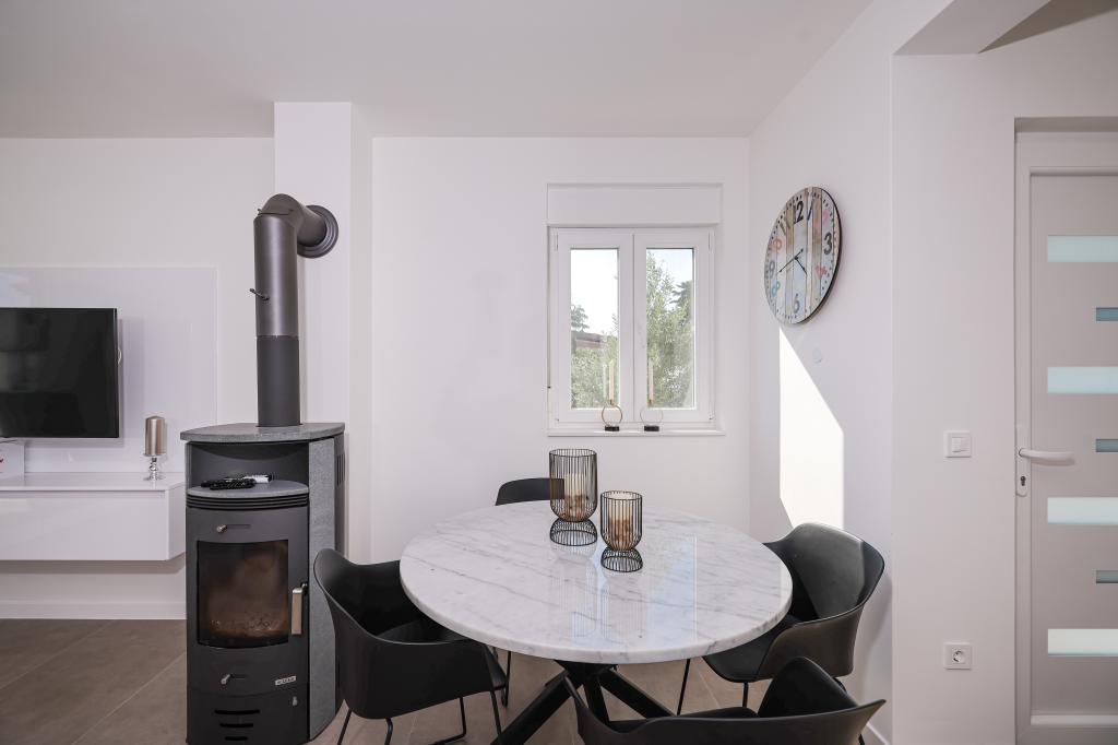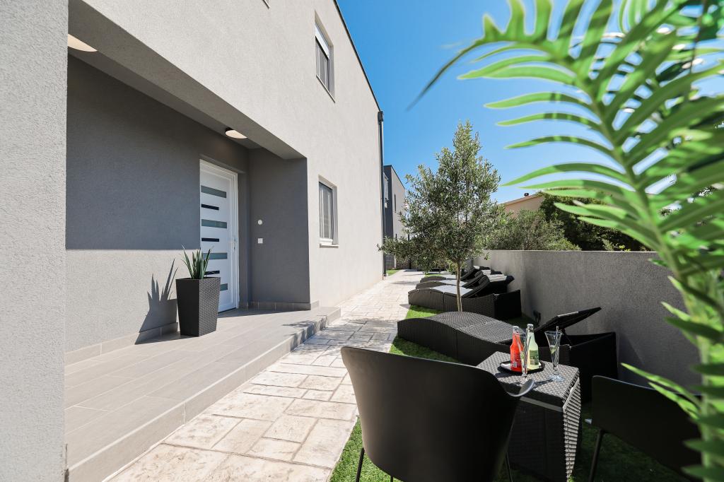 Modern and fully furnished three-room apartment in a peaceful and quiet part of the village of Vrsi. The property is located 800 meters from the sea, has 3 bedrooms equipped with air conditioning and TV, two bathrooms, a beautiful terrace with a massage tub, a dining table and sun loungers. The kitchen is fully equipped, and another TV and air conditioner are available in the common area.