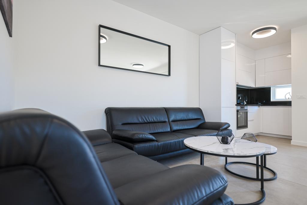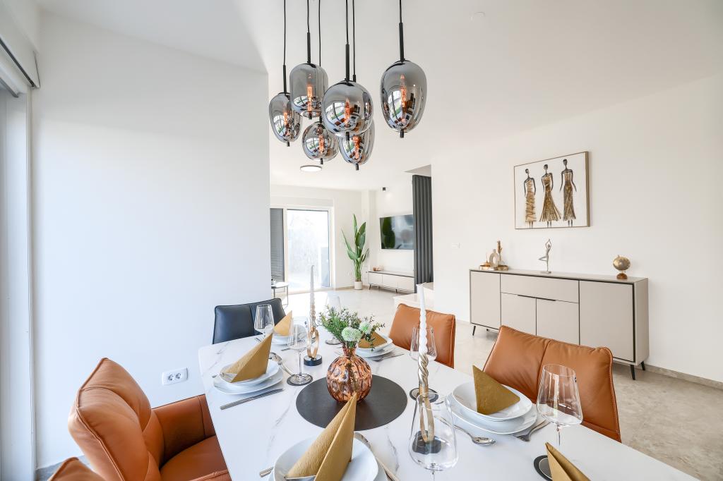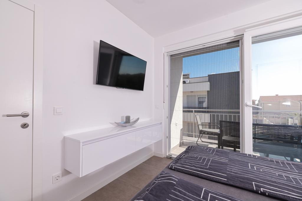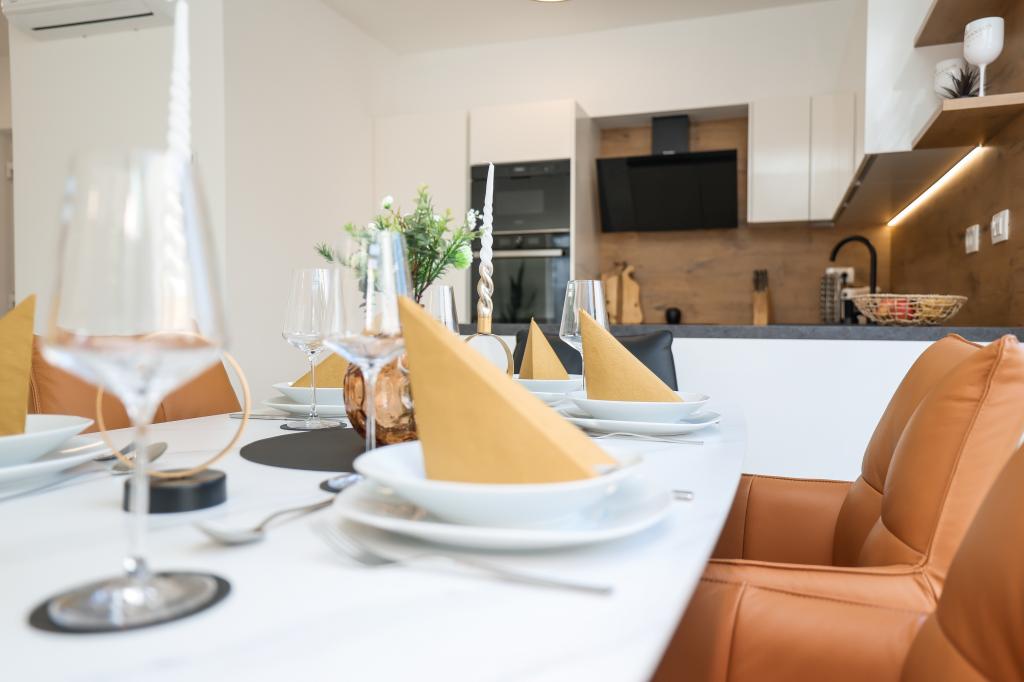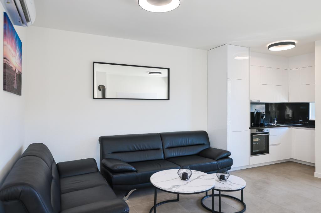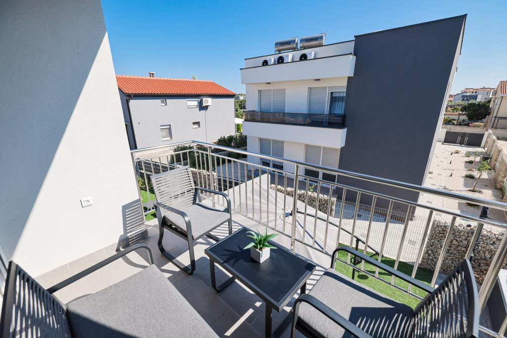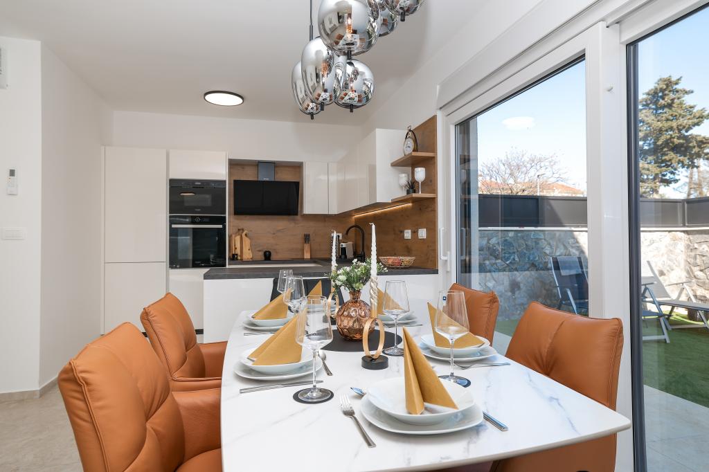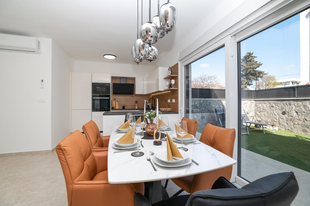 Modern and fully furnished three-room apartment in a peaceful and quiet part of the village of Vrsi. The property is located 800 meters from the sea, has 3 bedrooms equipped with air conditioning and TV, two bathrooms, a beautiful terrace with a massage tub, a dining table and sun loungers. The kitchen is fully equipped, and another TV and air conditioner are available in the common area.