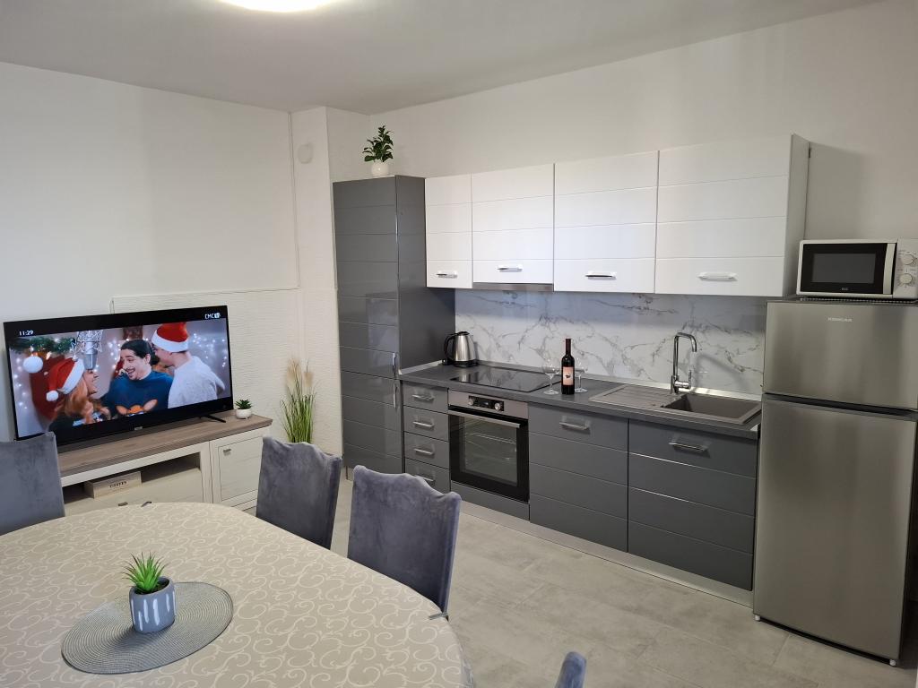 Apartments Tomislav is located in the town of Vrsi in a quiet and peaceful area, ideal for vacation, with a wonderful view of the sea, air-conditioned apartments are 130m2, 100m2, and 90m2, spacious and large, with large terraces for relaxing gatherings, come and enjoy your vacation.